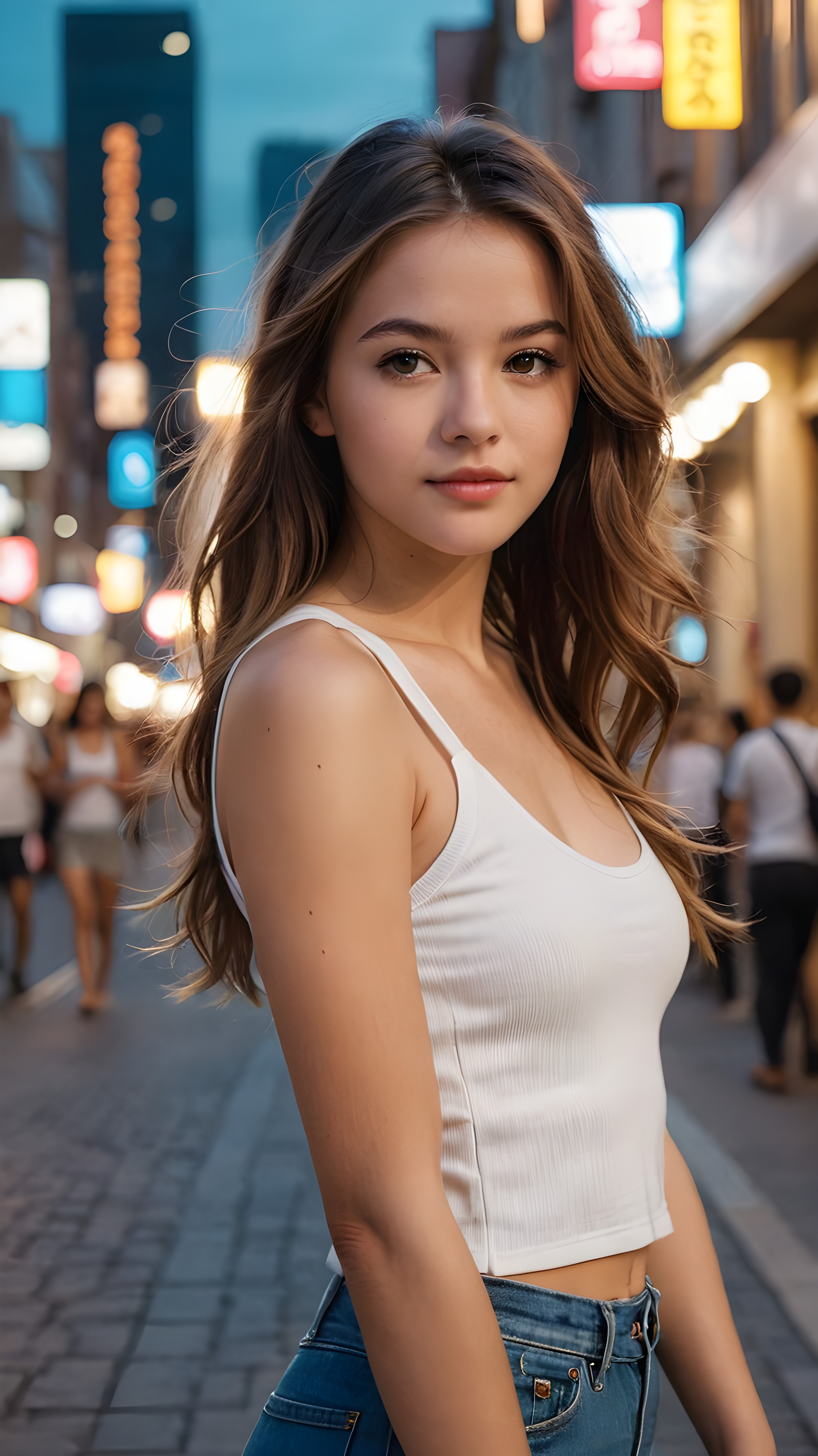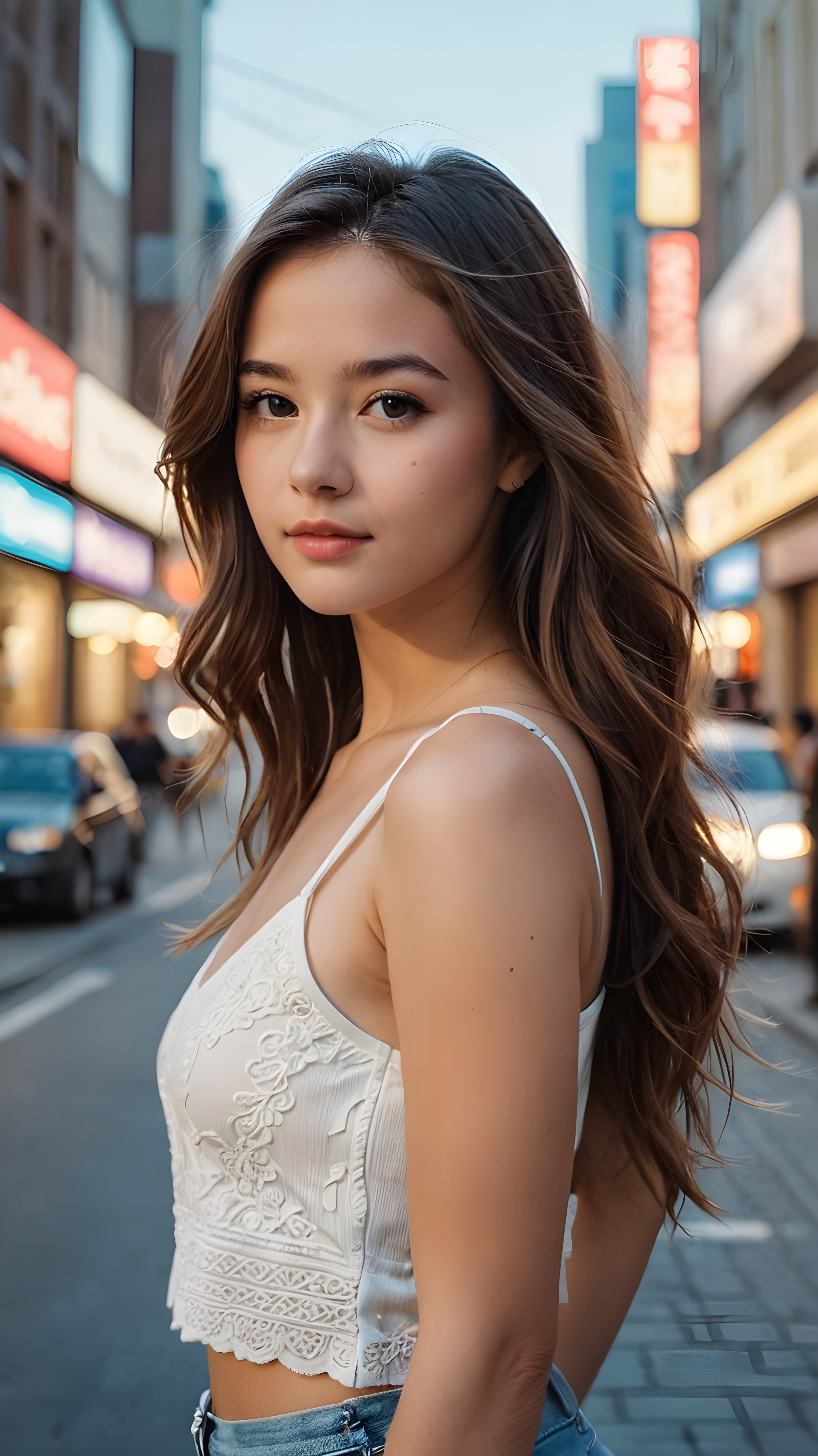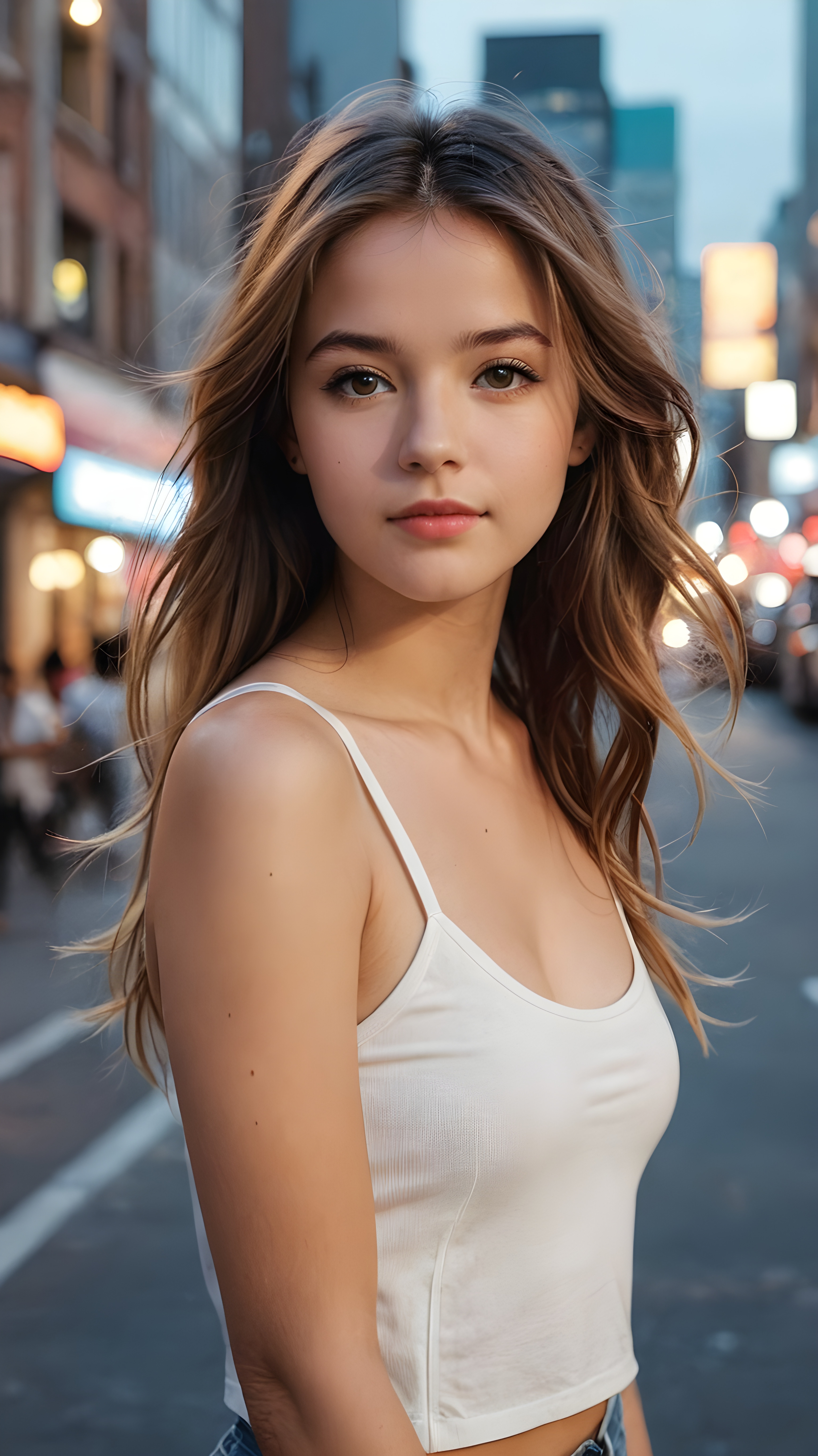 detailed and realistic portrait from a trendy young teen girl with soft long hair, wears a white super fine cropped tank top that support her body, she has a perfect curved body, immersed in the warm ambiance sharp details bring her stylish features to life, perfectly embodying the essence of urban sophistication, the composition contemplates the interplay of modern culture and personal expression, inviting viewers to revel in the captivating atmosphere of contemporary city