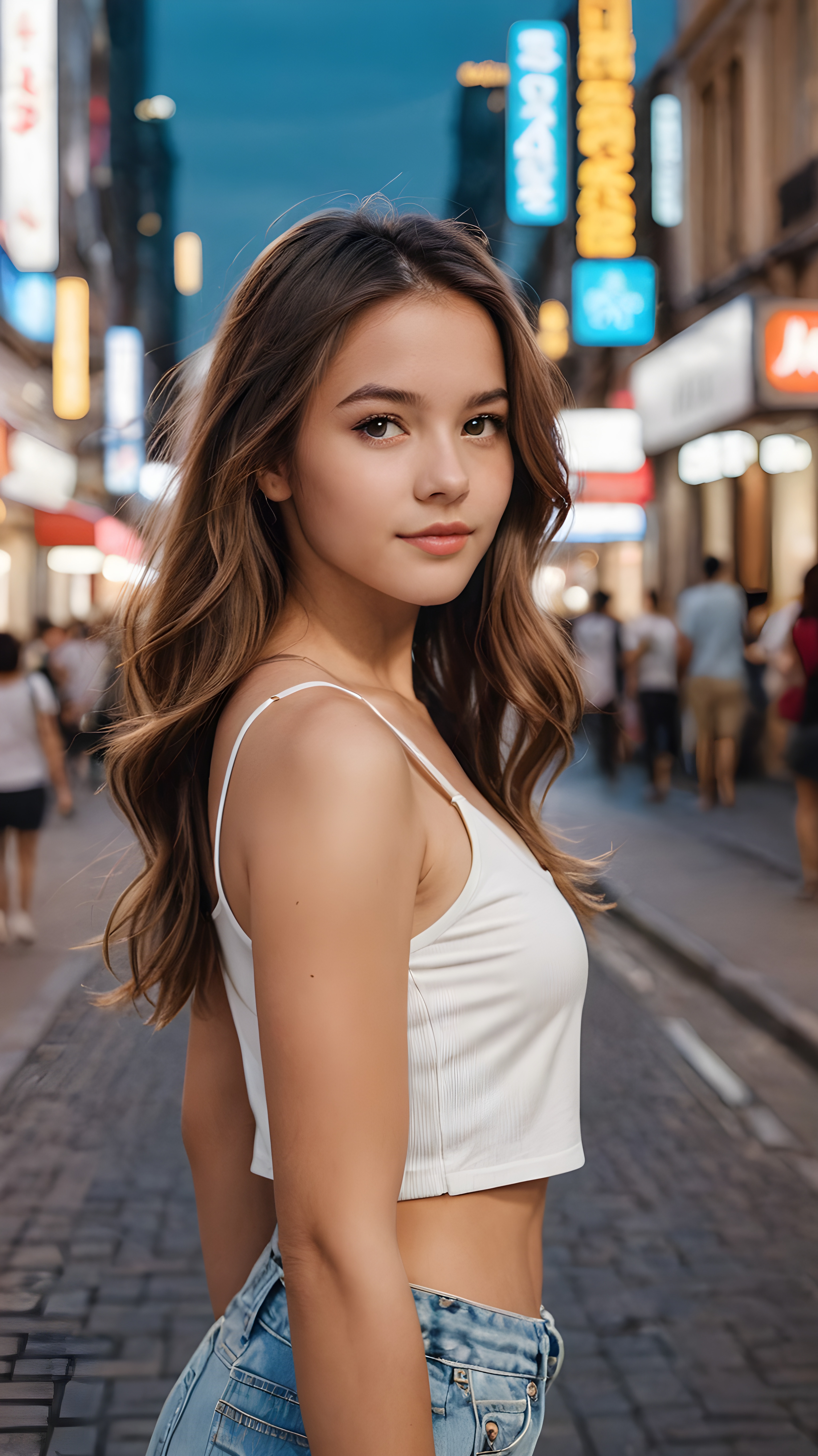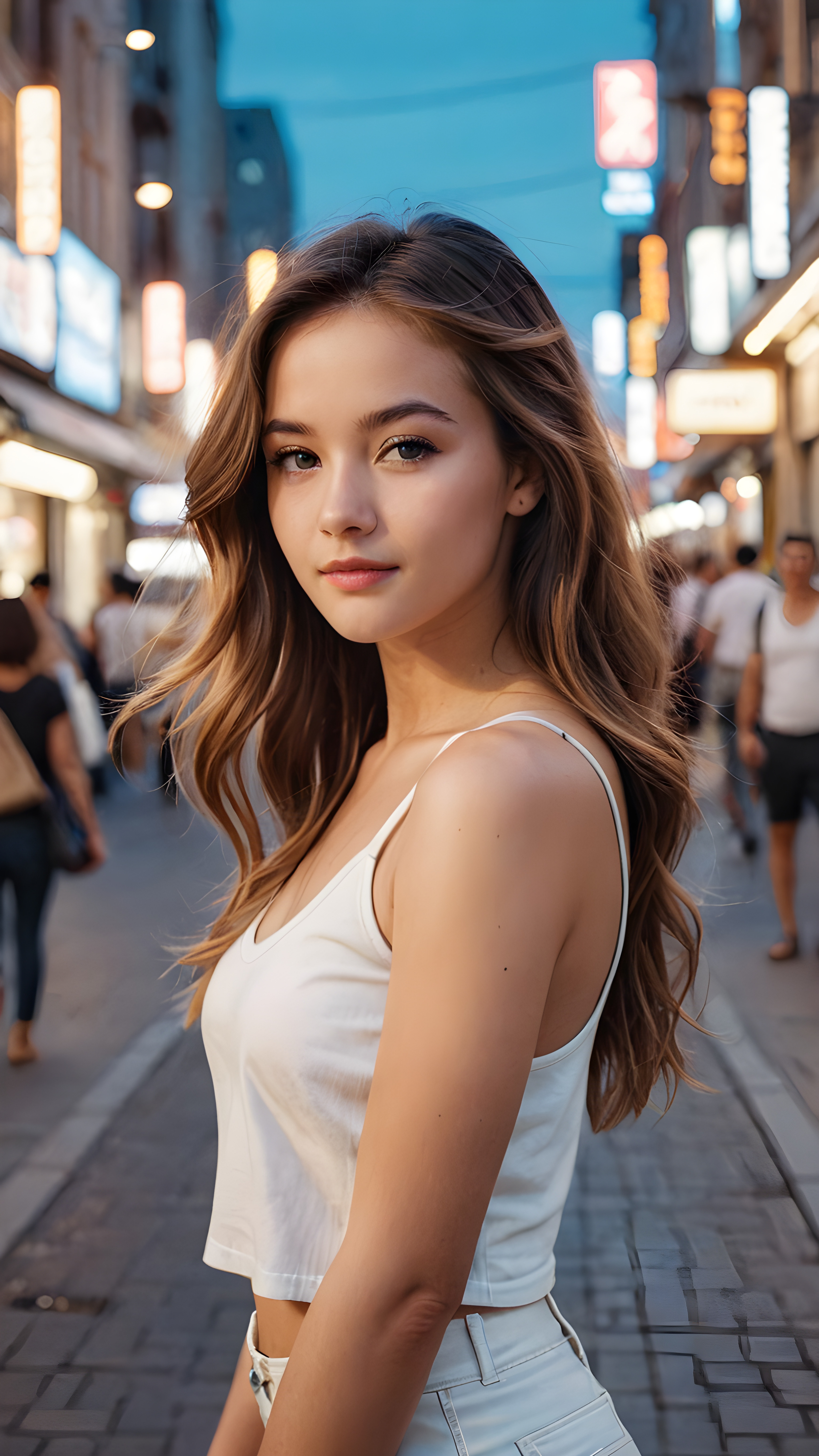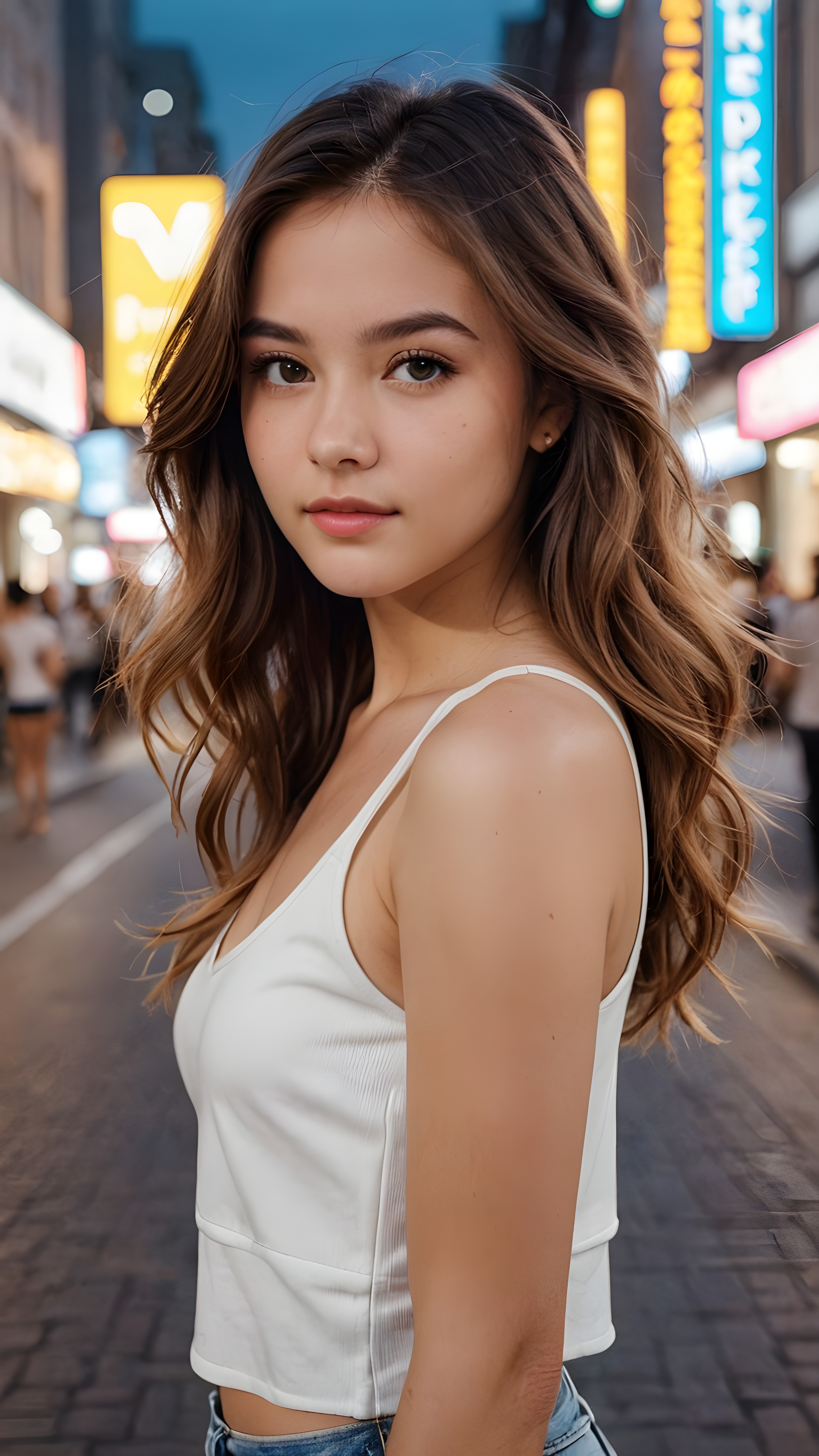 detailed and realistic portrait from a trendy young teen girl with soft long hair, wears a white super fine cropped tank top that support her body, she has a perfect curved body, immersed in the warm ambiance sharp details bring her stylish features to life, perfectly embodying the essence of urban sophistication, the composition contemplates the interplay of modern culture and personal expression, inviting viewers to revel in the captivating atmosphere of contemporary city