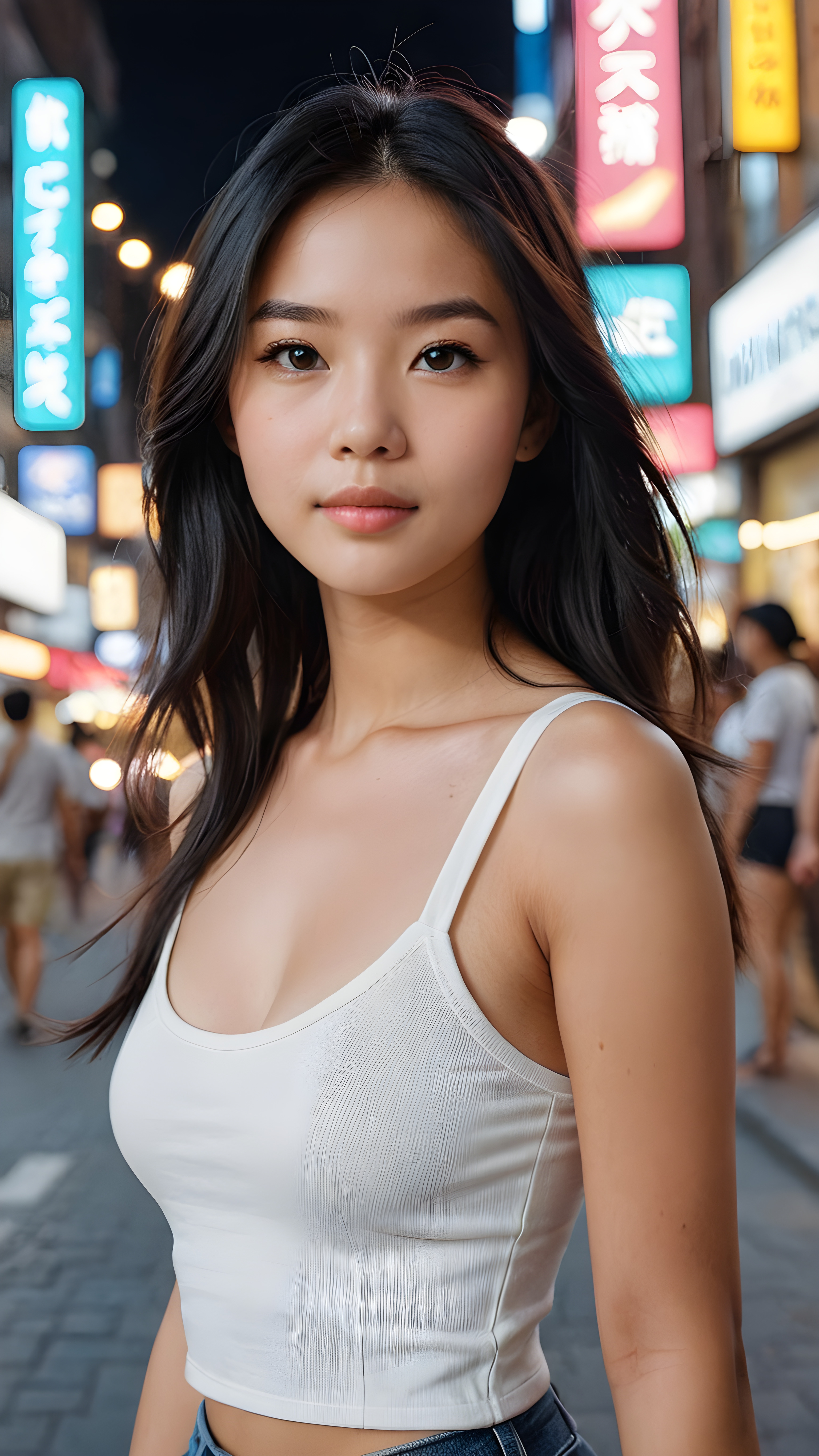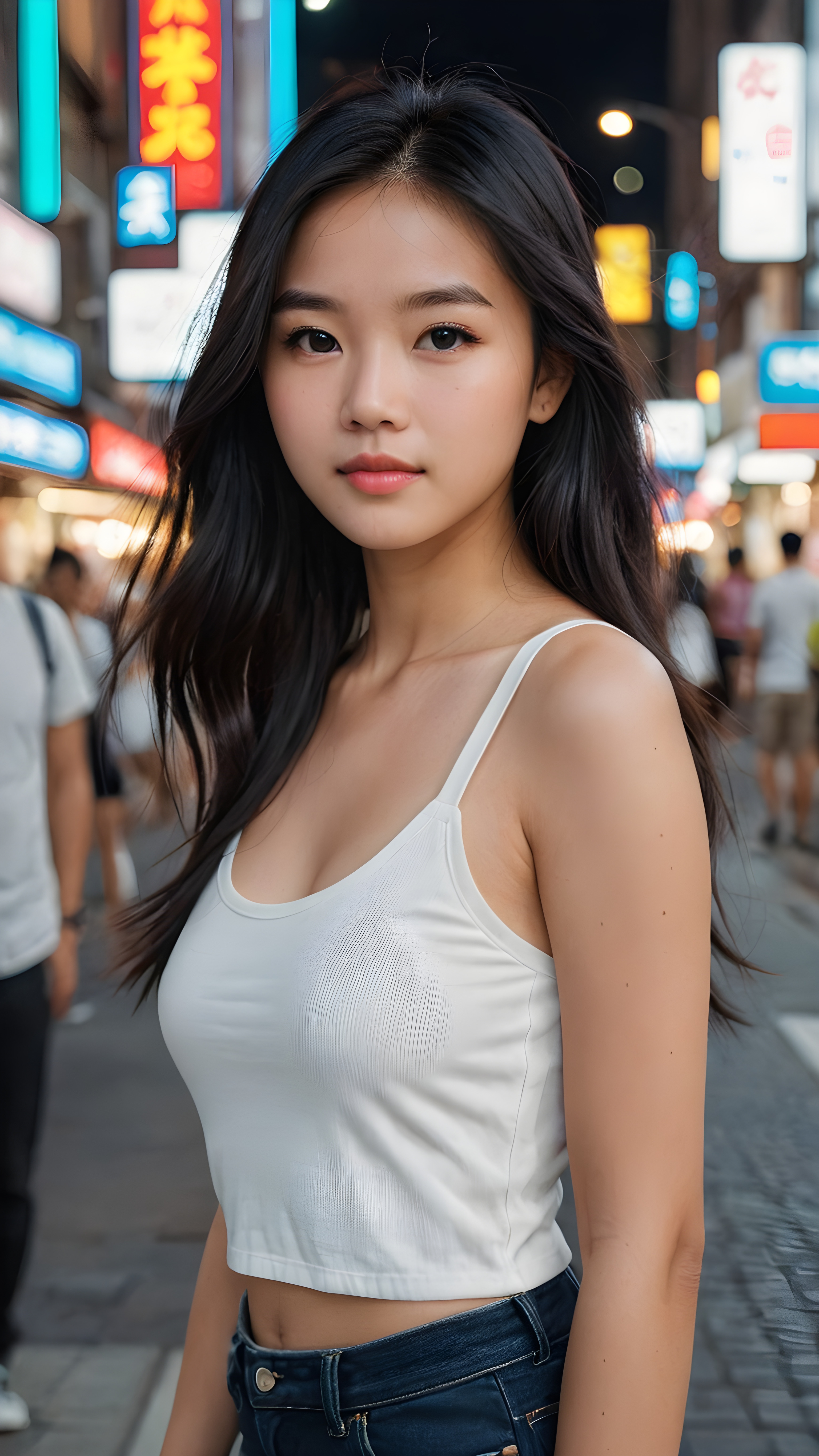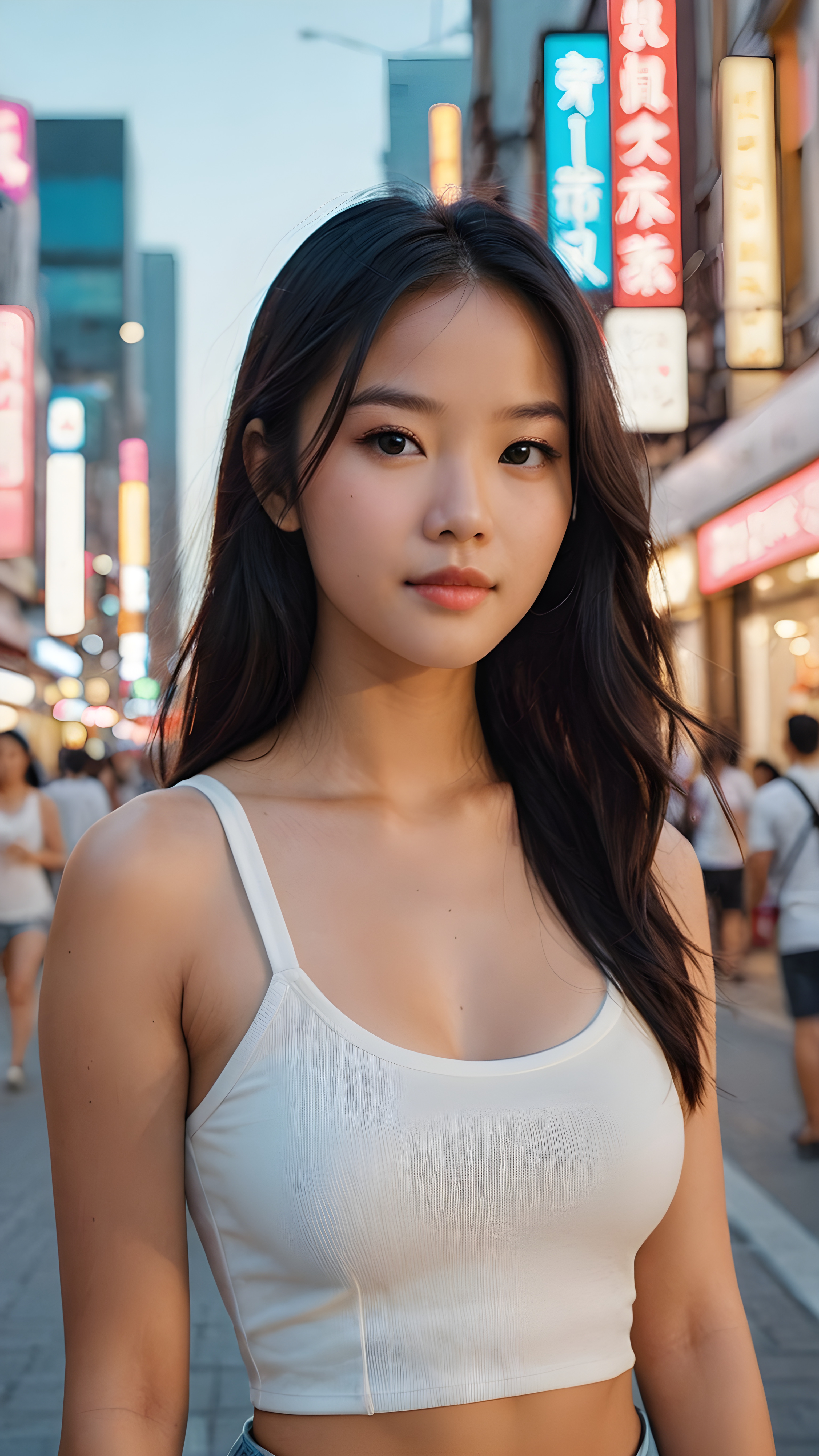 detailed and realistic portrait from a trendy young Asian teen girl with soft long straight black hair, wears a white super fine cropped tank top that support her body, she has a perfect curved body, immersed in the warm ambiance sharp details bring her stylish features to life, perfectly embodying the essence of urban sophistication, the composition contemplates the interplay of modern culture and personal expression, inviting viewers to revel in the captivating atmosphere of contemporary city
