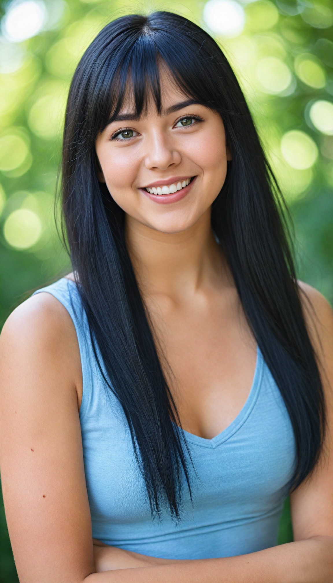 a portrait of a young chubby girl with (silky smooth, straight long dark blue obsidian soft detailed hair, bangs). Her very long hair falls over her shoulders and covers her upper body. She has sparkling, light blue eyes and a charming smile white teeth, full kissable lips, (she wears a tight, form-fitting short violet empty tank top with deep v-neck), all against a sunny green backdrop