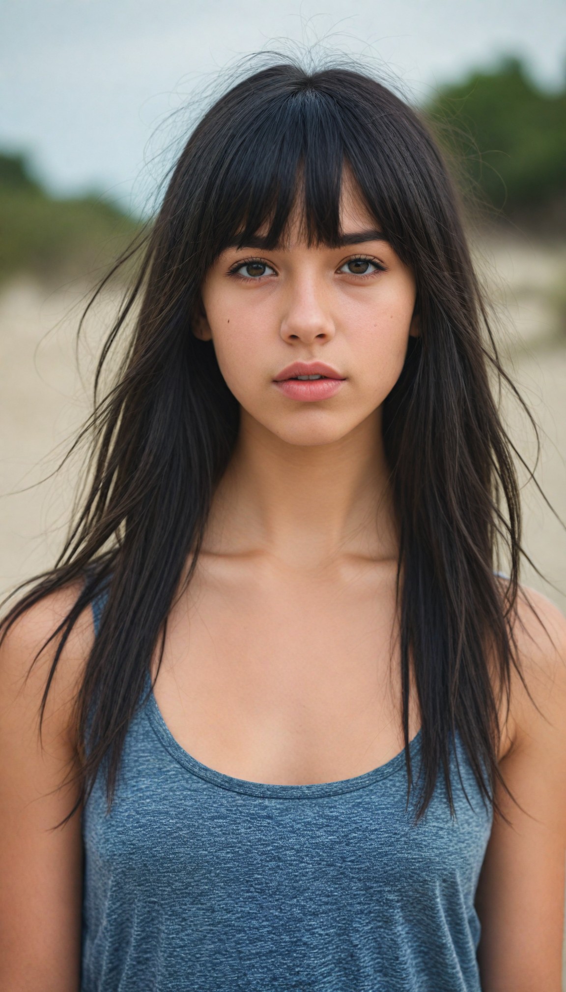 a realistic, detailed face, (super cute) (petite), (emo teen girl) with long, flowing (dark grey super soft hair, bangs), (dark crop tank top), (vividly drawn full kissable lips), all against a backdrop of a (serene, sandy beach)