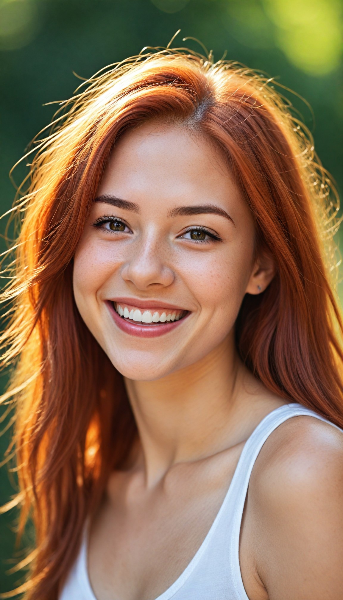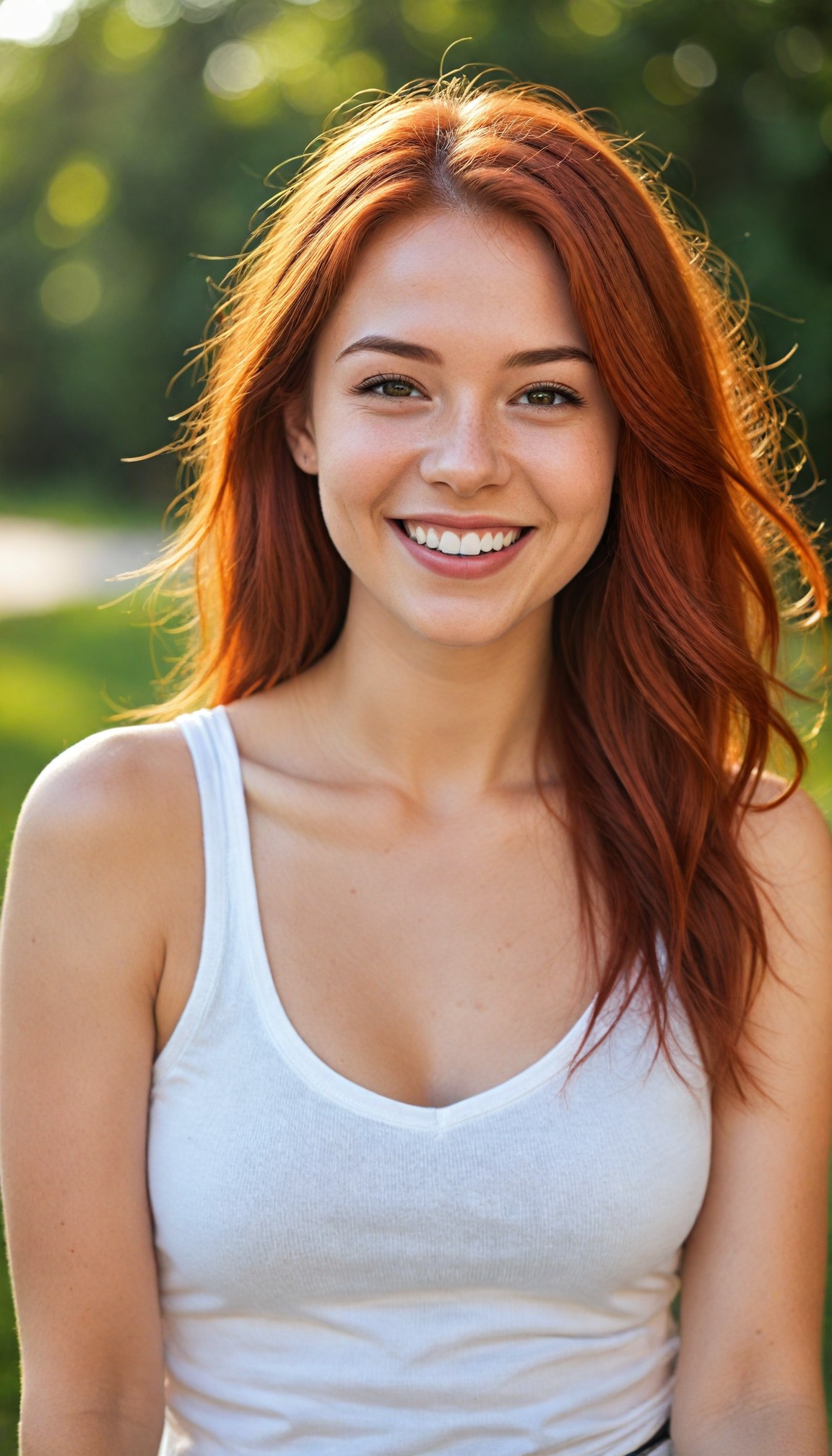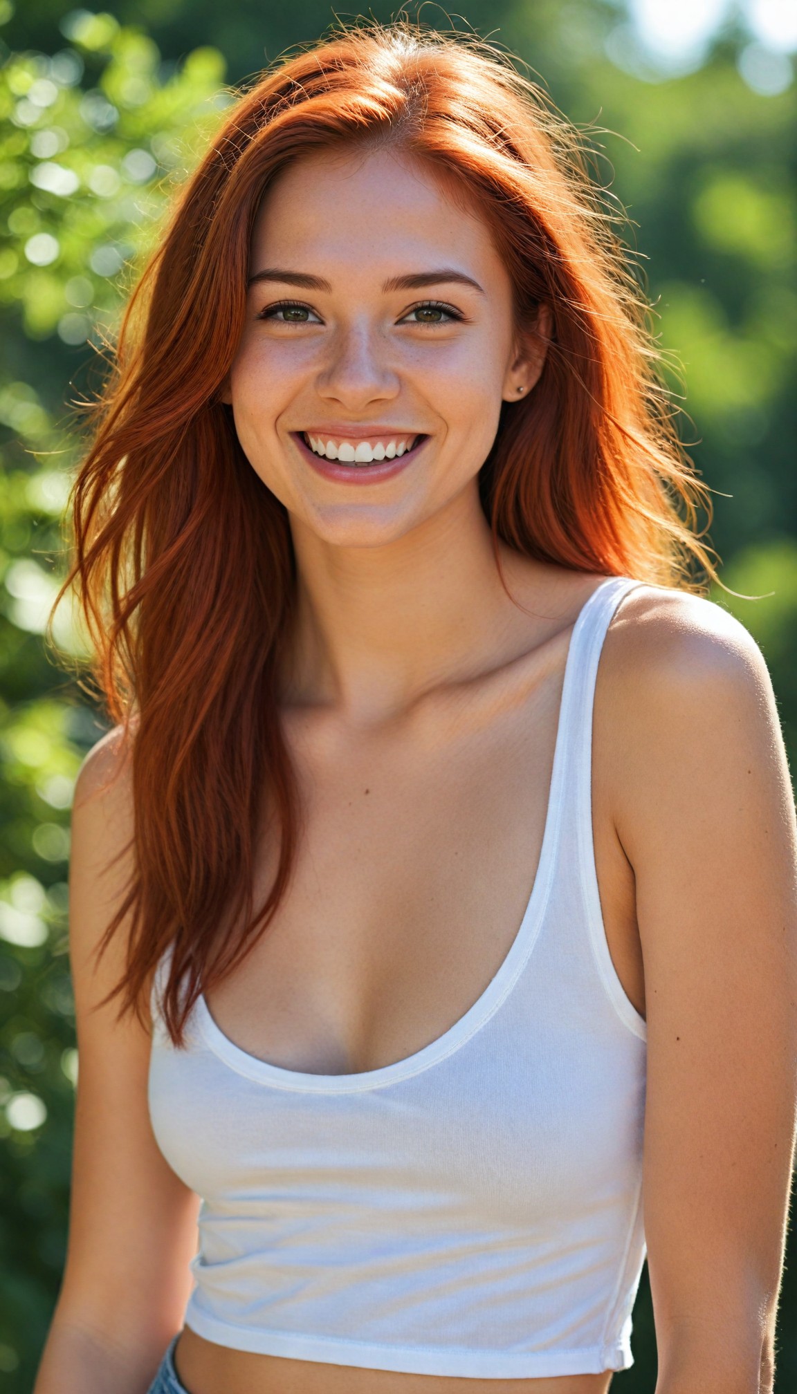 a (realistic and detailed photo), capturing a (cute, attractive, gorgeous, stunning teen girl) with a super short, tight, deep v-neck, plain cropped tank top, (curved body), (long straight jet soft red hair), warm smile, sunny backdrop, she smile very happy, white teeth