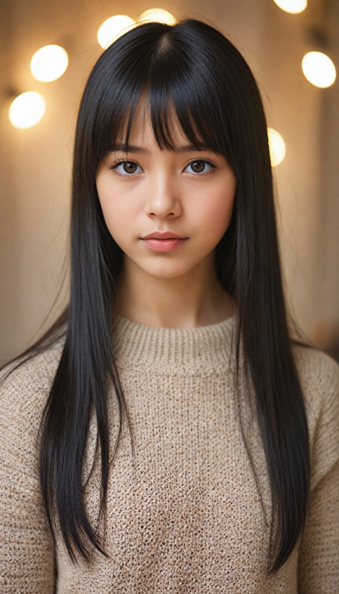 create a portrait of a cute, beautiful, sweet, kind, adorable, breathtaking, delicate, pretty, graceful, elegant, very young girl with long, straight, silky black hair, bangs, light brown eyes, full lips, wearing a warm sweater. (The background is slightly blurred)