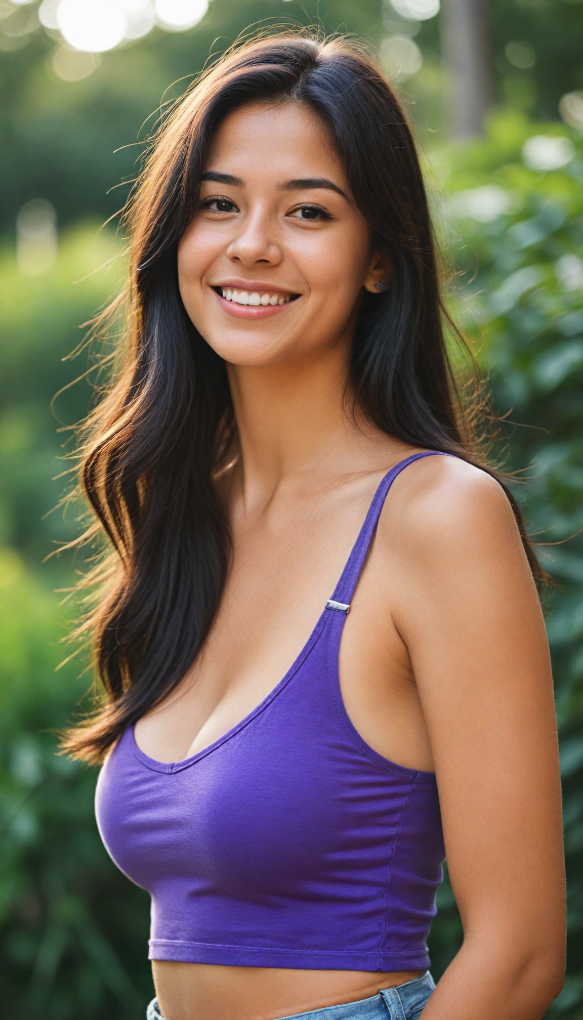 a (realistic and detailed photo), capturing a (cute, attractive, gorgeous, stunning well busty teen girl) with a super short, tight, deep v-neck, plain violet cropped tank top made of fine detailed cotton, (curved body), (very long straight jet soft dark hair), warm smile, sunny backdrop
