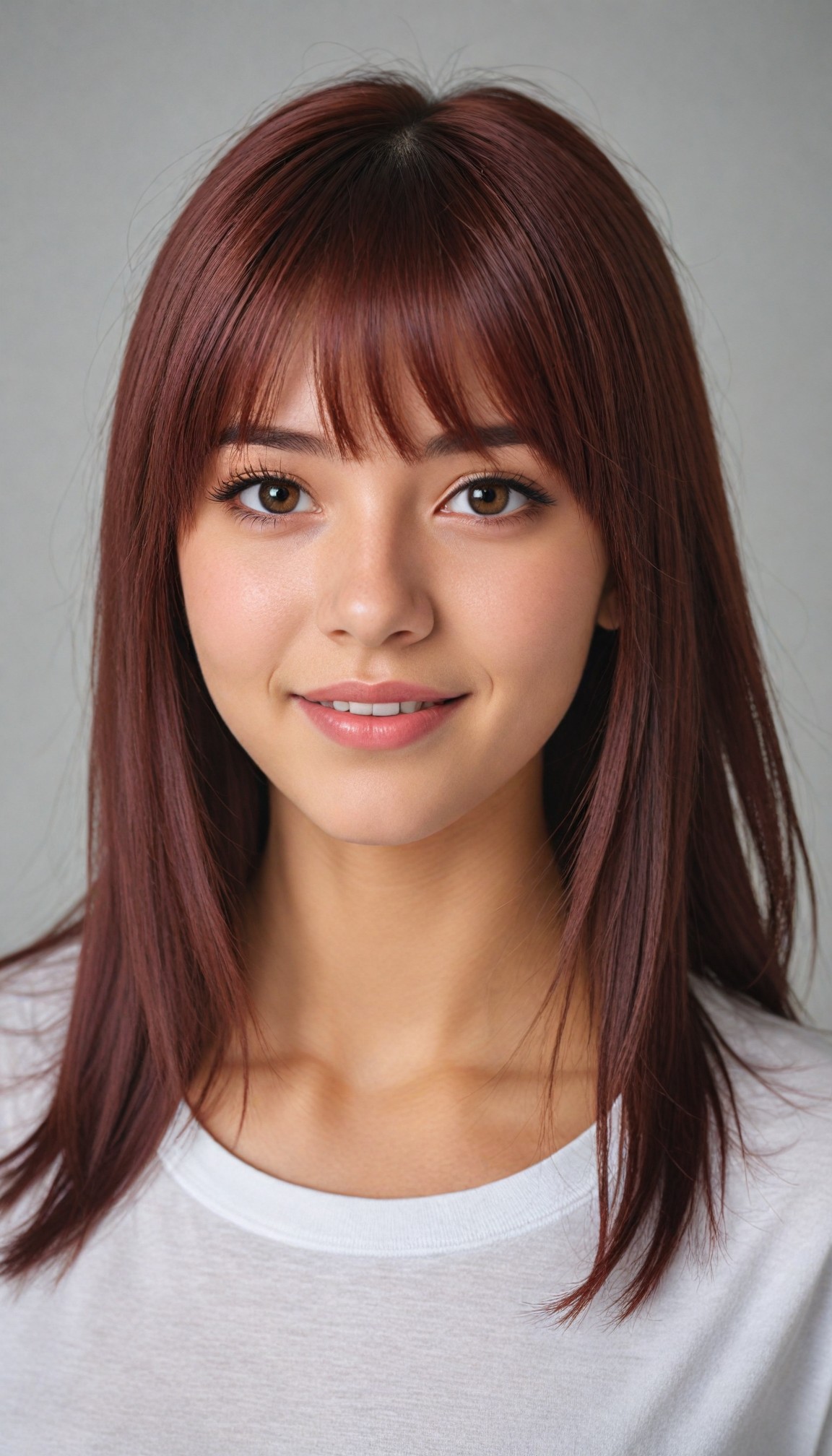 cute teen girl, detailed straight hair, styled bangs, white tight short t-shirt, perfect curved body, ultra realistic face, realistic amber eyes, detailed maroon straight hair, a stunning photo with beautiful saturation, ultra high resolution, deep shadow, (best quality, masterpiece), highly detailed, looking at viewer, warm smile, ultra realistic, side shot, white background, full body shot