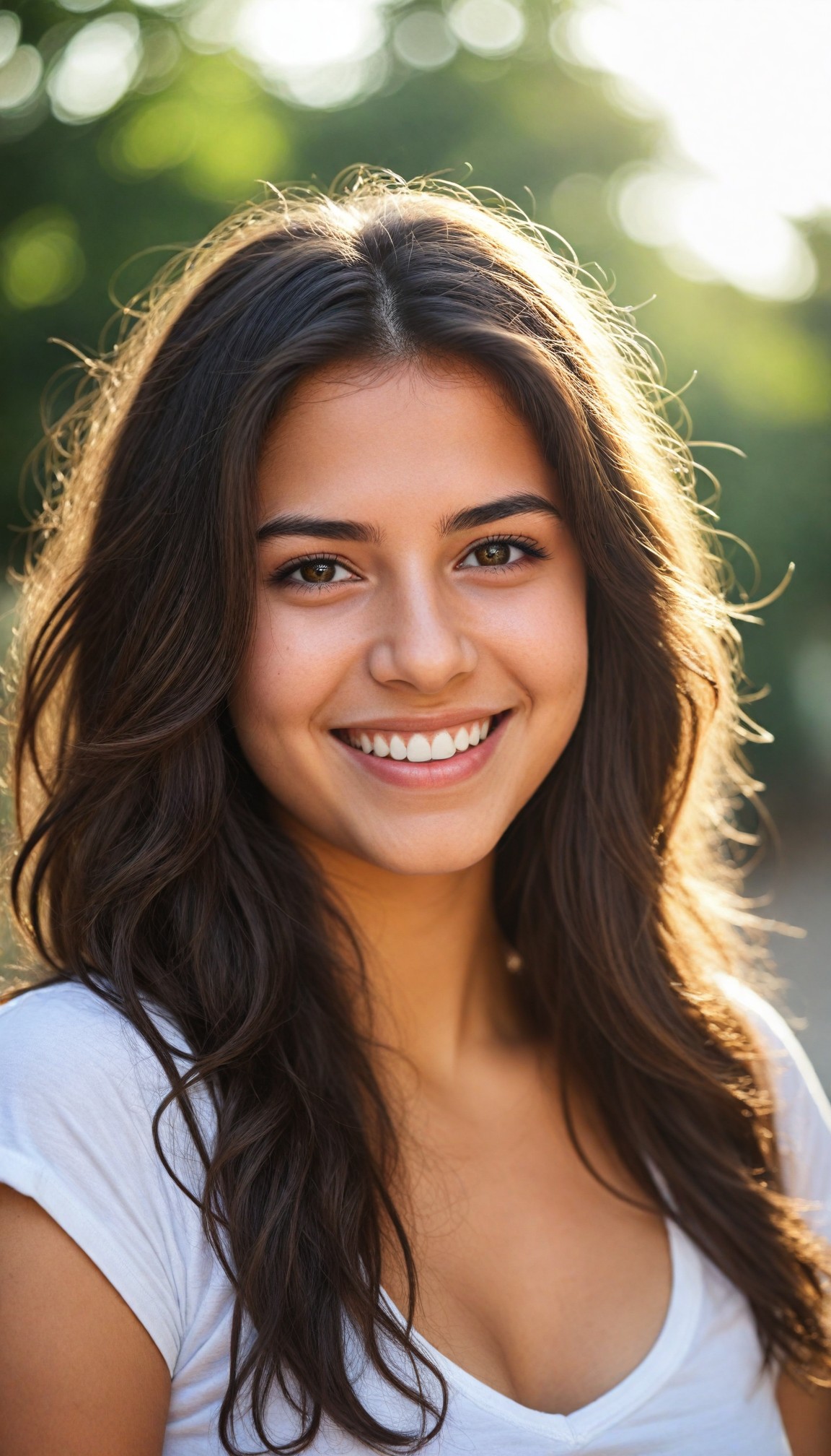 a young cute and busty teen girl from middle east, (stunning) (gorgeous) (detailed close-up portrait), plain soft hair, white t-shirt, detailed beautiful eyes, deep v-neck, smile, sunny backdrop