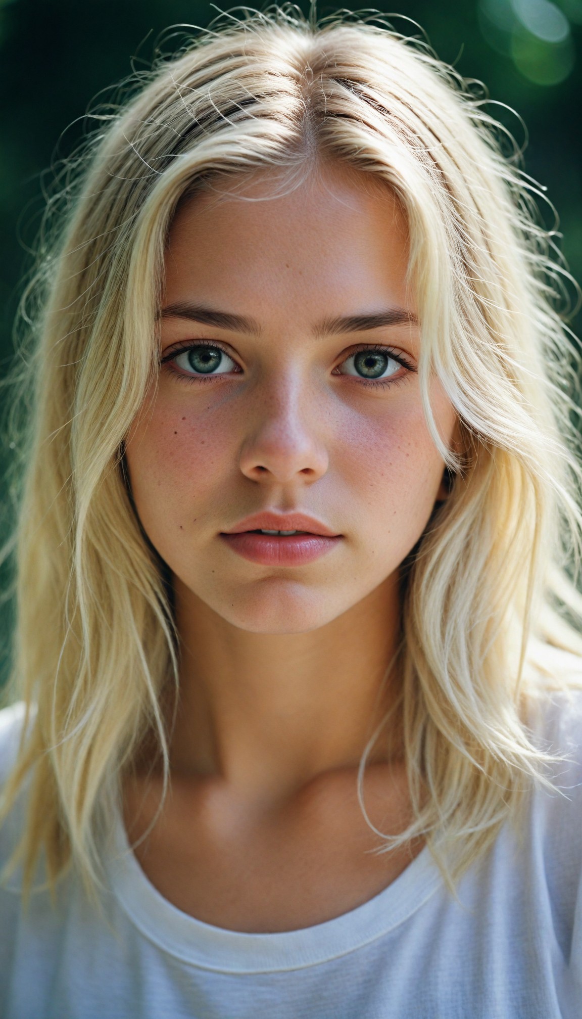a breathtakingly detailed and hyperrealistic (professional photograph), portraying an intensely sorrowful expression on the face of a young girl with luxuriantly flowing, untamed, straight, silky white blonde hair cascading down her shoulders, despite its perfect length and texture suggesting advanced age, paired with a minimalist (white short sleeve T-shirt)