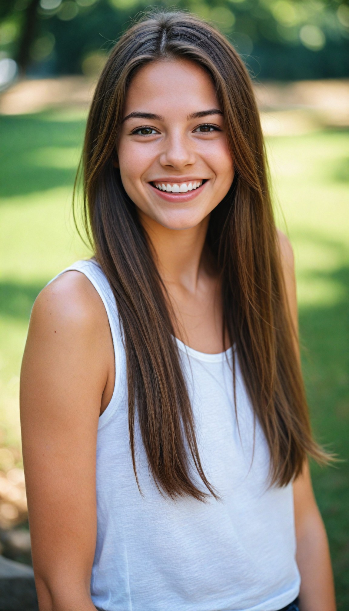 a breathtakingly detailed and hyper realistic (professional photograph) of a young teen girl with straight, silky jet brown soft hair cascading down her shoulders, round face, full lips, smile, white teeth despite its perfect length and texture suggesting advanced age, paired with a minimalist (white short sleeve tank top)