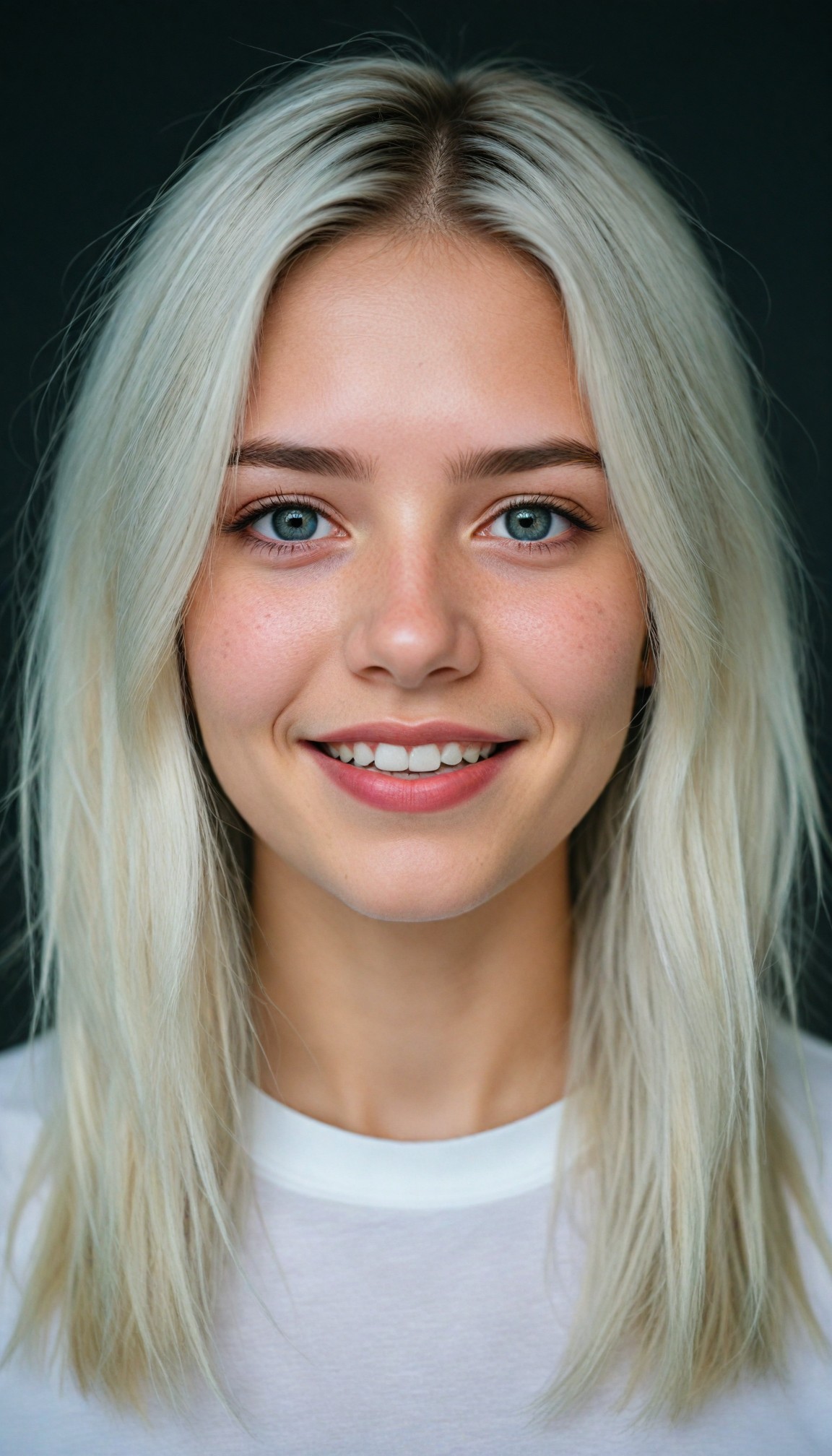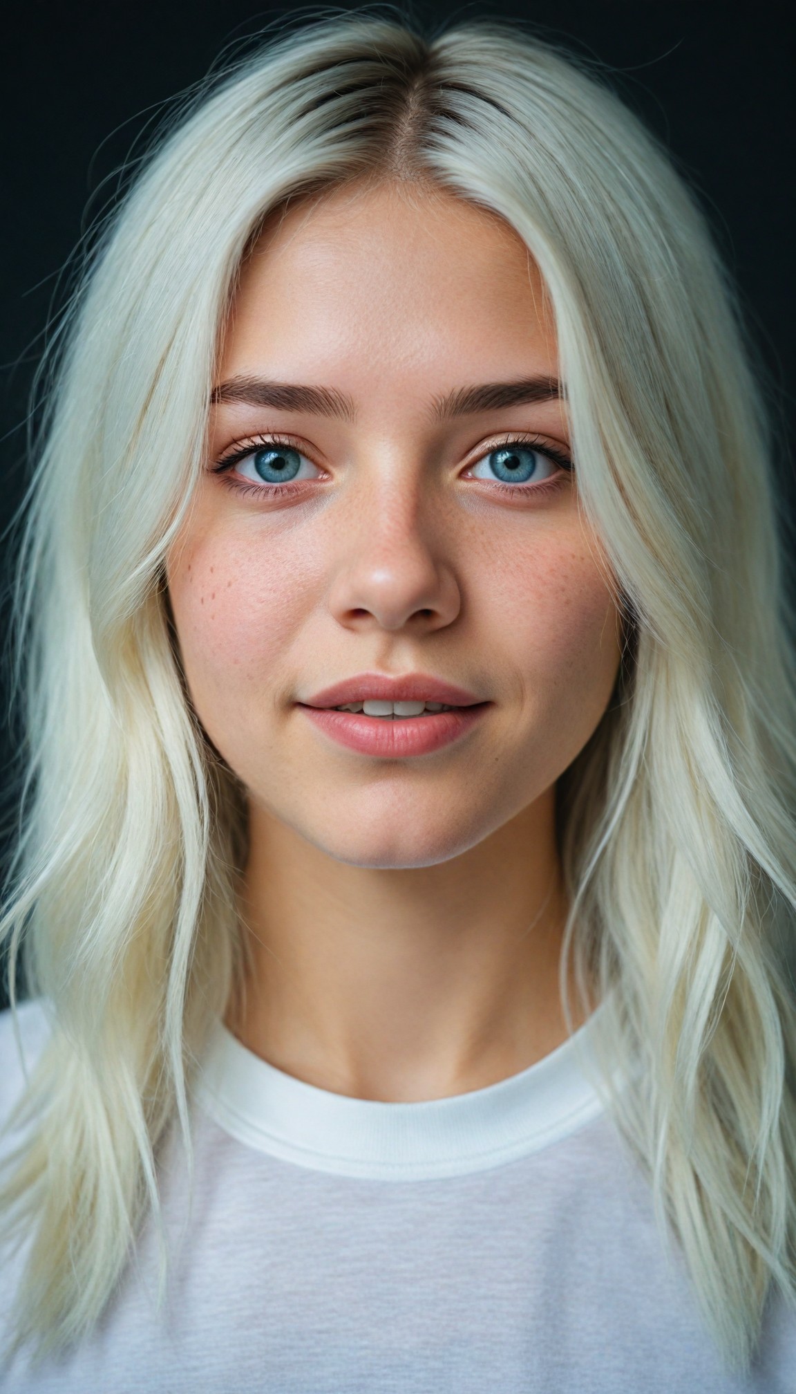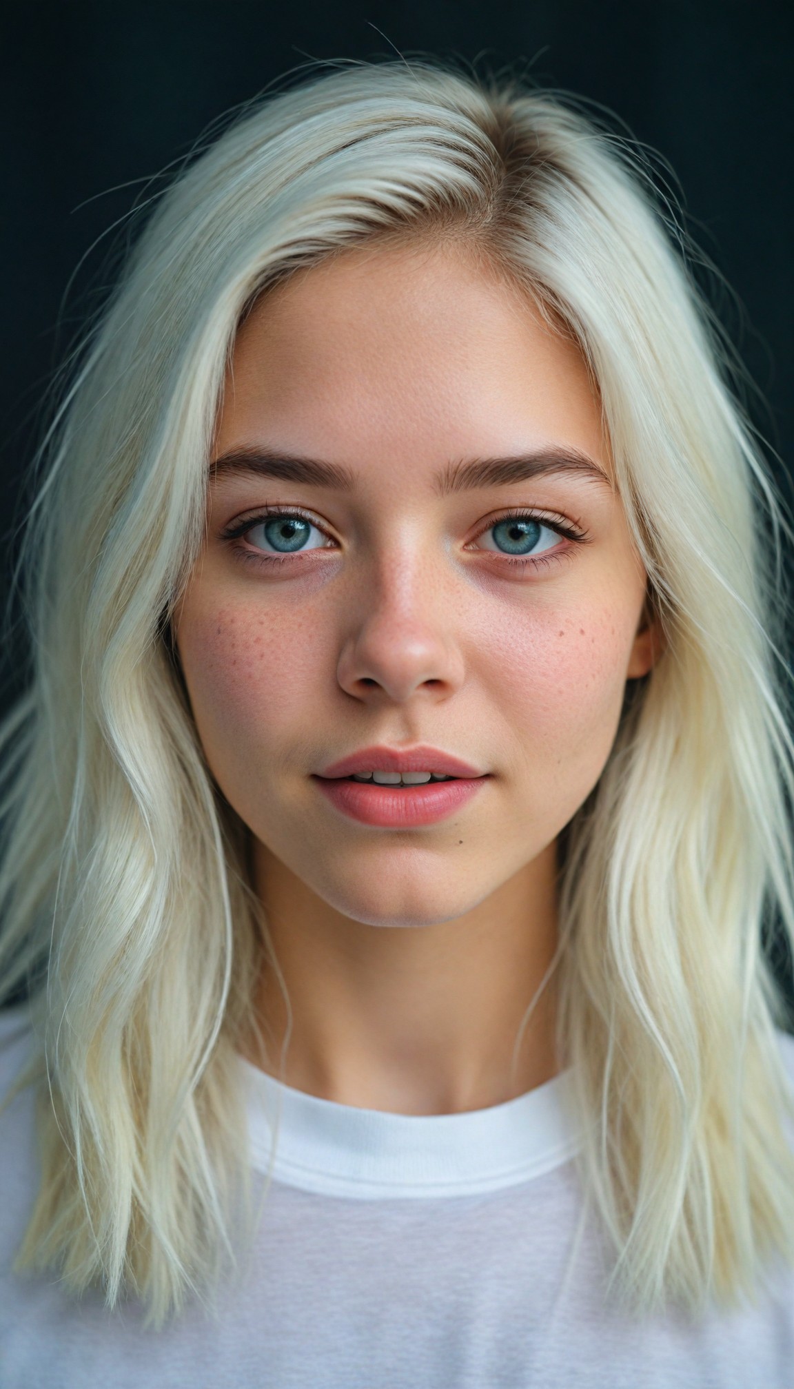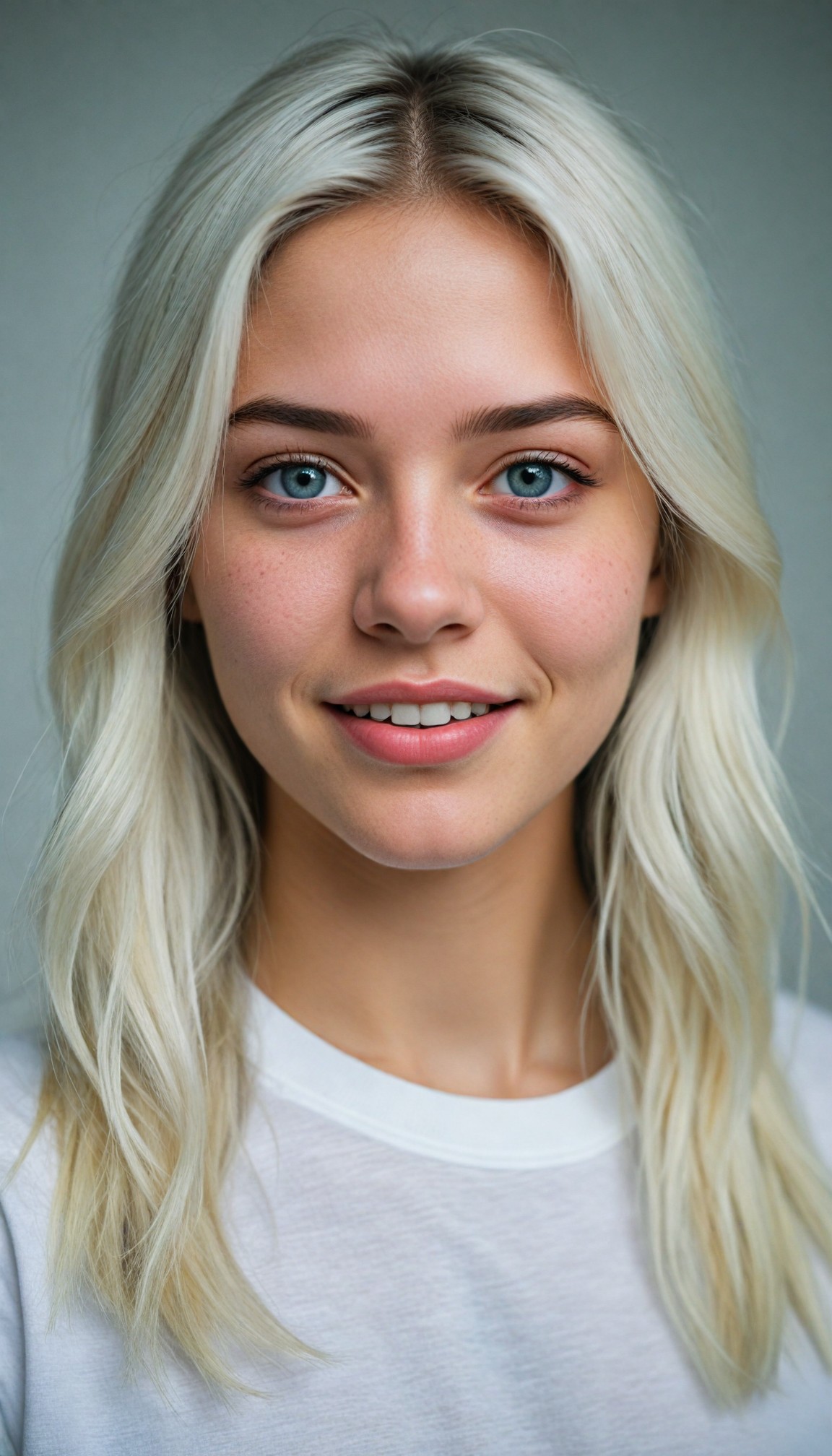 a breathtakingly detailed and hyper realistic (professional photograph), portraying an intensely sorrowful expression on the face of a young teen girl with straight, silky jet white soft hair cascading down her shoulders, round face, full lips, smile, white teeth despite its perfect length and texture suggesting advanced age, paired with a minimalist (white short sleeve t-shirt)