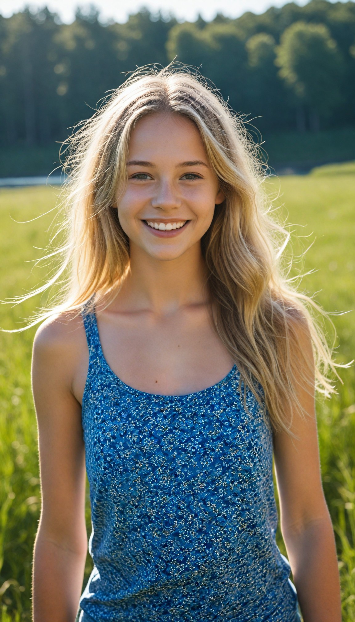 a fantastic young girl with long summer blond hair is standing in a sunny meadow. In the background is a deep blue lake, she is smiling, ((detailed and super realistic)), she wears a short plain cropped tank top