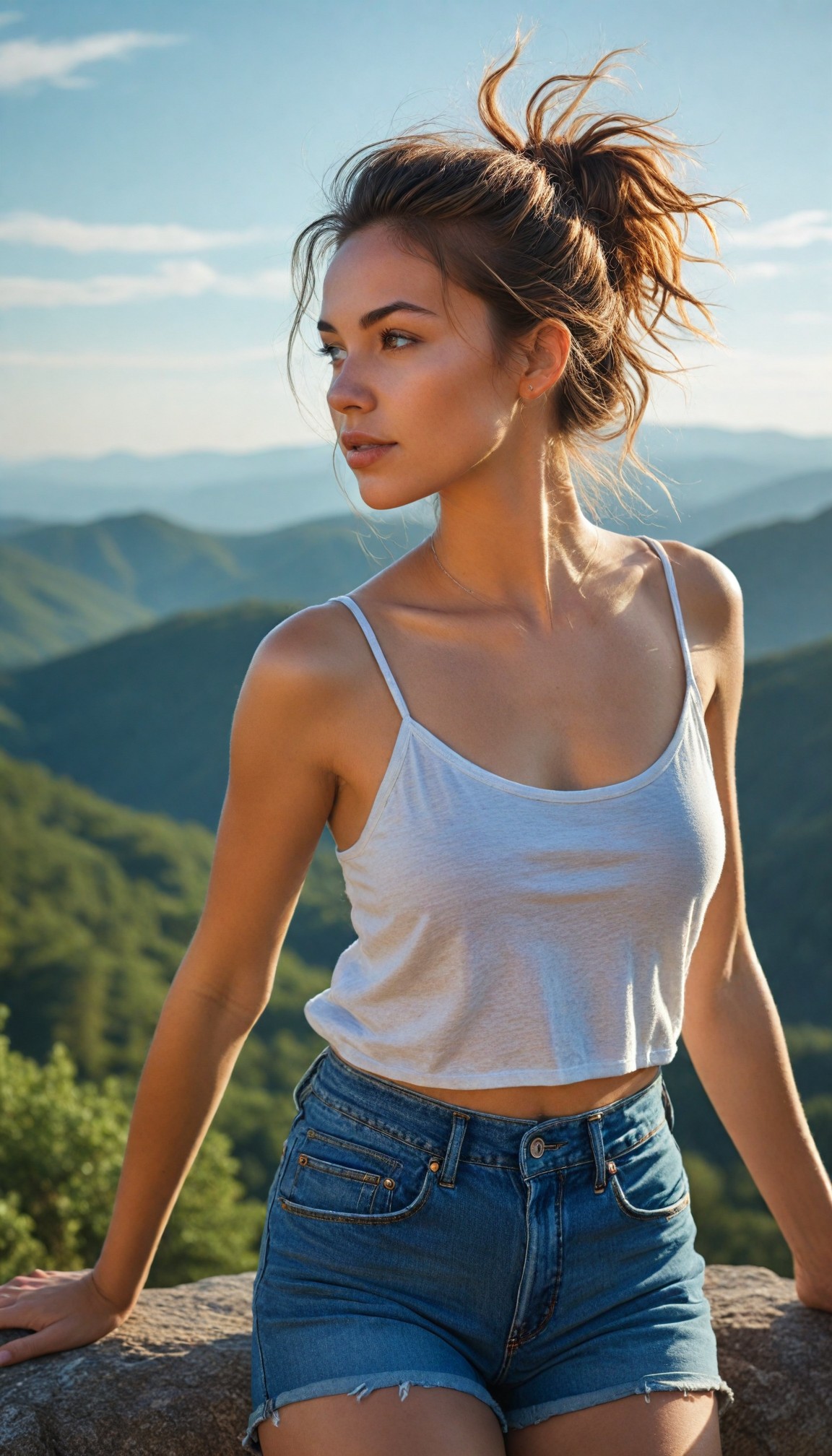 a (beautiful young girl), confidently on a (sunny day) top of mountain, with a warm, inviting glow emanating from her form, accentuating her (navel) and (soft, youthful thighs), (wearing a thin cropped spaghetti tank top) and (short jeans pants), her long, flowing locks artfully arranged in a messy bun, capturing a carefree, yet sophisticated vibe, (view from above)