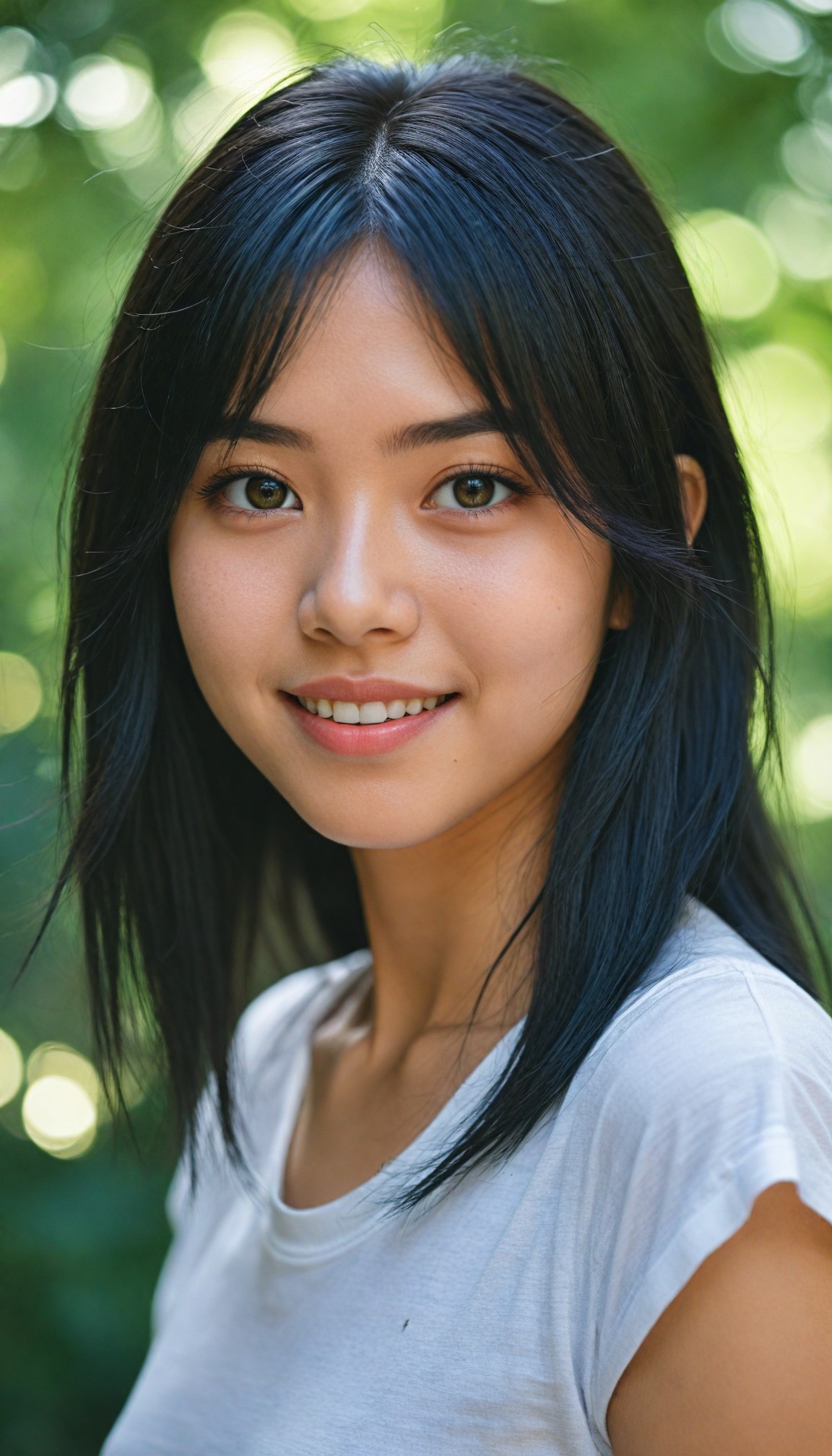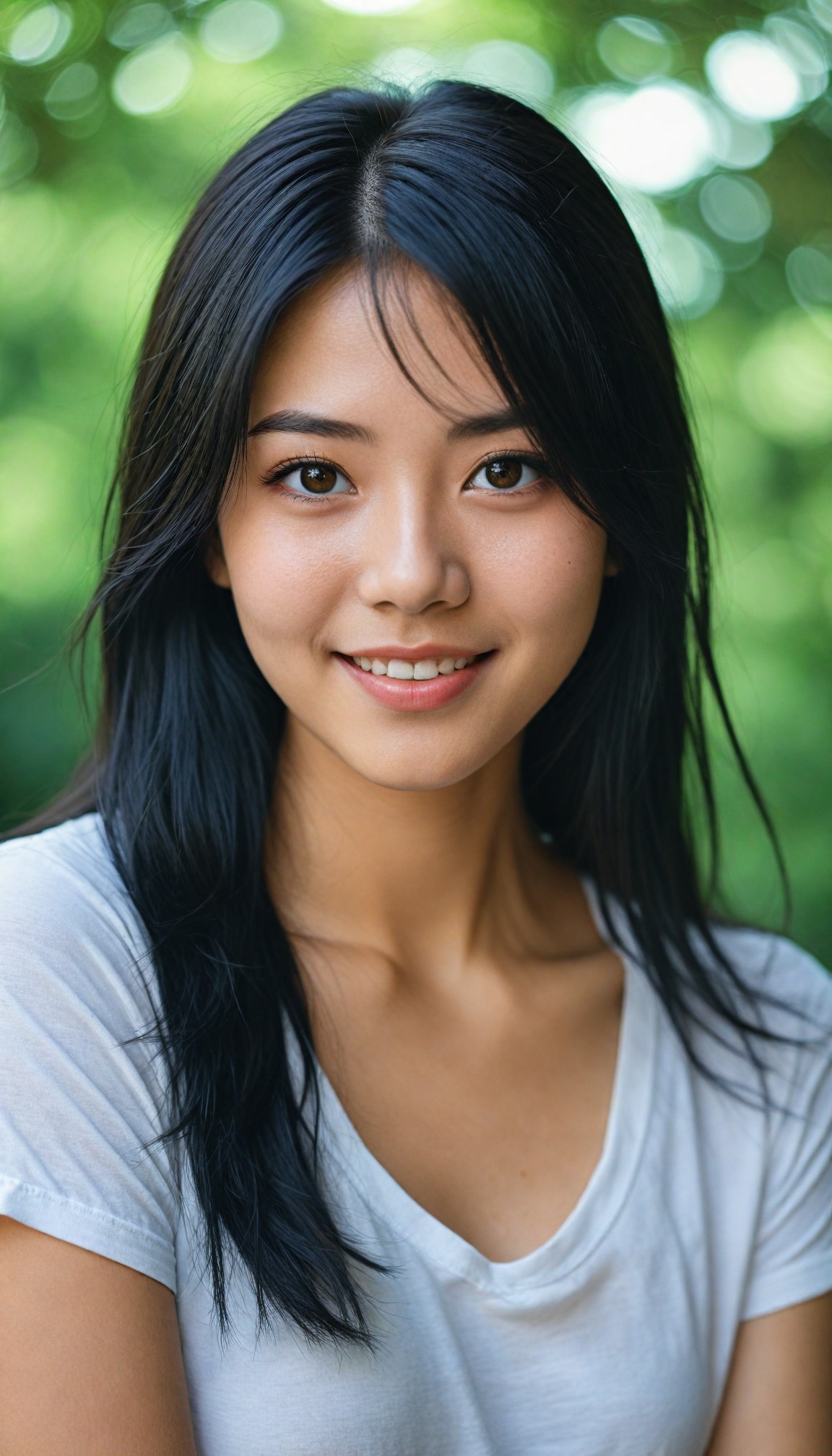 a detailed and realistic photo from a (cute) young Japanese girl (long, messy straight obsidian black hair), (stunning), (gorgeous), beautifully realistic, cinematic lights, realistic detailed angelic round face, (realistic detailed amber eye) looks happy at the camera, perfect curved body, (wears a super short tight (white t-shirt)), perfect anatomy, side perspective, against a sunny green backdrop