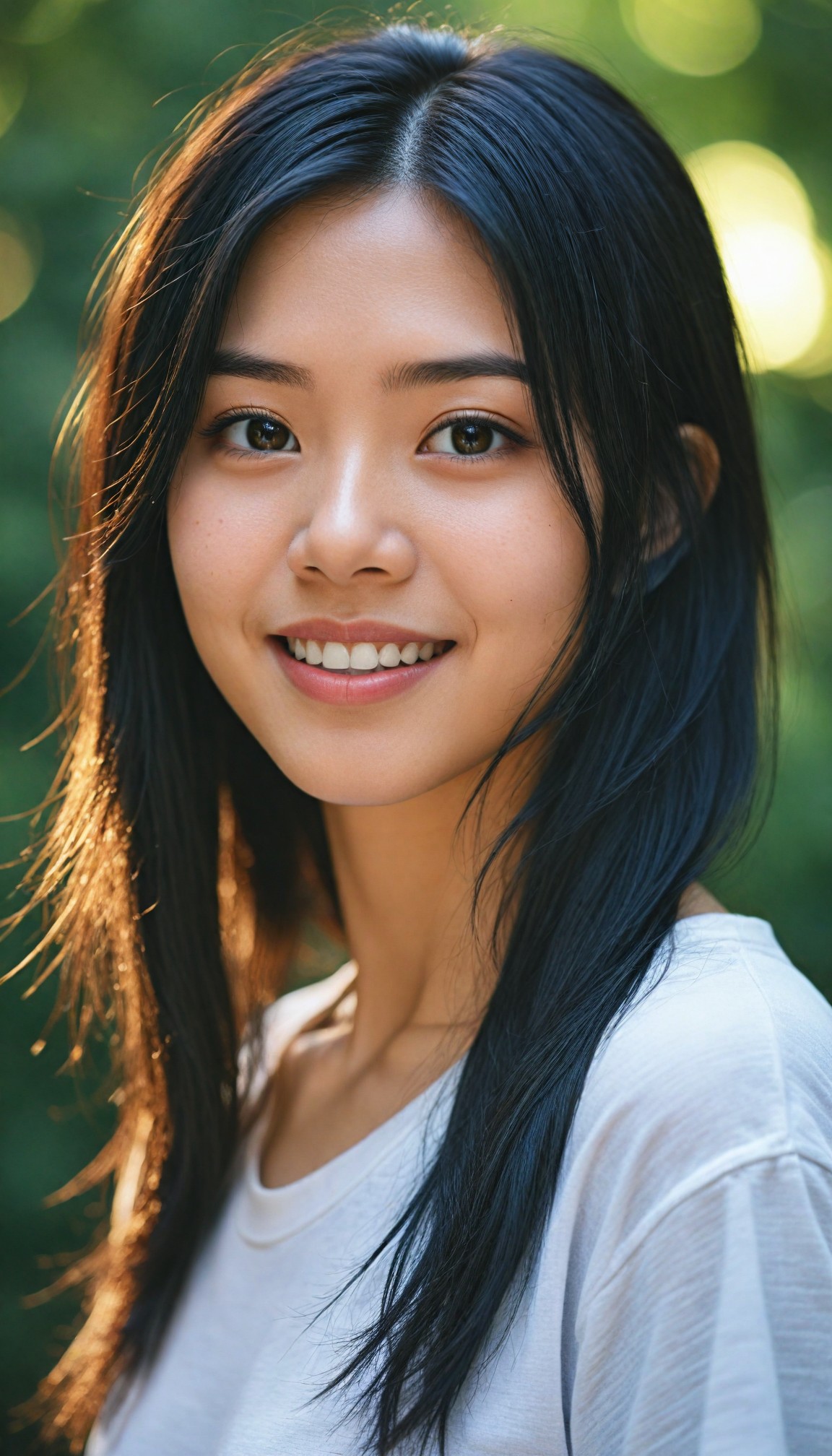 a detailed and realistic photo from a (cute) Oriental teen girl (long, straight jet hair, bangs), (stunning), (gorgeous), beautifully realistic, cinematic lights, realistic detailed angelic round face, (realistic detailed amber eye) looks happy at the camera, perfect curved body, (wears a super short tight (white t-shirt)), perfect anatomy, side perspective, against a sunny green backdrop