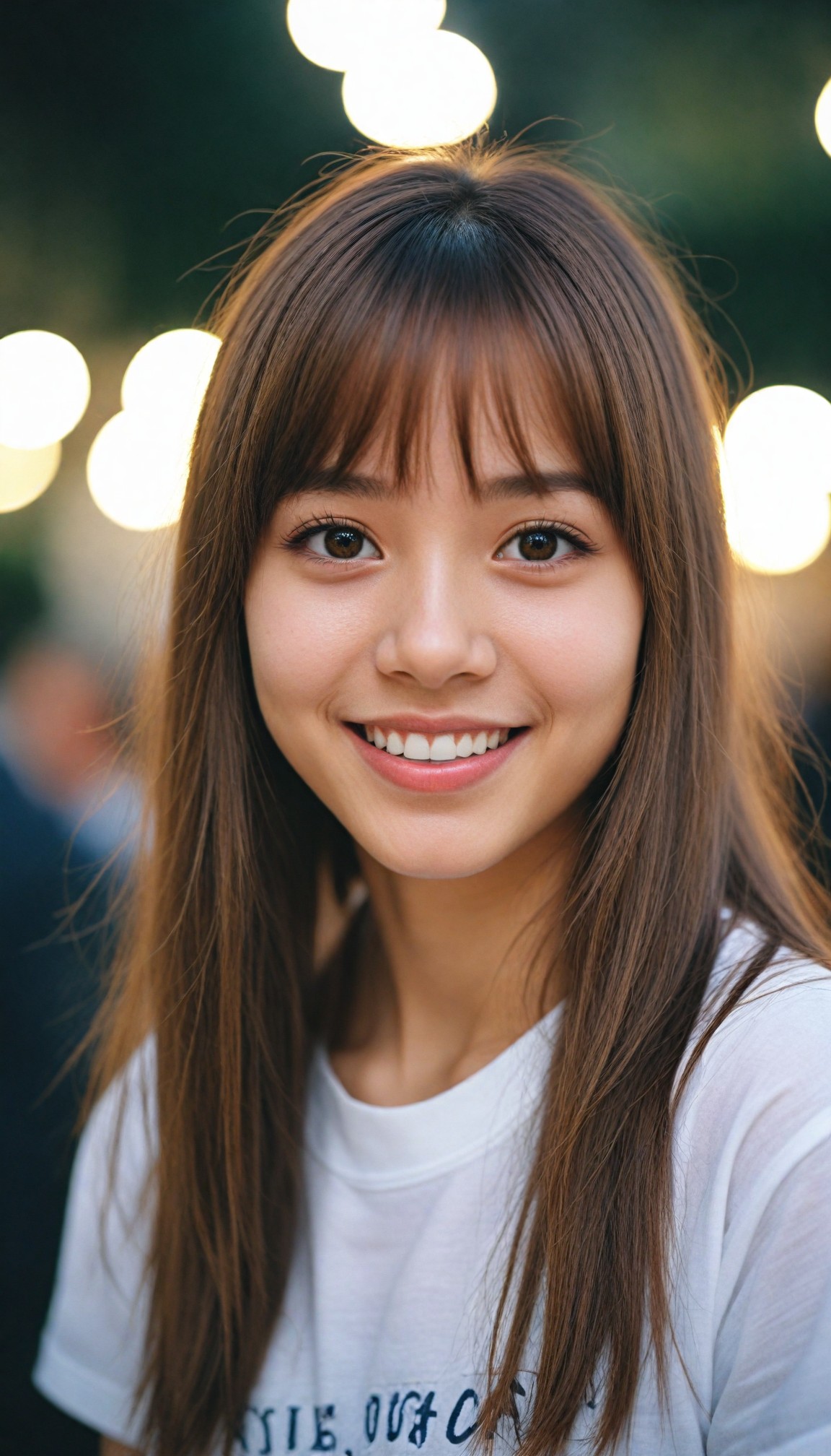 a portrait of (cute) Asia teen girl (long, straight light brown hair, bangs), (stunning), beautifully realistic, cinematic lights, realistic detailed angelic round face, (realistic detailed amber eye) looks happy at the camera, perfect curved body, (wears a super short tight (white t-shirt)), perfect anatomy, side perspective