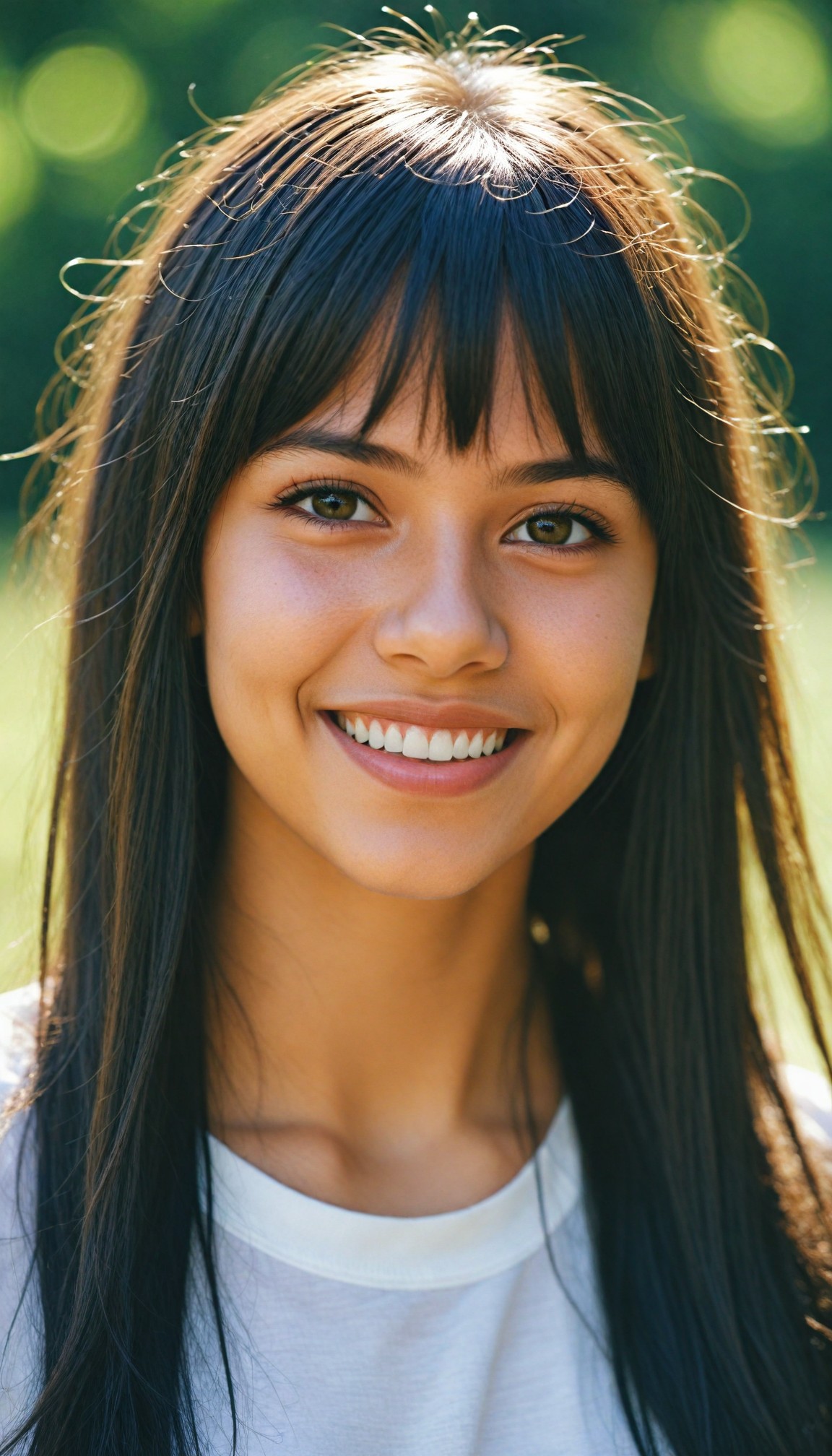 a detailed and realistic photo from a (cute) Indigenous teen girl (long, straight jet hair, bangs), (stunning), (gorgeous), beautifully realistic, cinematic lights, realistic detailed angelic round face, (realistic detailed amber eye) looks happy at the camera, perfect curved body, (wears a super short tight (white t-shirt)), perfect anatomy, side perspective, against a sunny green backdrop