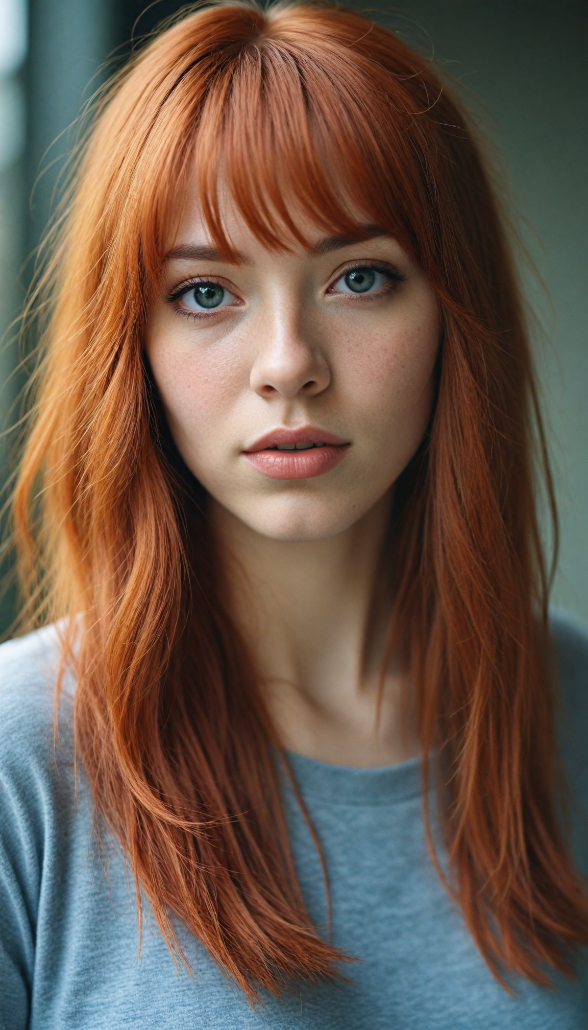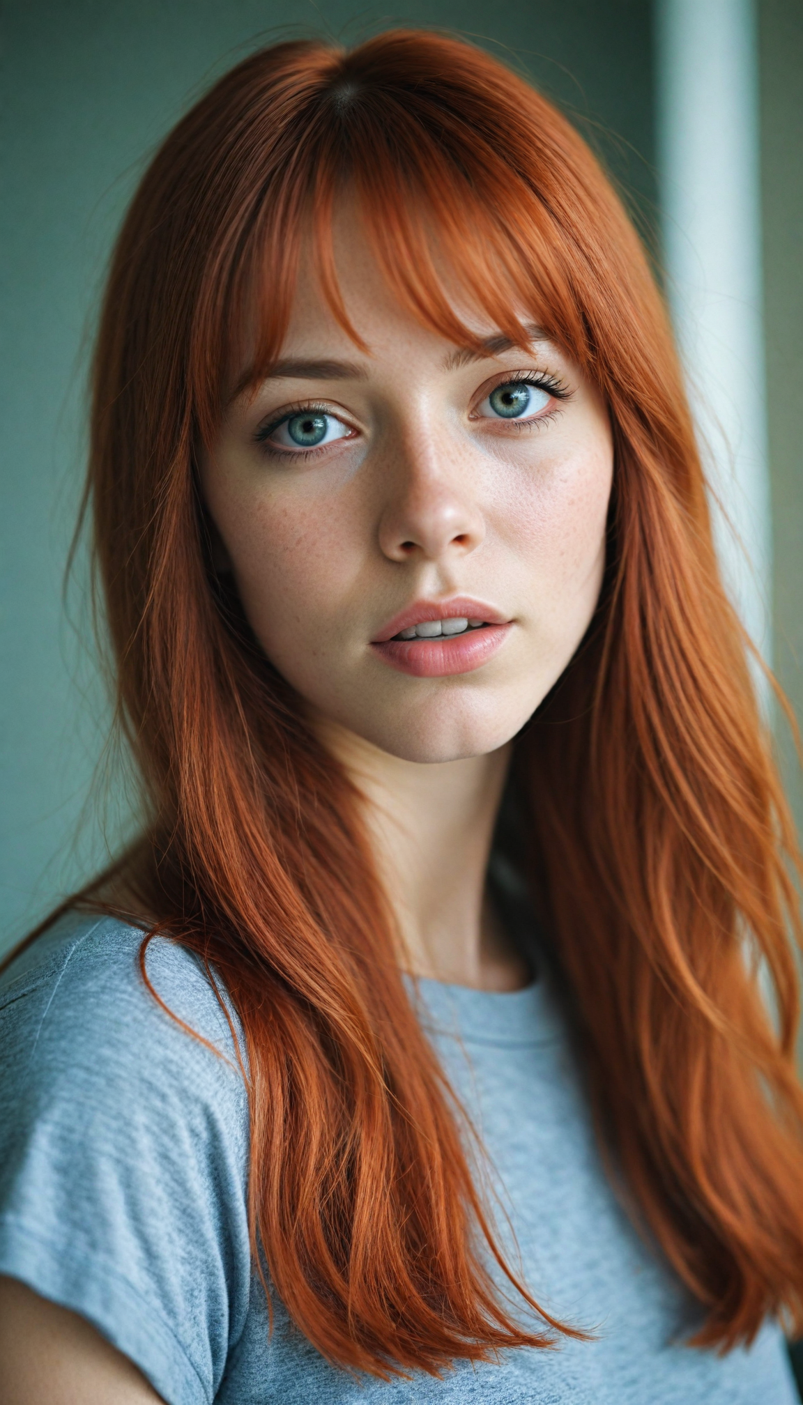 a stunningly detailed (photograph) representing a (girl) with intricate, realistically drawn features like dynamically detailed straight long flowing red hair with bangs framing her face, full lips, eyes looking seductively with mouth slightly open, striking realistic and detailed eyes all against a sophisticated, softly lit (background) where she wears a modern minimalist grey t-shirt
