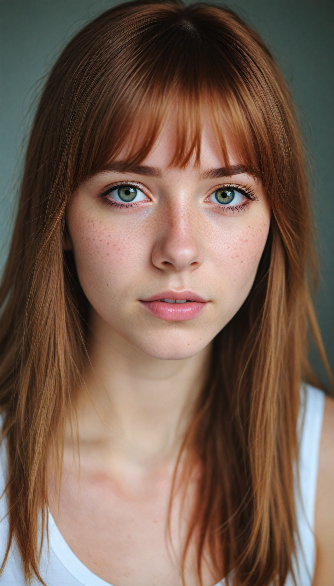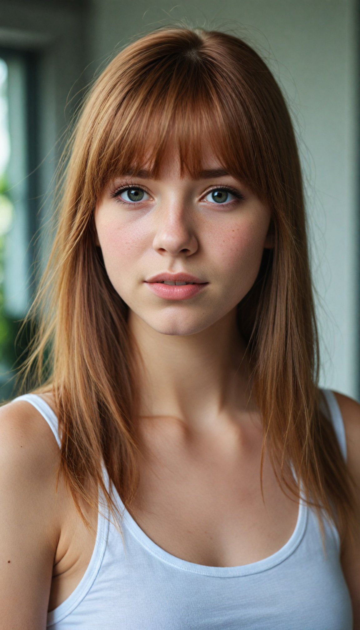 super realistic, 4k, detailed face, cute petite teen girl, long auburn straight hair, bangs cut, wear a white short tight cropped tank top with deep v-neck, looks at the camera, portrait shot