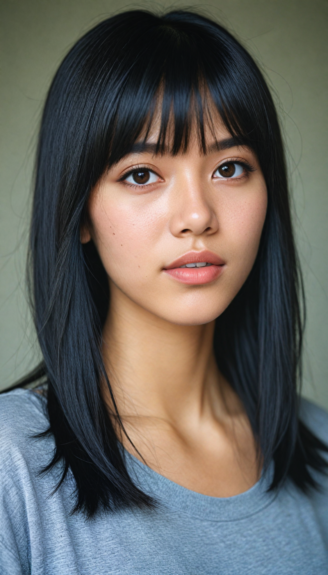 a stunningly detailed (photograph) representing a (Asian girl) with intricate, realistically drawn features like dynamically detailed straight long flowing black hair with bangs framing her face, full lips, eyes looking seductively with mouth slightly open, striking realistic and detailed eyes all against a sophisticated, softly lit (background) where she wears a modern minimalist grey t-shirt