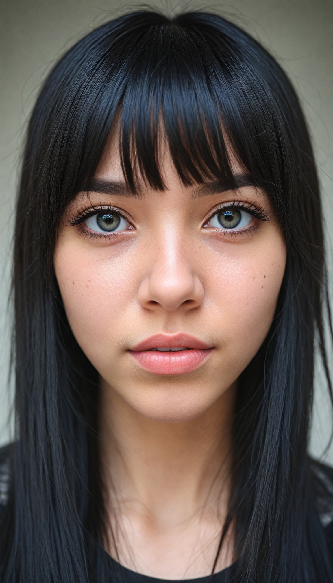 super realistic, 4k, detailed face, cute Exotic teen girl, long black straight jet soft hair, bangs cut, wear a grey crop tank top, looks at the camera, portrait shot, super realistic amber eyes
