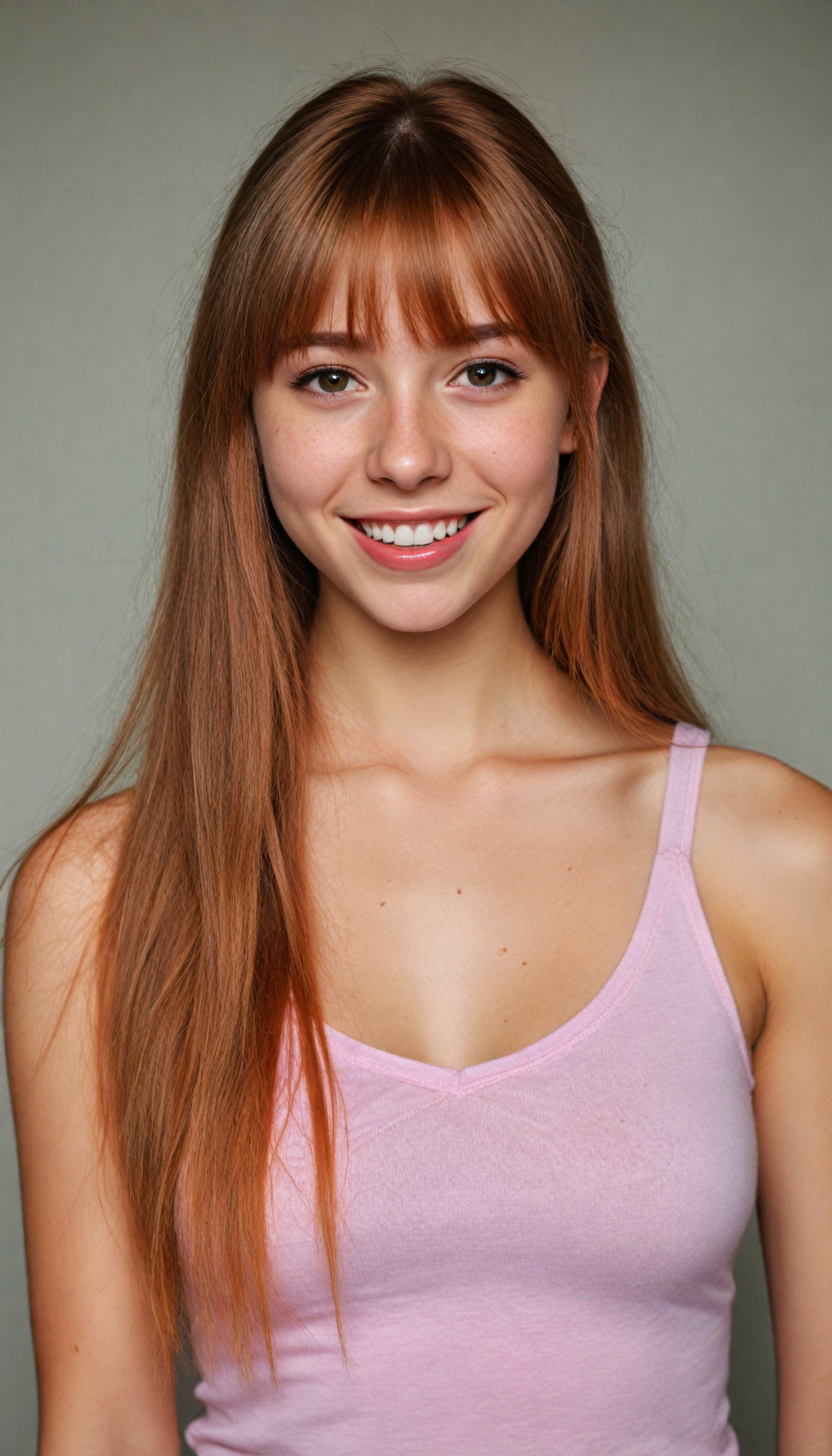 super realistic, 4k, detailed face, cute petite teen girl, long ligh red super soft straight hair, bangs cut, wear a (pink short tight cropped tank top with deep v-neck), looks at the camera, smile, portrait shot