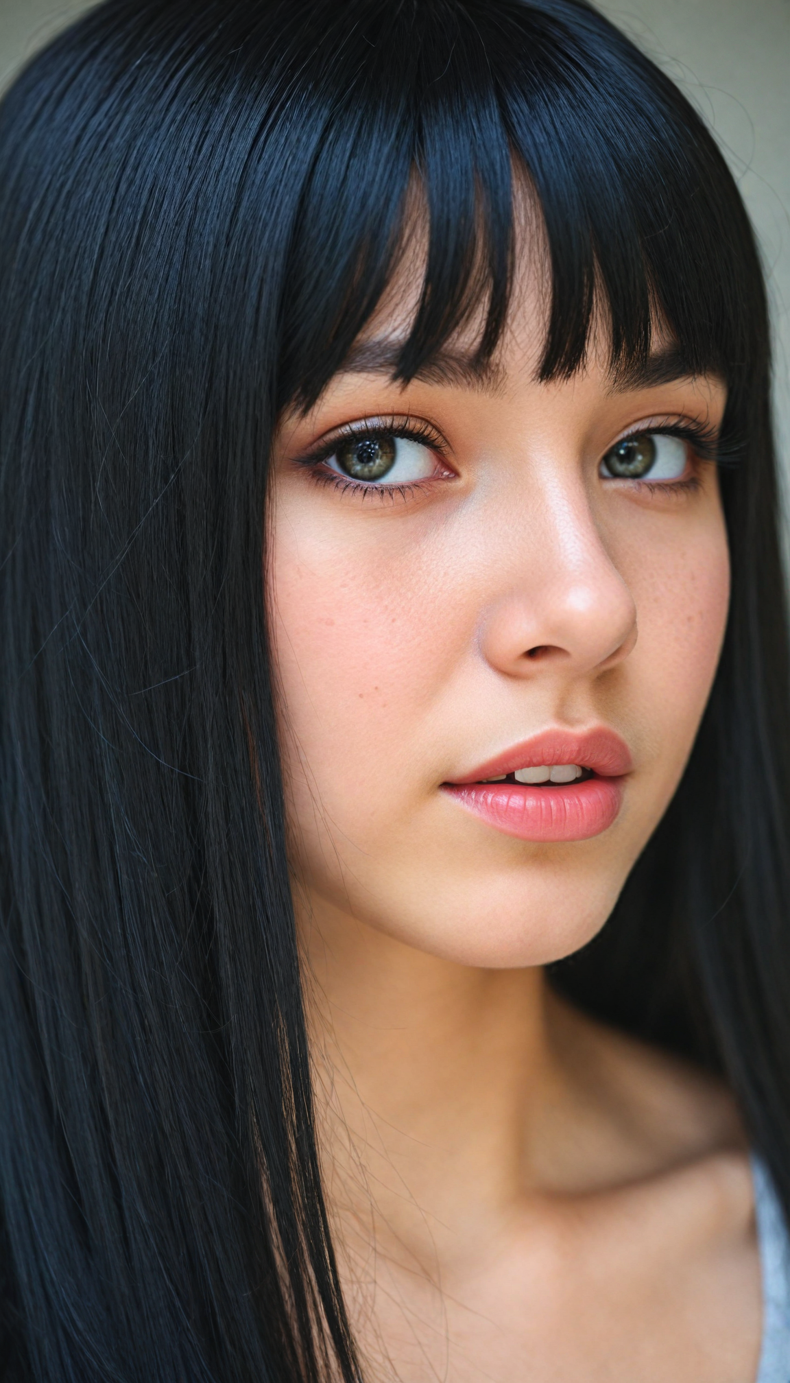 a realistic, detailed, dynamic photography from a beautiful young teen (Emo girl), with (detailed obsidian long soft straight hair, bangs), full kissable lips, looking into the camera, perfect detailed face, side view, (close up portrait), (stunning), (gorgeous), (white background)