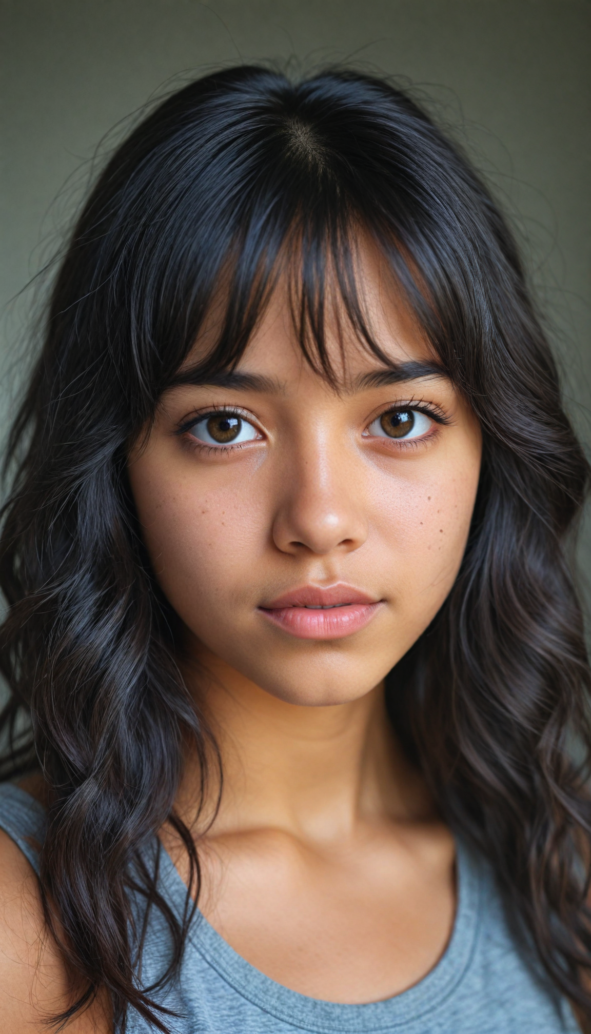 super realistic, 4k, detailed face, cute Exotic teen girl, long black wavy soft hair, bangs cut, wear a grey crop tank top, looks at the camera, portrait shot