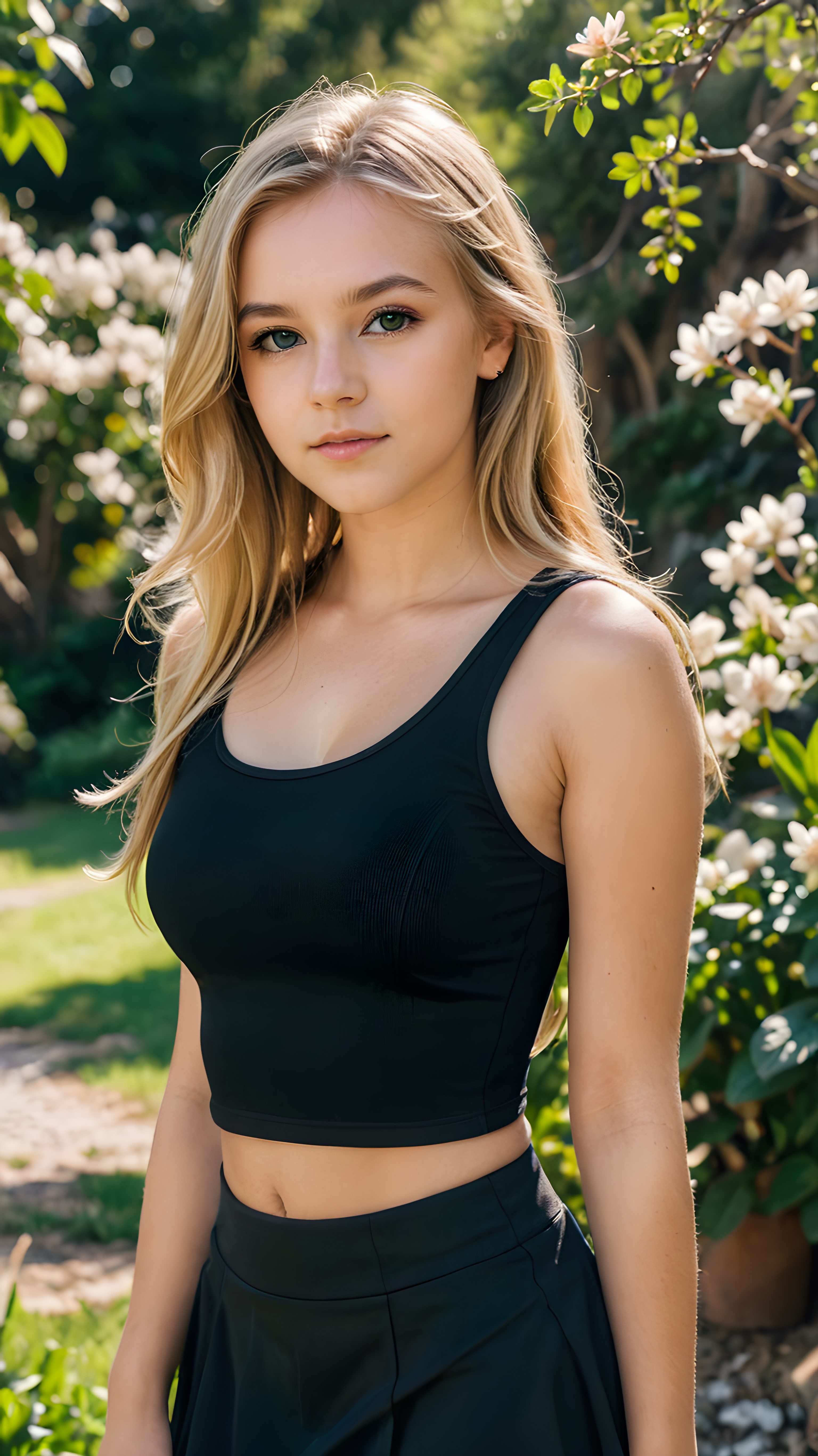 a (((realistic photo))) showcasing a (((beautiful young teenage girl))), with meticulously drawn long, straight sommer blonde (((soft hair))), and a sleekly detailed figure in a (((short, black crop top))), paired with a (short, round, mini skirt) ((natural spring backdrop))