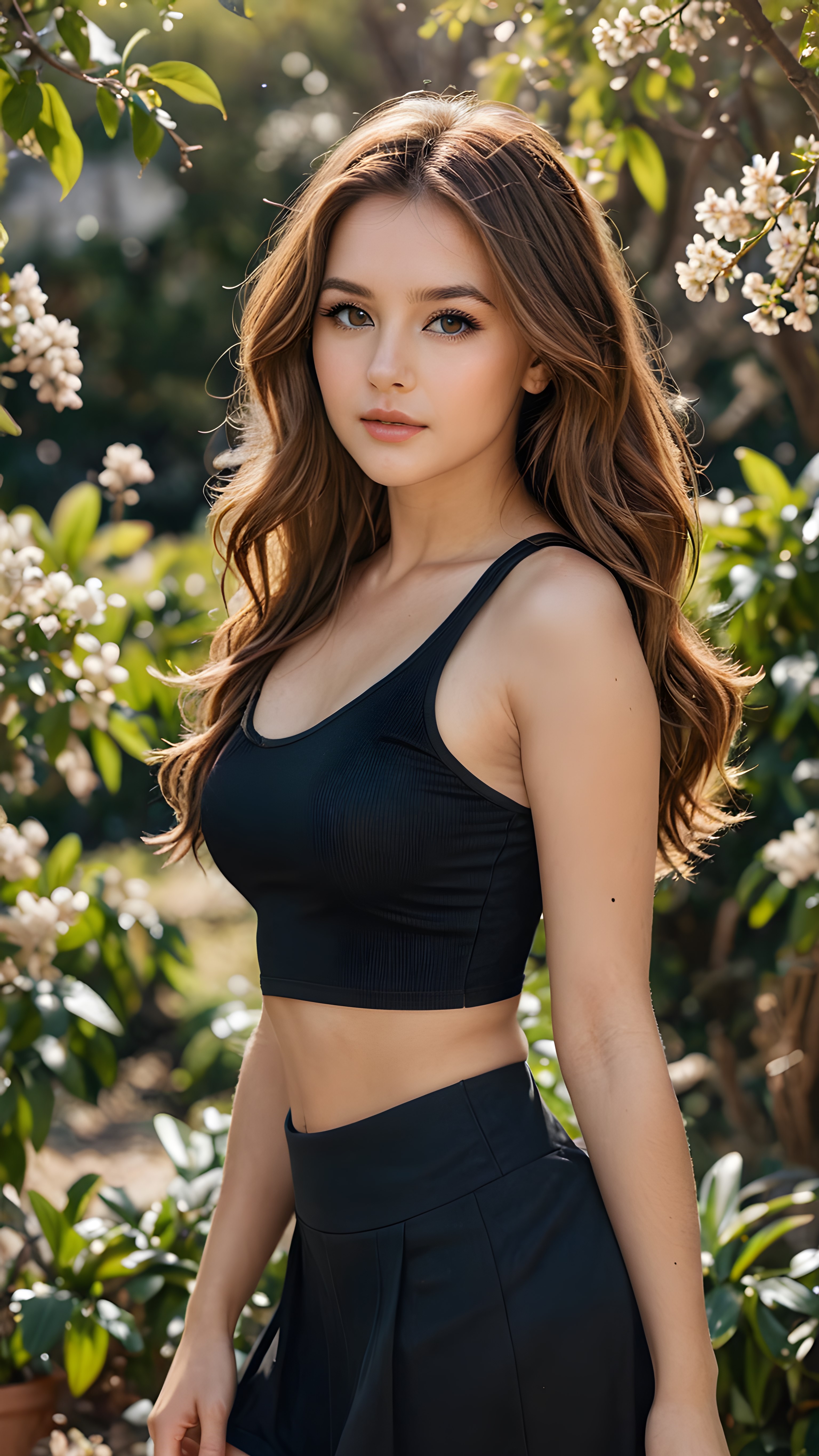 a (((realistic photo))) showcasing a (((beautiful girl))), with meticulously drawn long, flowing brown (((soft hair))), and a sleekly detailed figure in a (((short, black crop top))), paired with a (short, round, mini skirt) ((natural spring backdrop))