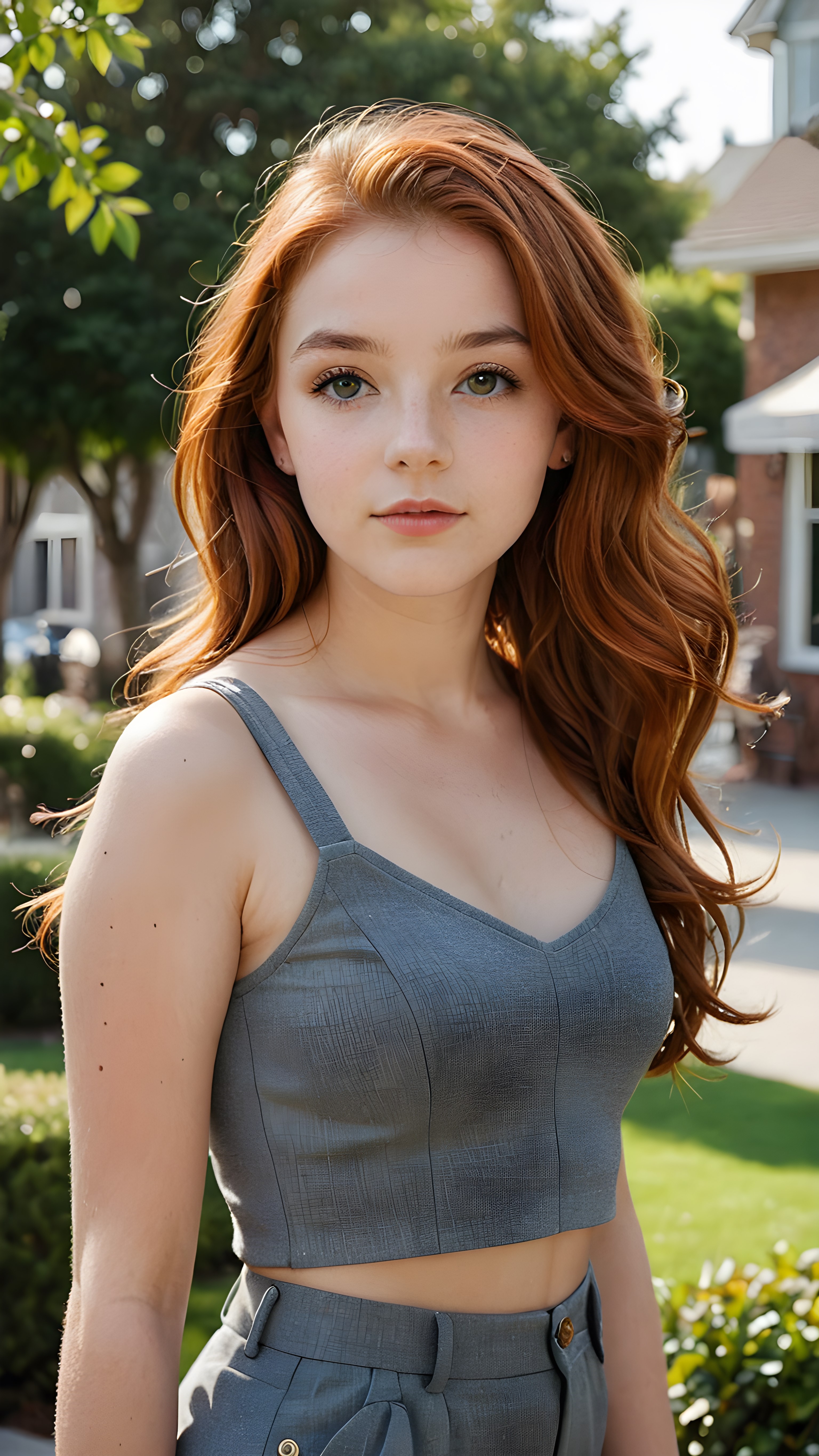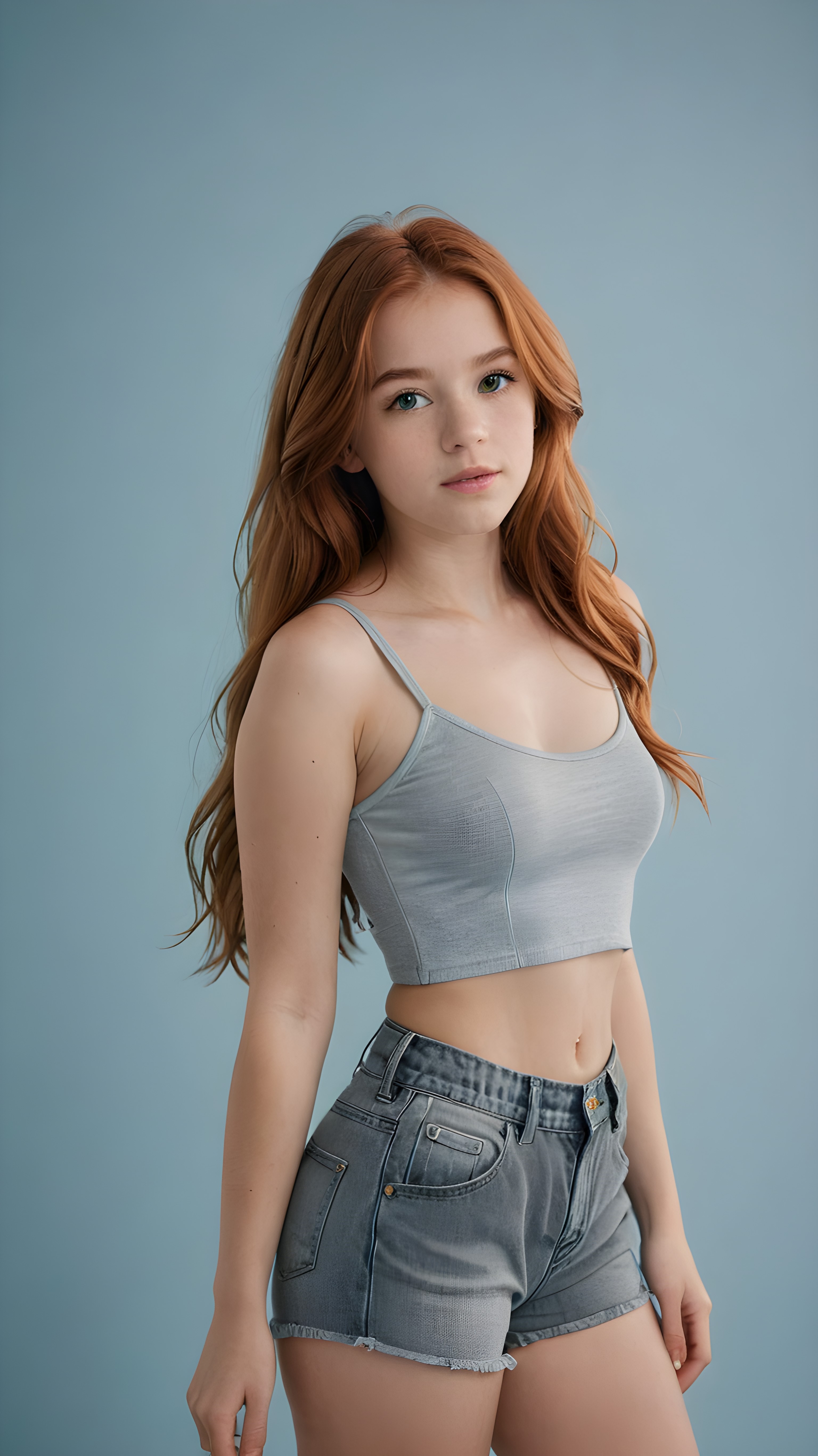 a (((realistic photo))) showcasing a (((beautiful young girl, 15 years old))), with meticulously drawn long, straight auburn red (((soft hair))), and a sleekly perfect curved and detailed figure in a (((short, grey crop top))), paired with a (short pants) ((light blue backdrop)) ((side view))