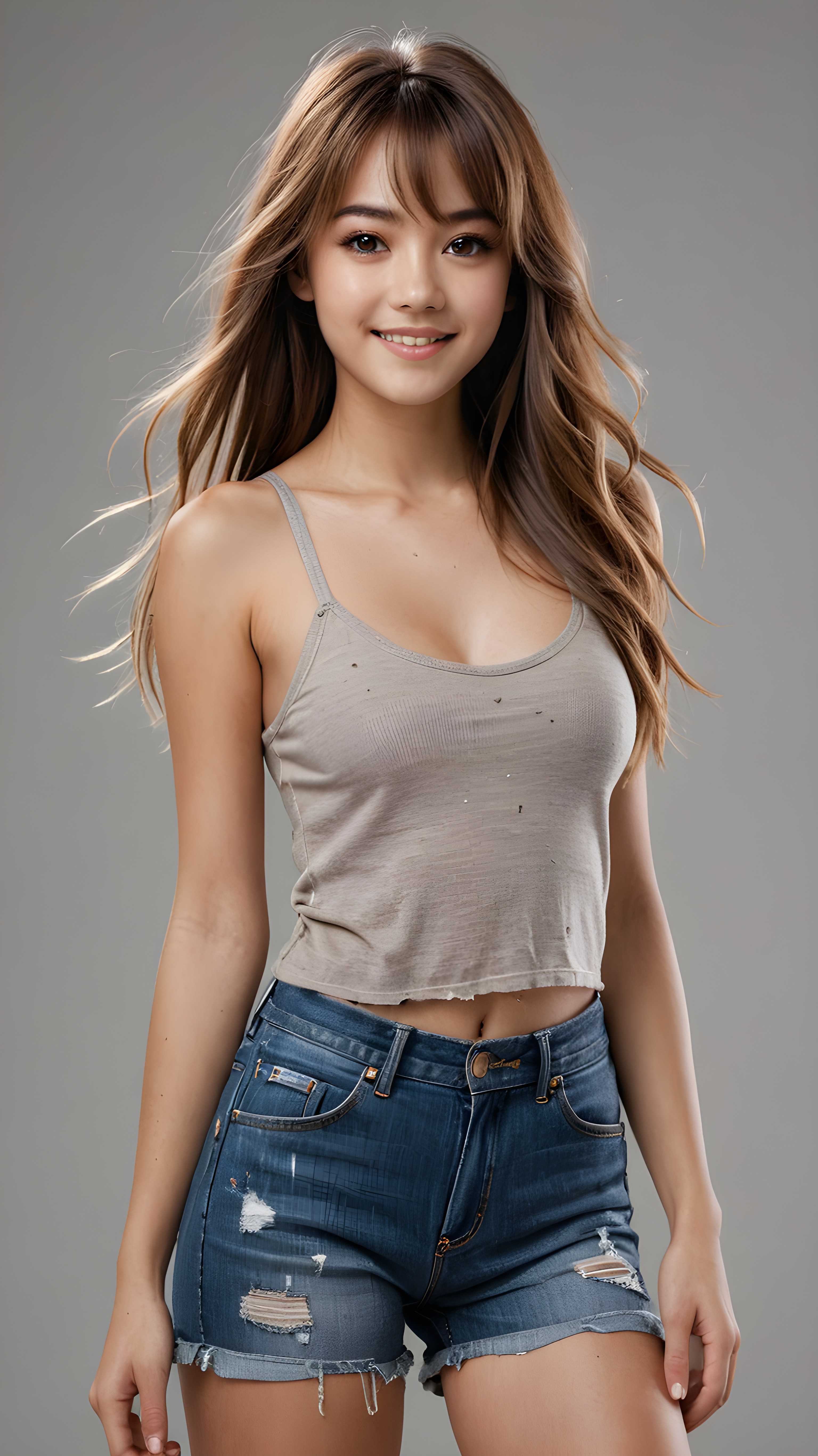 ((full body view)) of (((cute))) (((elegant))) ((attractive)) (((long, messy, straight hair))) ((stunning)) a beautifully realistic, cinematic lights, teen girl, bangs haircut, detailed hazelnut hair, realistic detailed angelic face, ((realistic detailed brown eye)) looks very happy at the camera, portrait shot, perfect curved, wears a super short tight (grey tank top), super short jeans pants, perfect anatomy, white background, side perspective, ((no background))