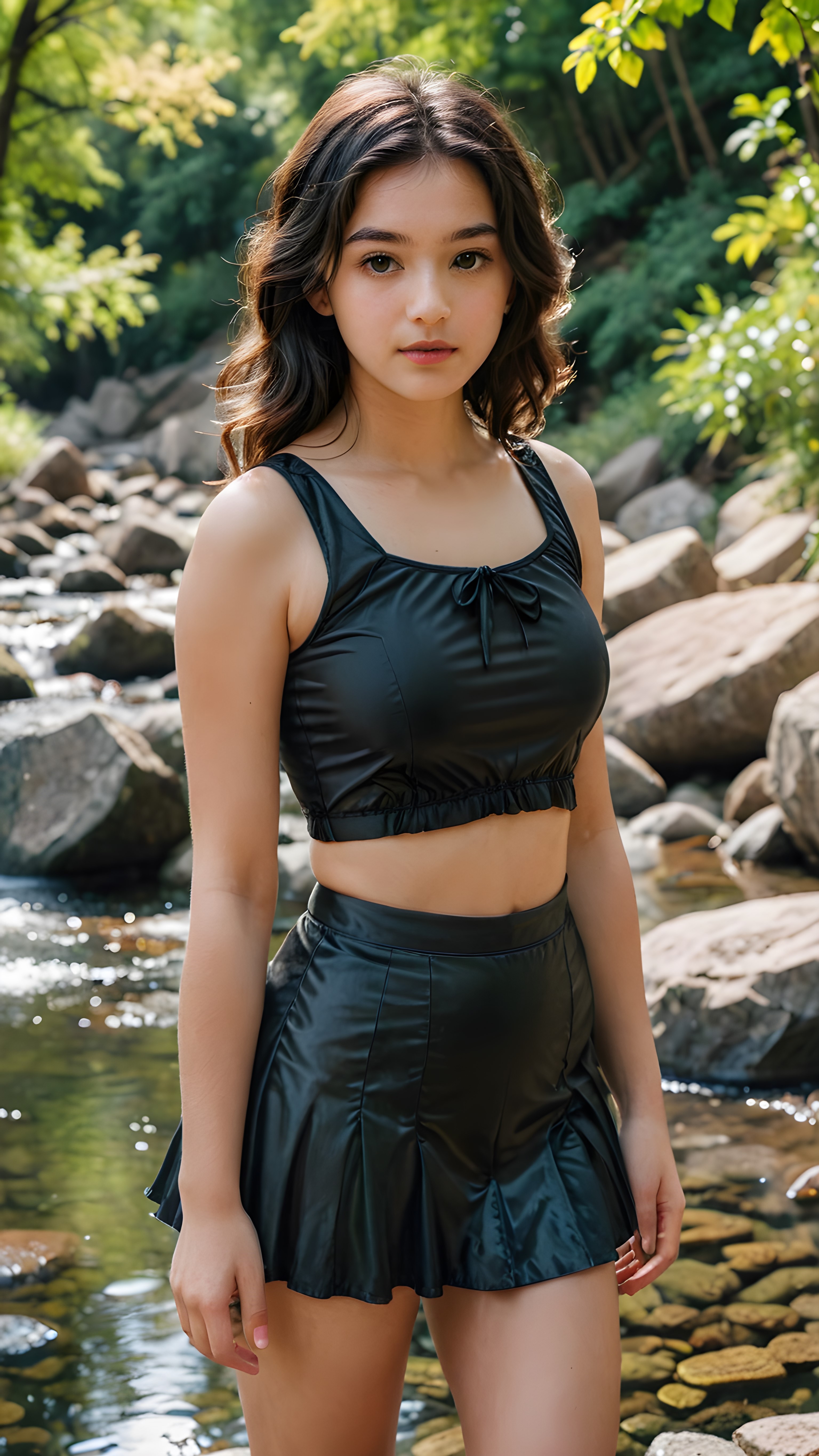 a beautiful, young girl stands in a natural spring and looks embarrassed into the camera. Her black, wavy hair falls over her upper body. She is wearing a thin silk crop top and round short miniskirt