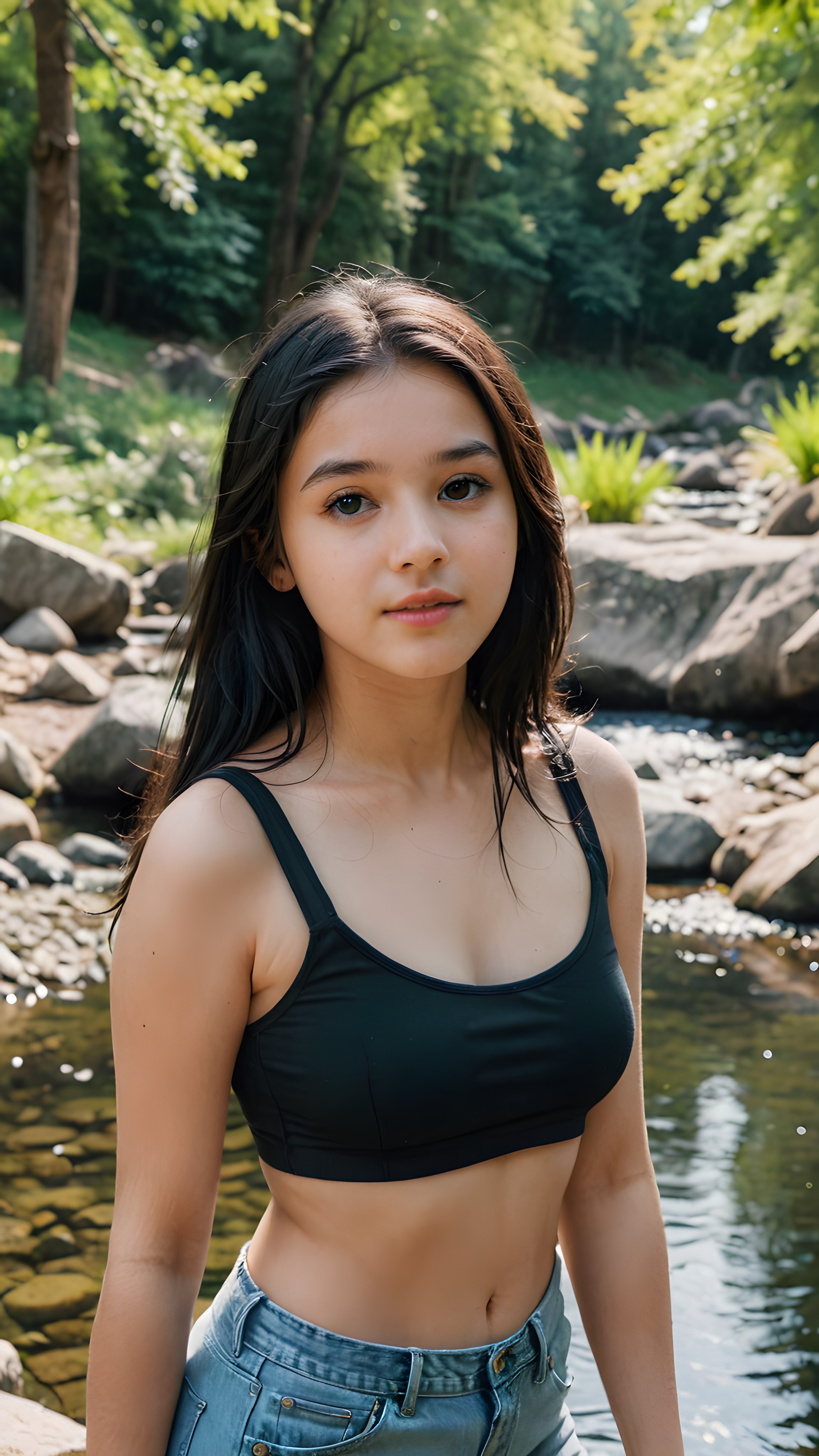 a beautiful, young teen girl stands in a natural spring and looks embarrassed into the camera. Her black, long jet hair falls over her upper body. She is wearing a thin crop top, perfect curvy body