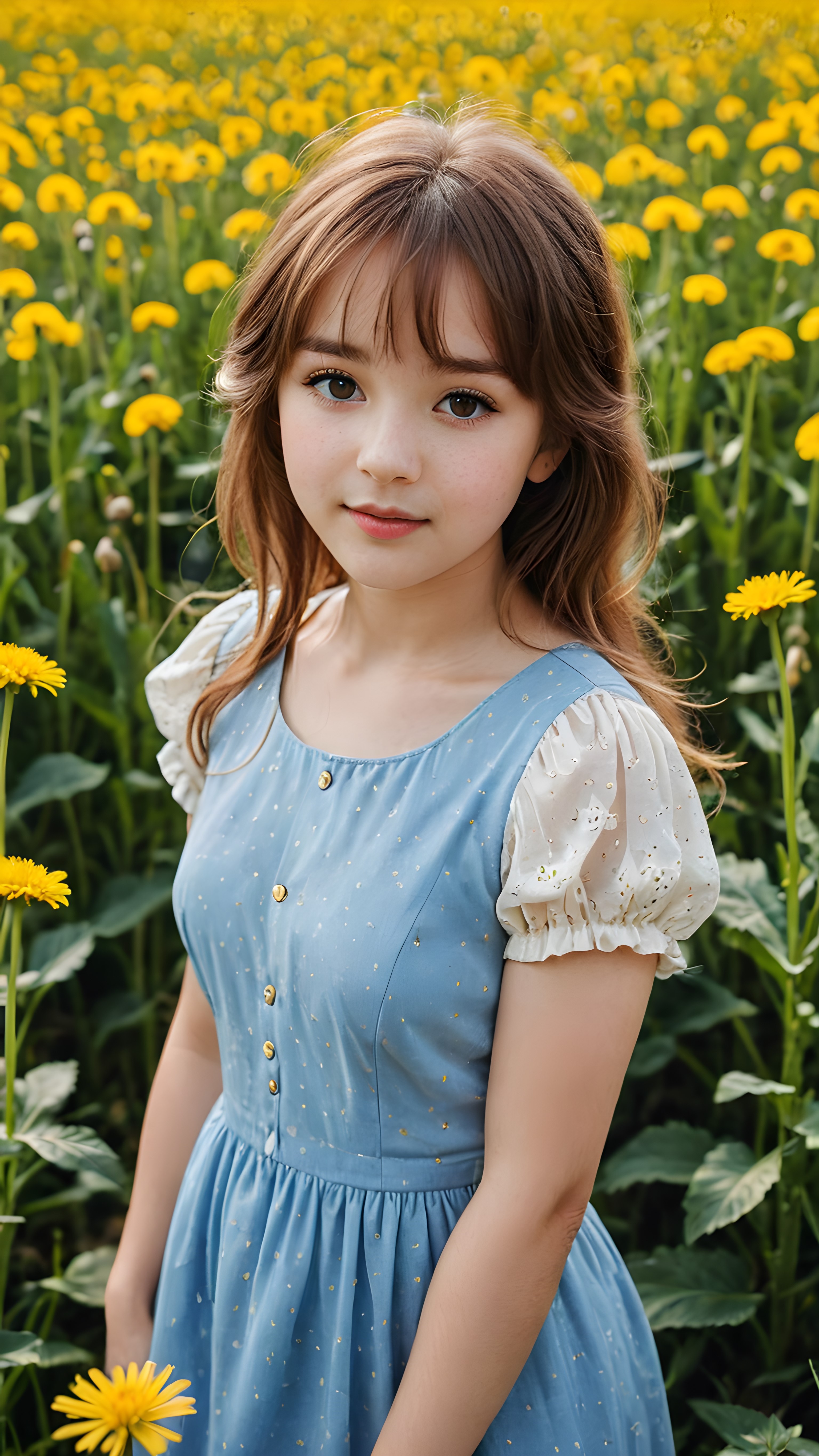a beautiful young girl, in the yellow dandelion field, detailed face with rosy cheeks brown soft hair with bangs, in white and blue shade dress, full view