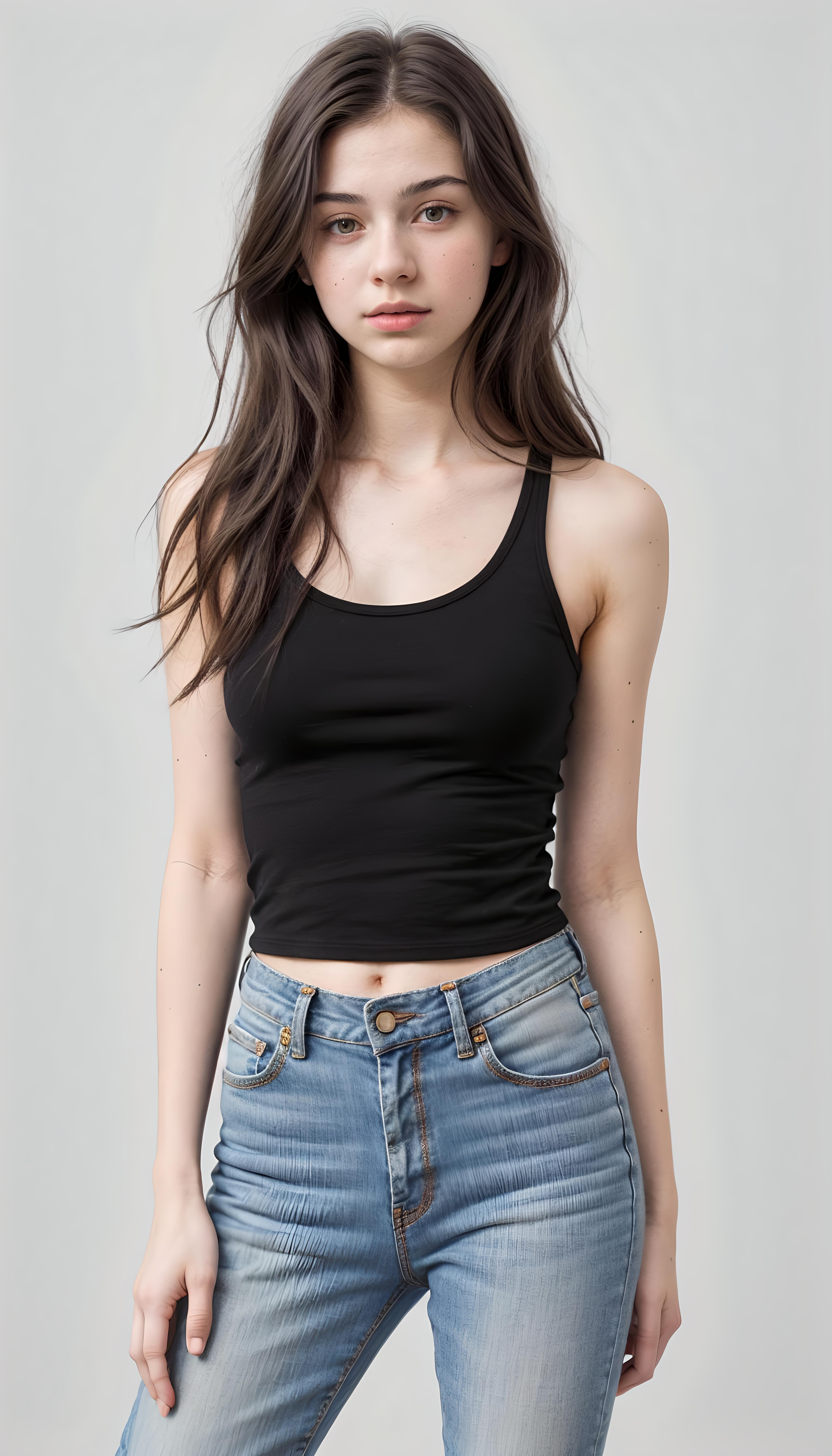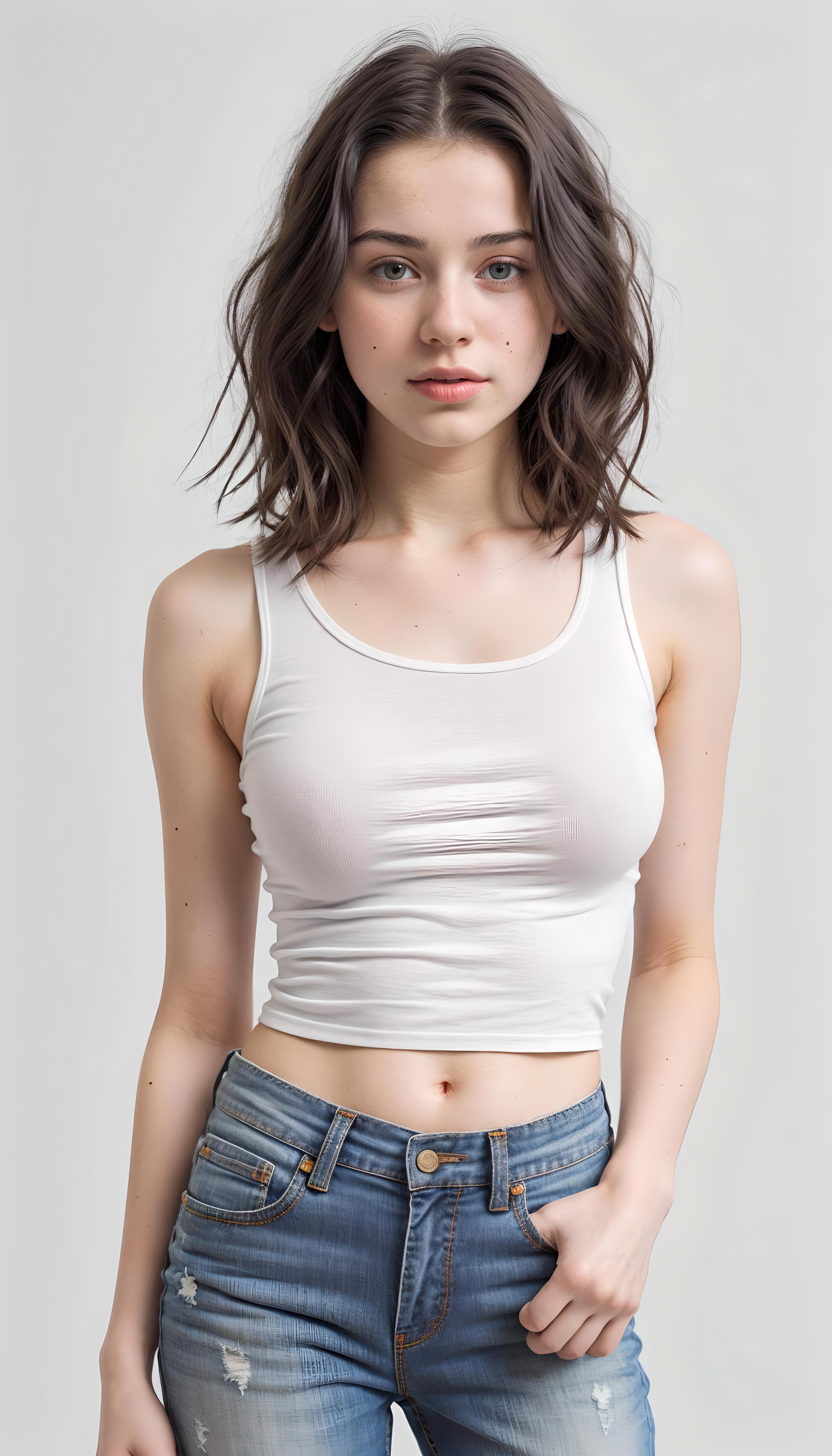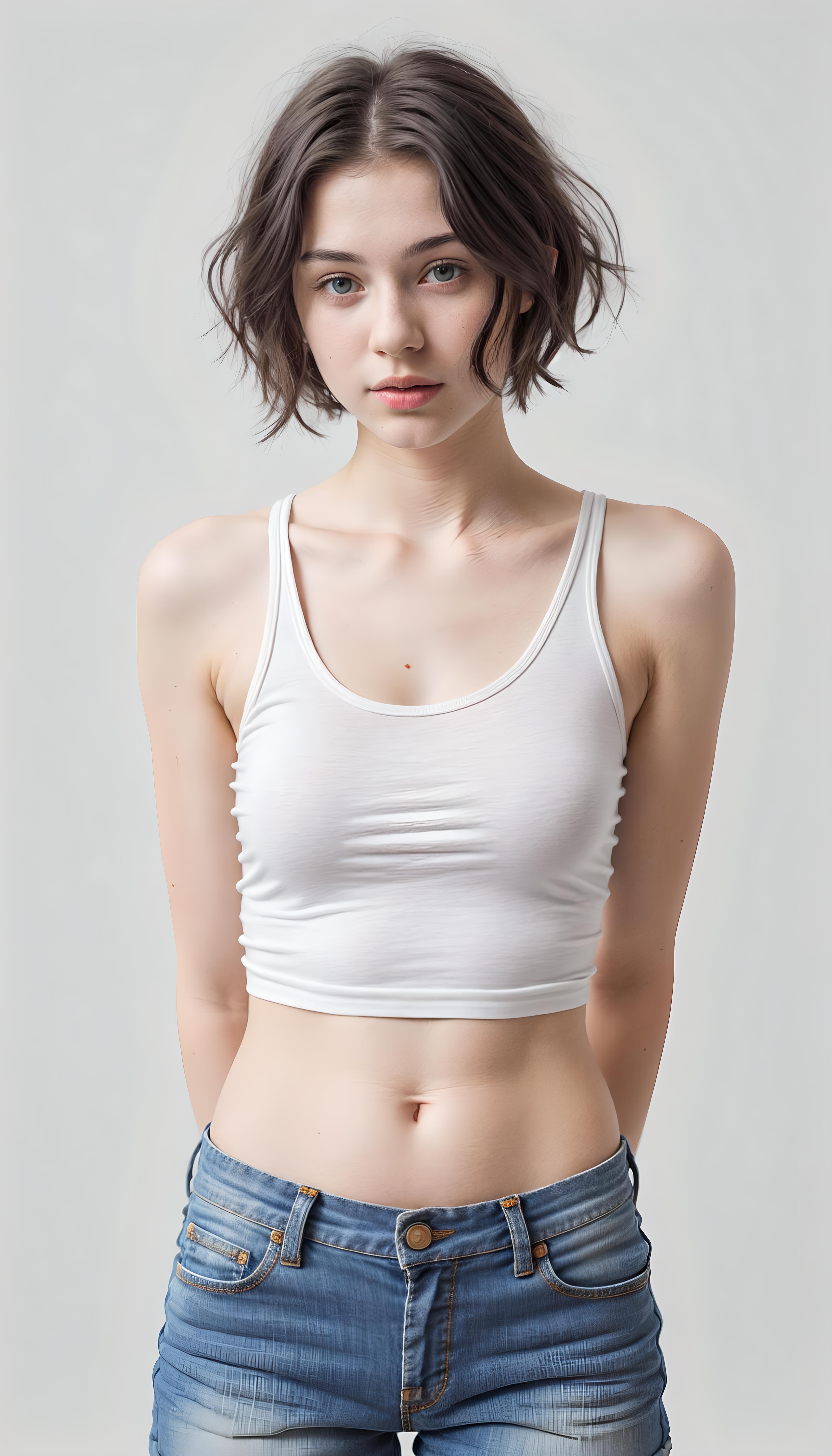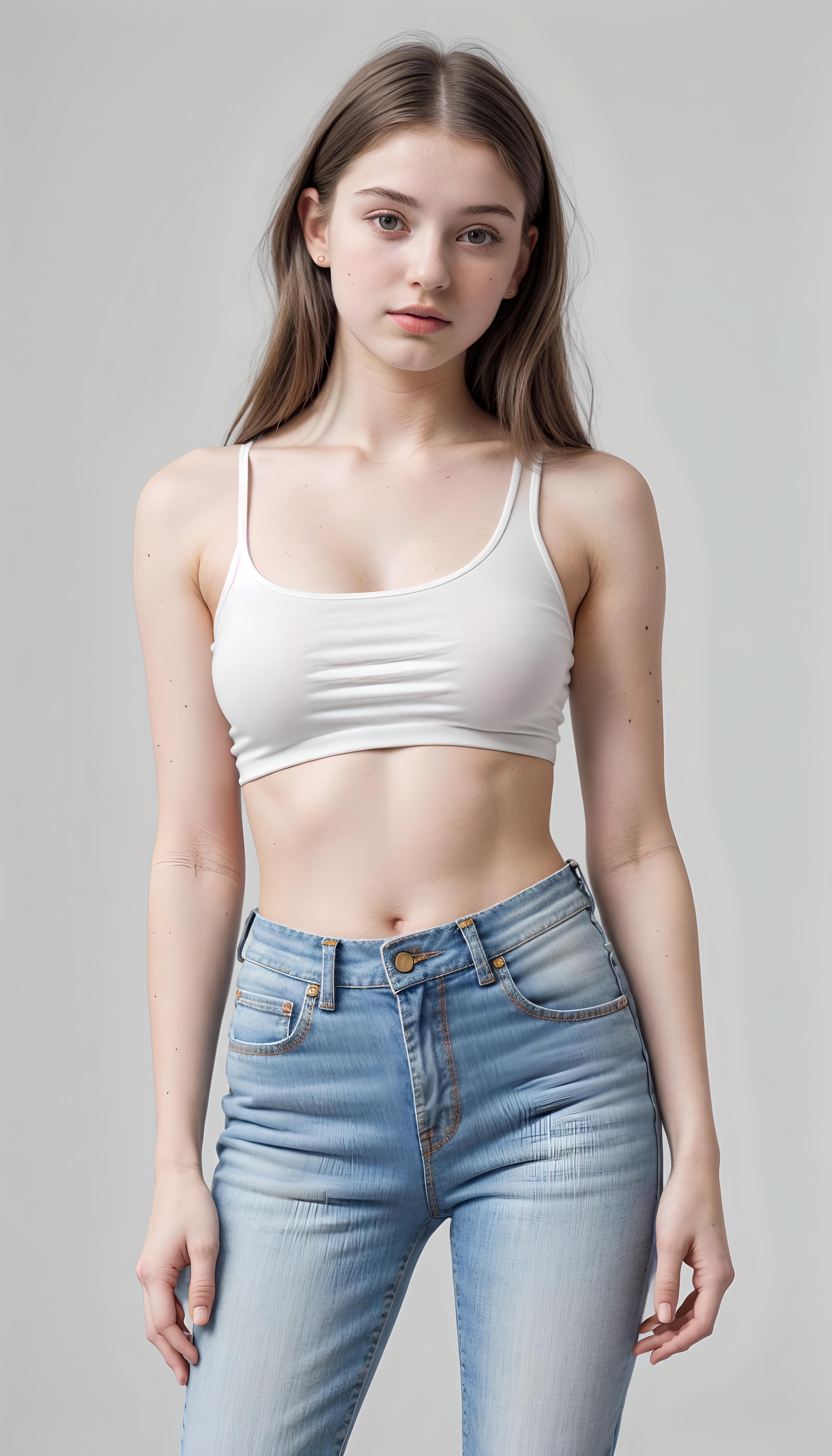 cute babe, 18 years old, thin crop top, short jeans pants, pose perfect, white background