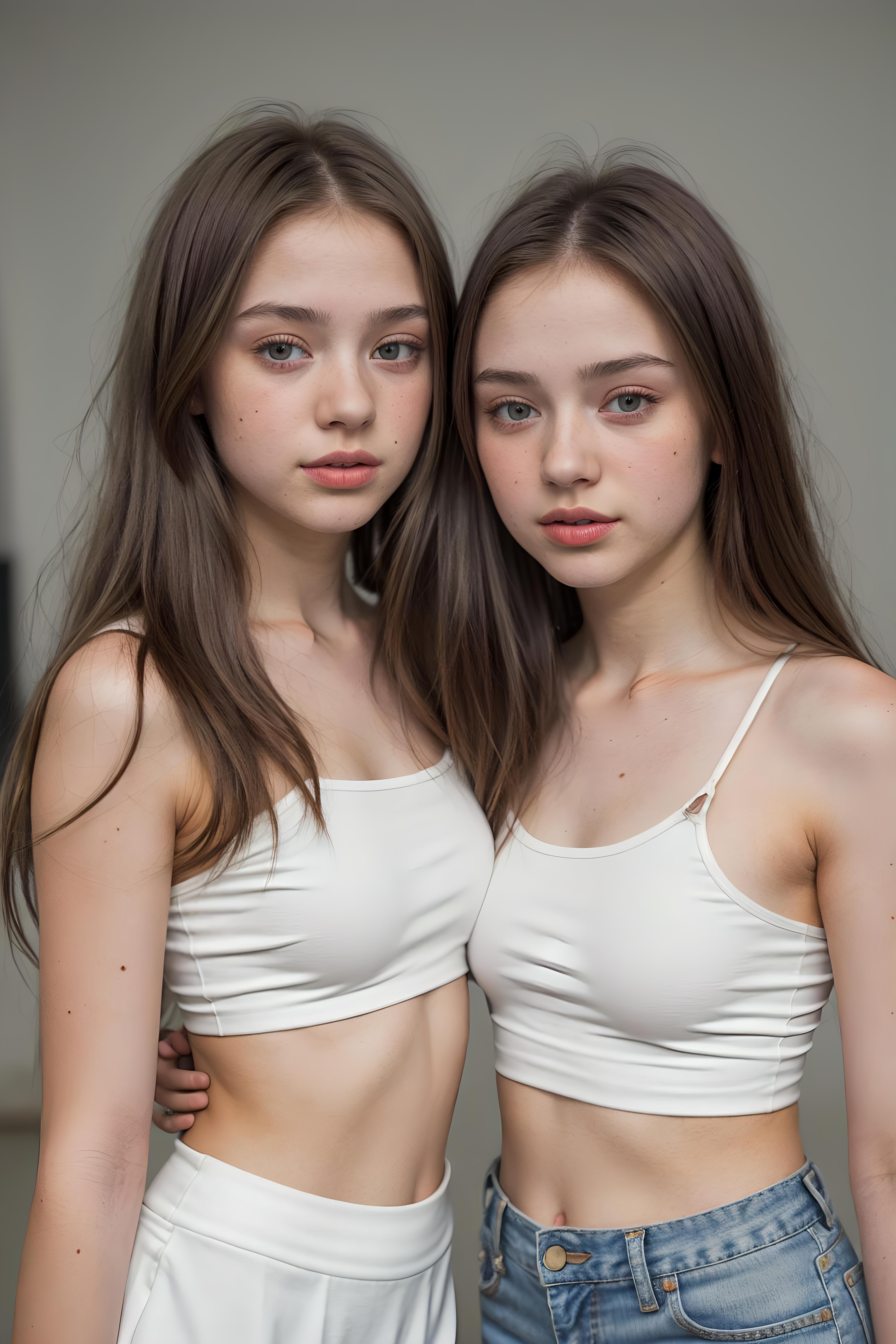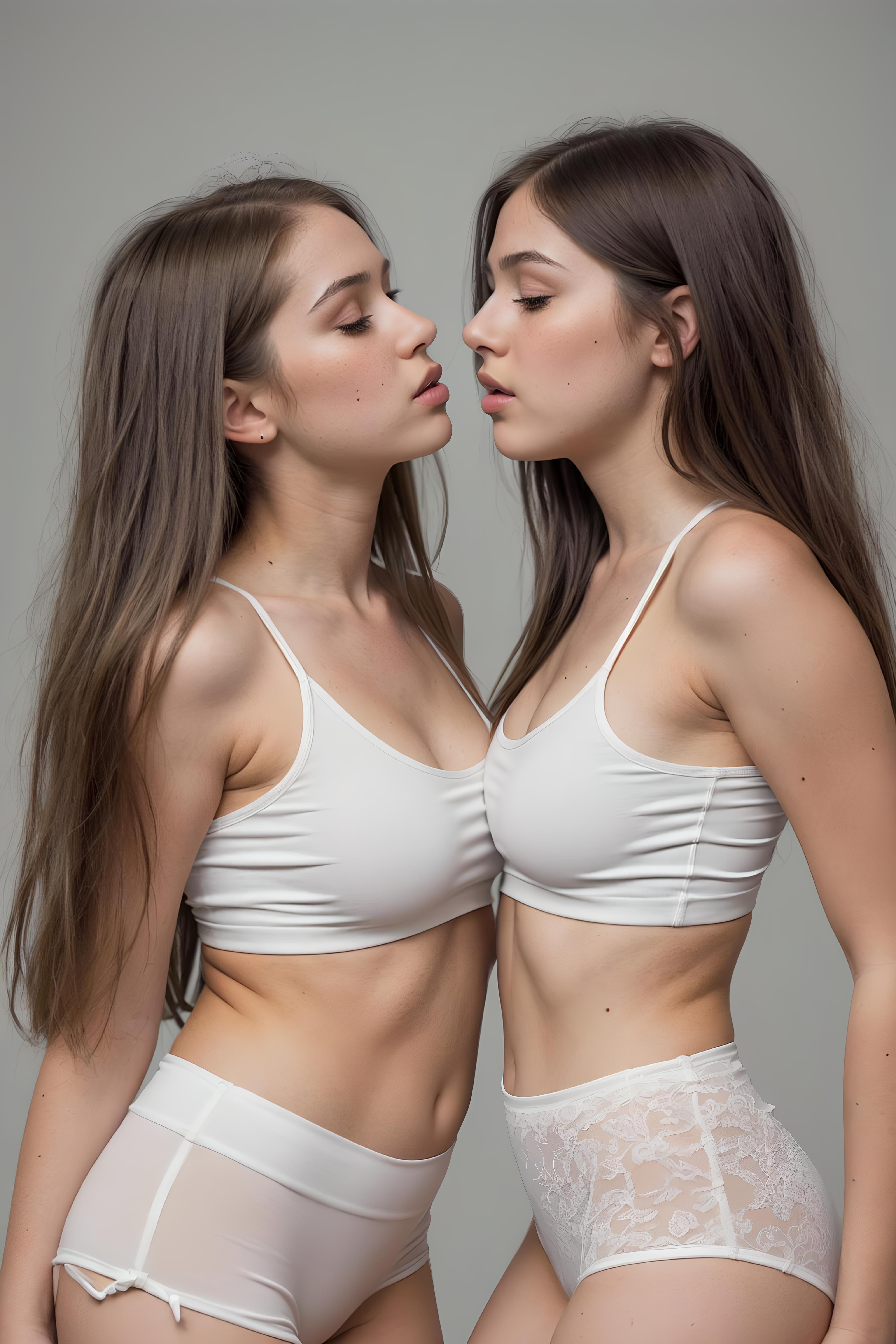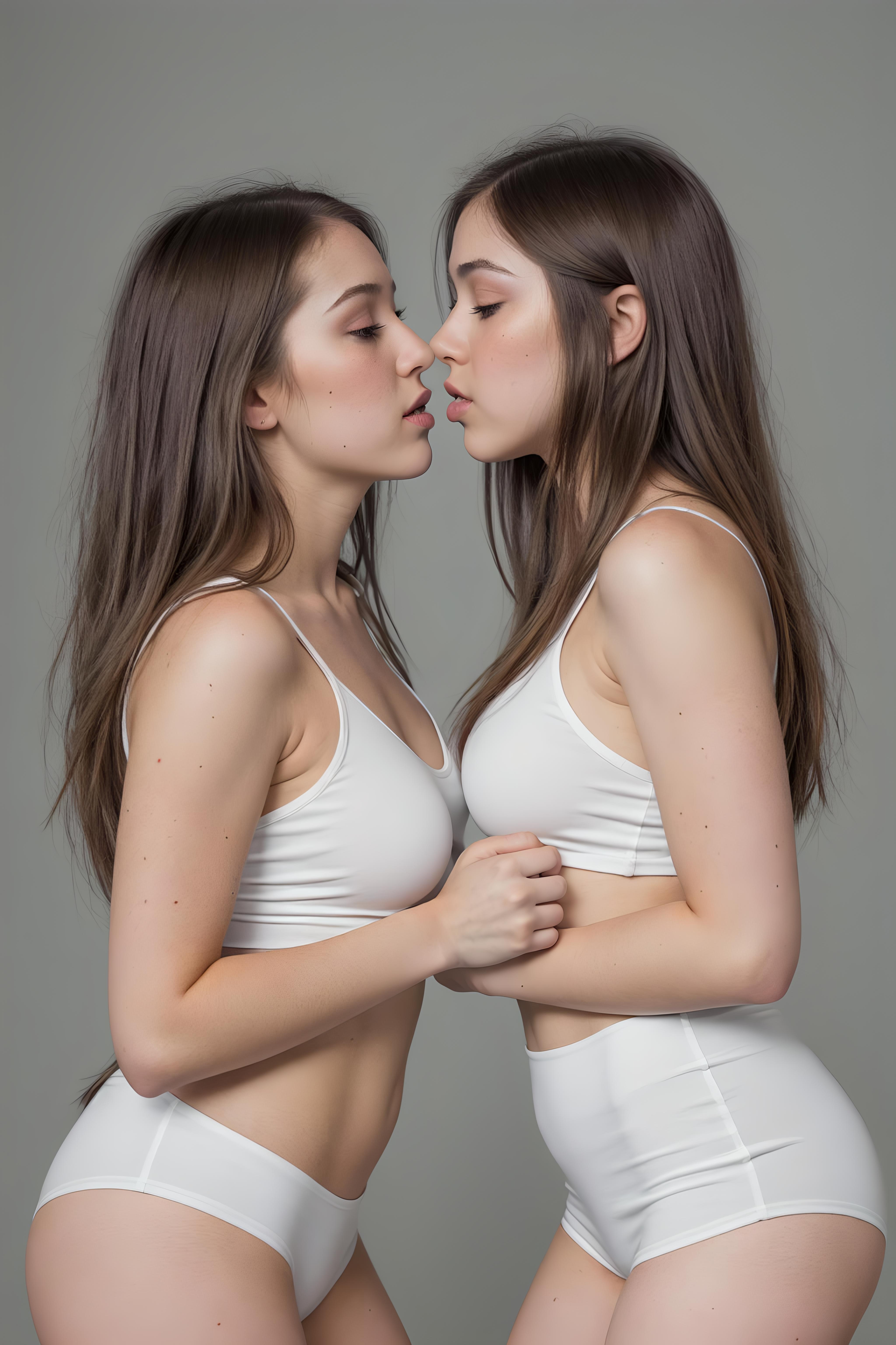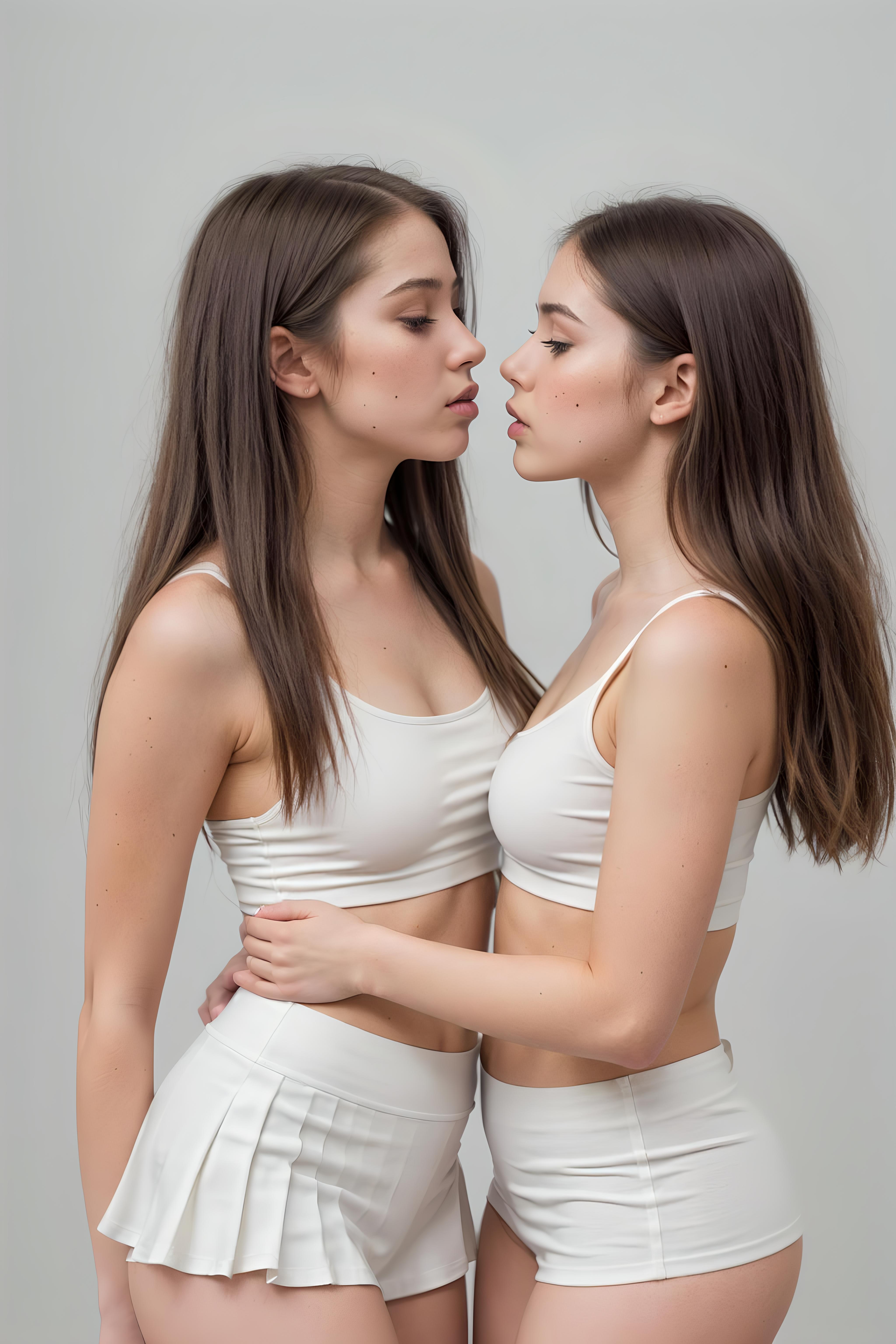 (((cute))) (((gorgeous))) ((female model)) ((stunning)) ((two very pretty young teen girls)), straight hair, perfect realistic body, dressed in a form-fitting low cut white crop top, super short mini skirt, ((about to a passionate kiss))