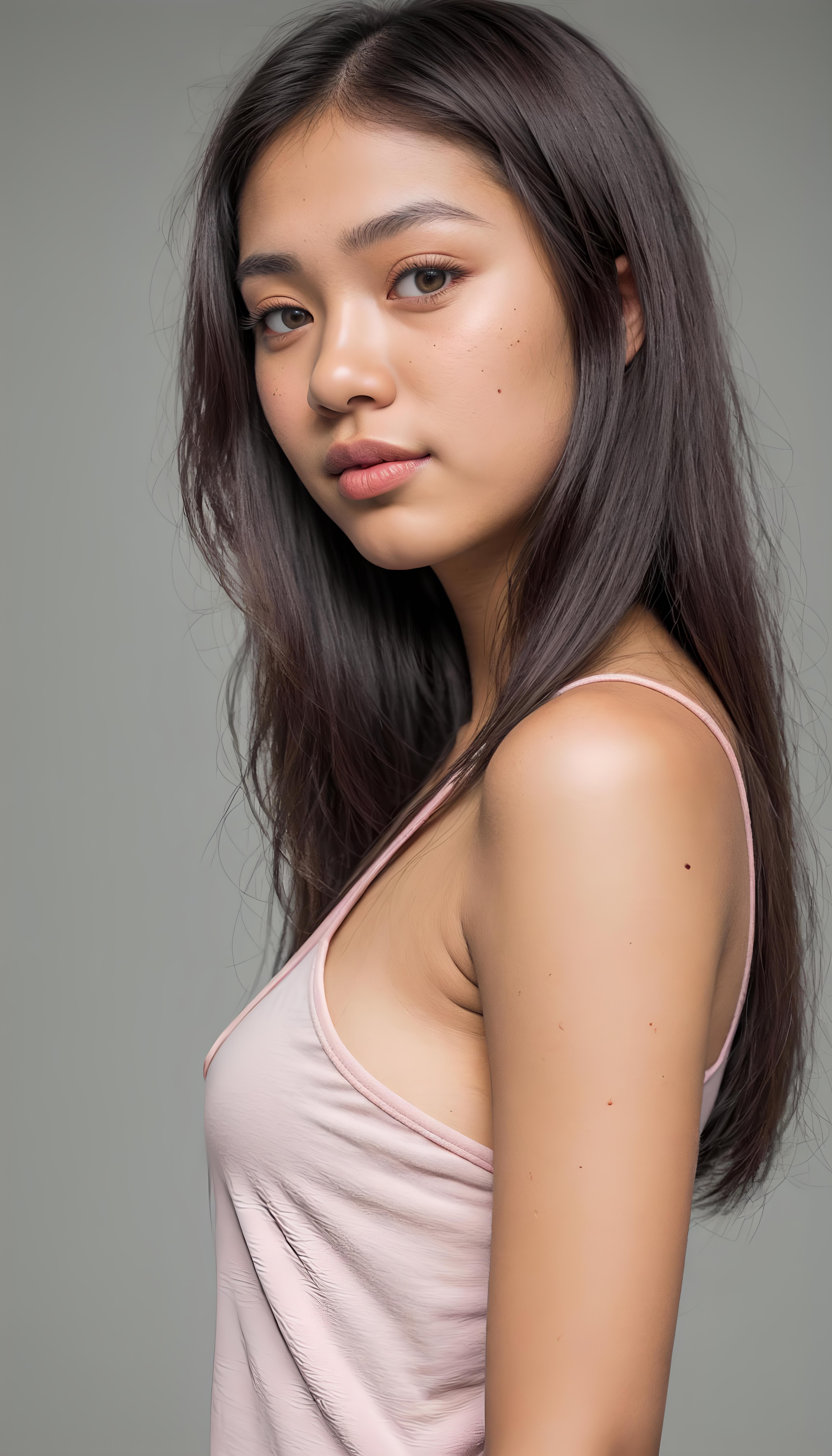 (((cute))) (((gorgeous))) ((stunning)) ((female model)) (upper body), (side view), (best quality, masterpiece), deep shadow, depth of field, photo with beautiful saturation, ultra high resolution, cute 18 years old Indonesian teen girl, detailed straight hair, white short tank top, perfect curved body, ultra realistic face, realistic amber eyes, looking at viewer, warm smile ((pink lips))