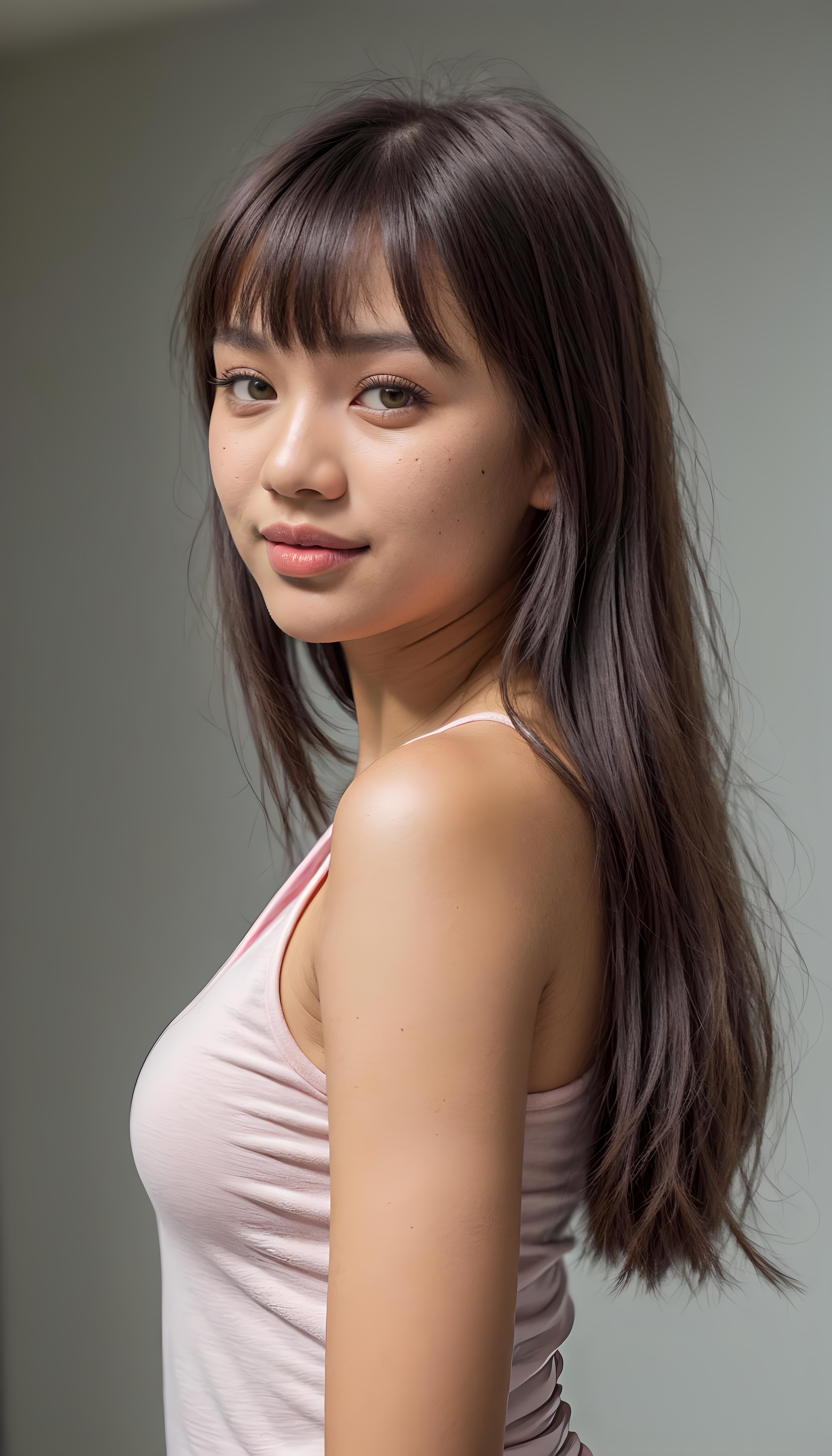 (((cute))) (((gorgeous))) ((stunning)) ((female model)) (upper body), (side view), (best quality, masterpiece), deep shadow, depth of field, photo with beautiful saturation, ultra high resolution, cute 18 years old Filipino teen girl, Korea styled bangs, detailed straight hair, white short tank top, perfect curved body, ultra realistic face, realistic amber eyes, looking at viewer, warm smile ((pink lips))