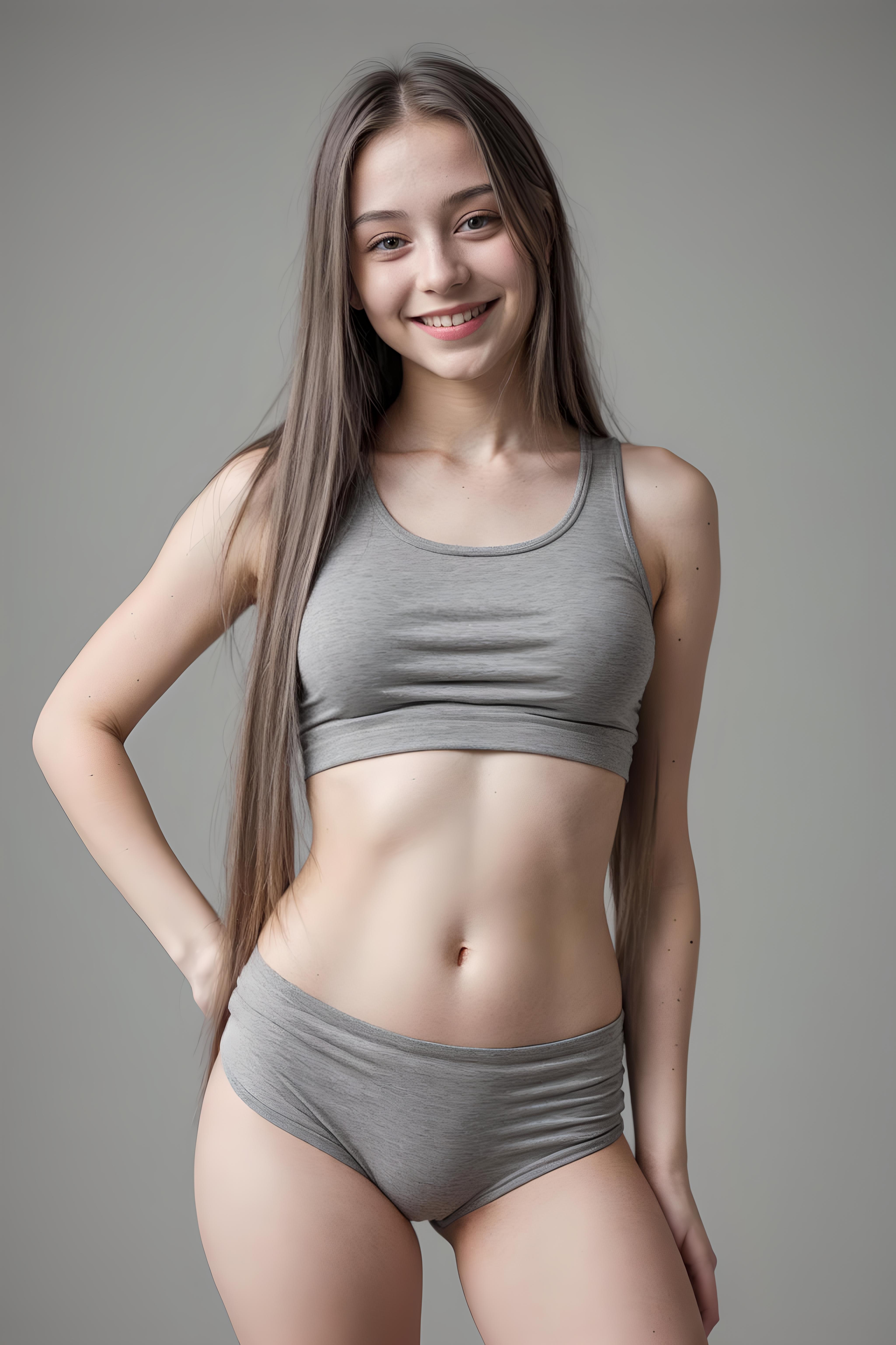portrait of a cute young girl, wears a grey crop top, smile, long straight hair, perfect curved body, grey short shorts, front view