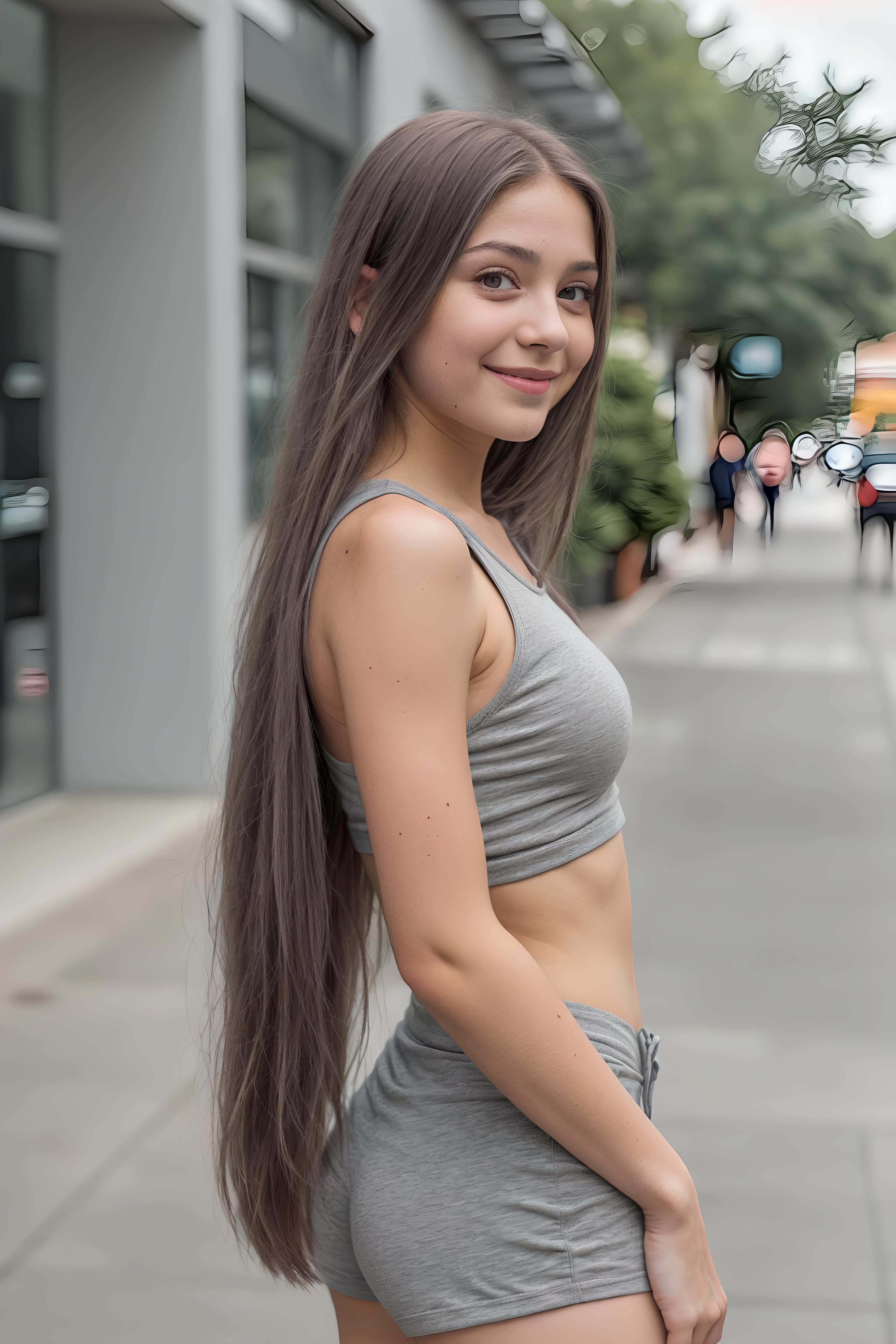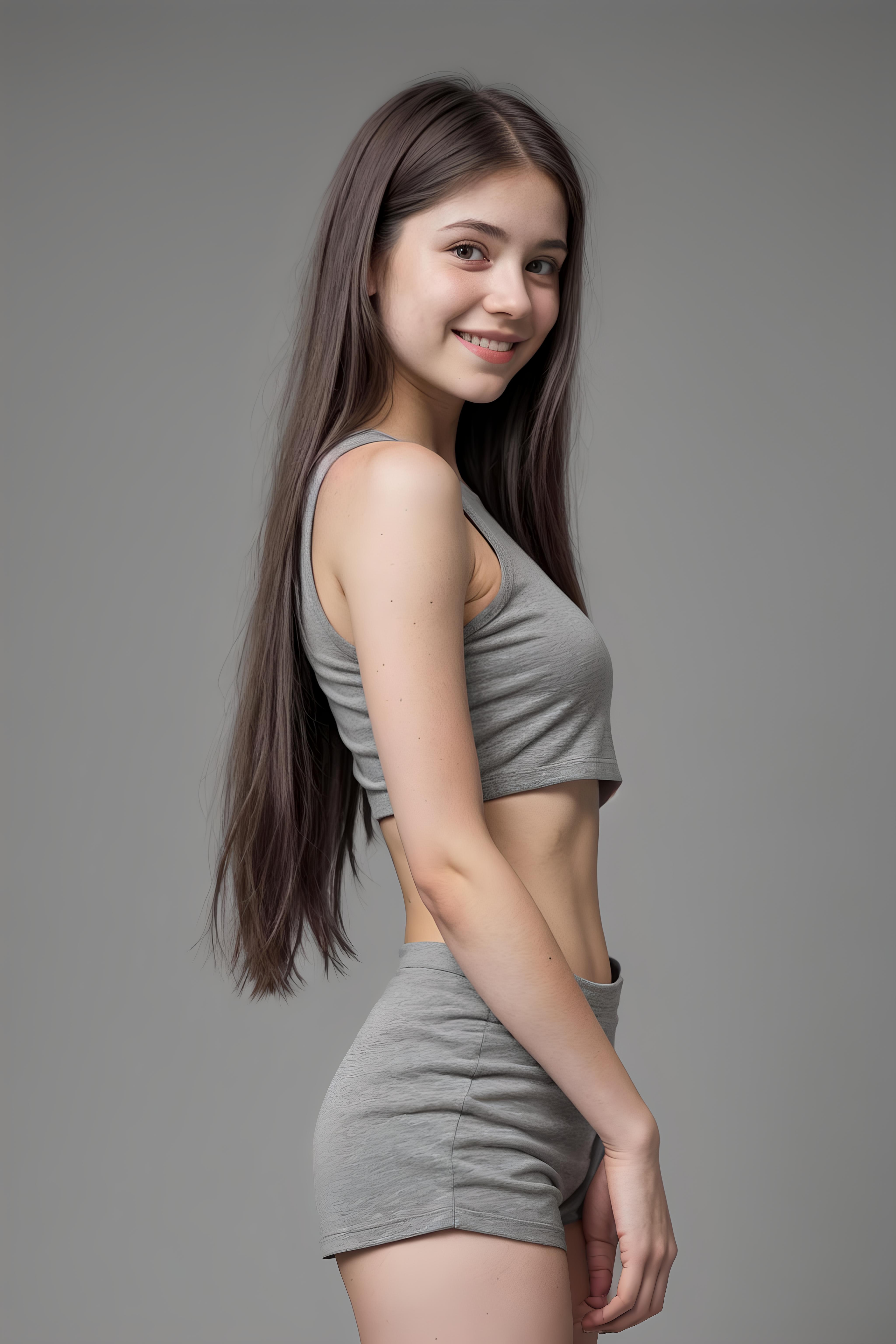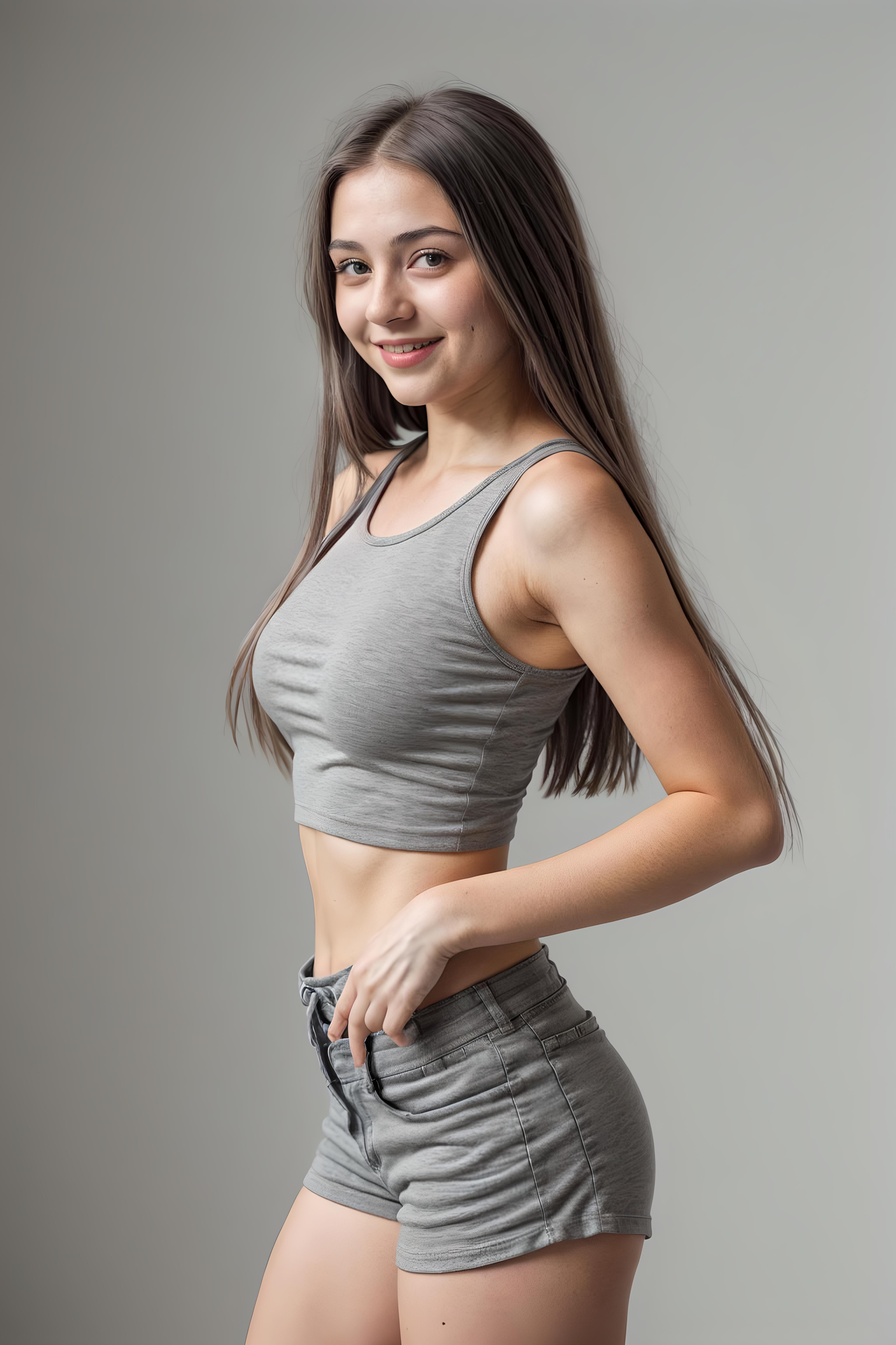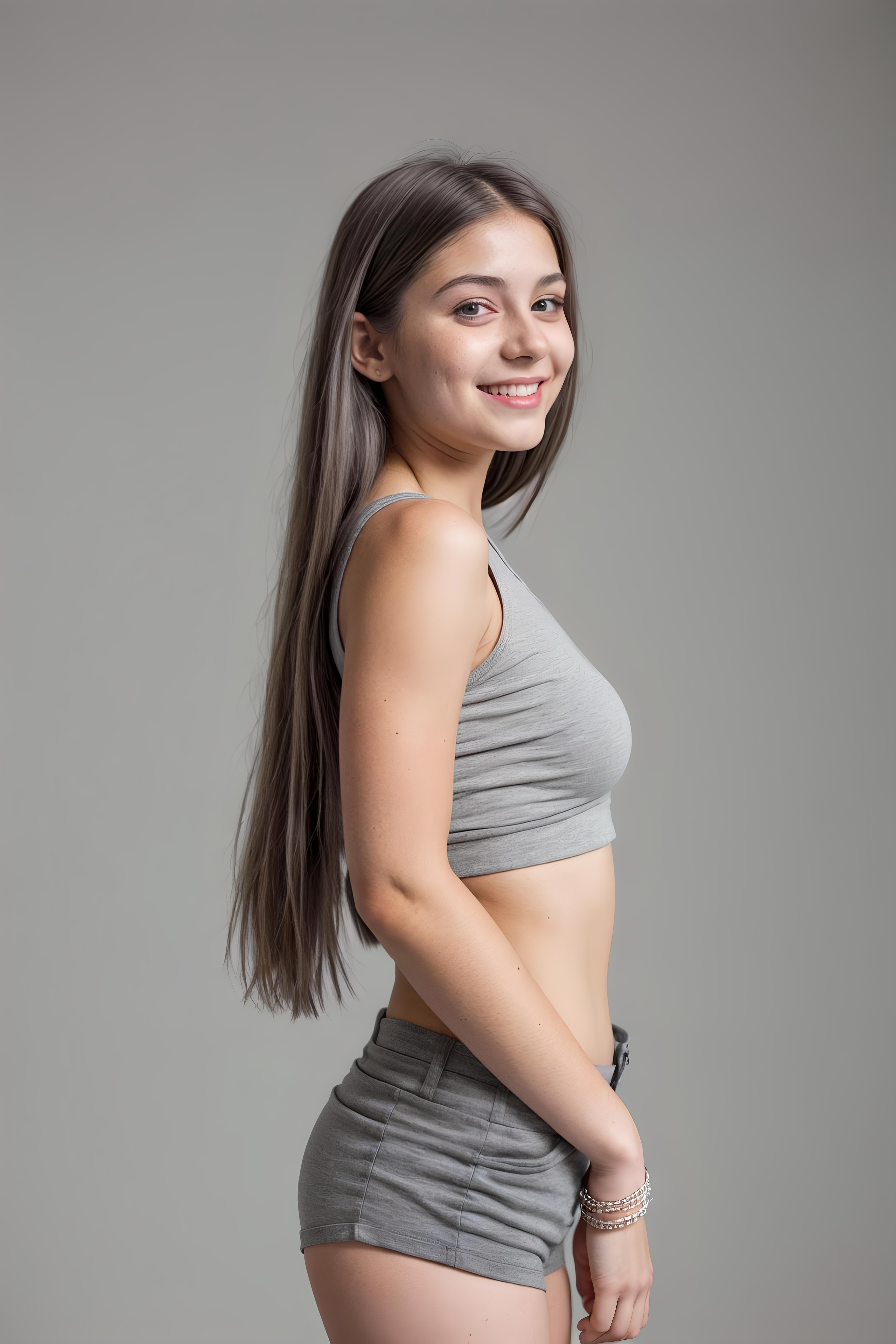 portrait of a cute young girl, wears a grey crop top, smile, long straight hair, perfect curved body, grey short shorts, side view