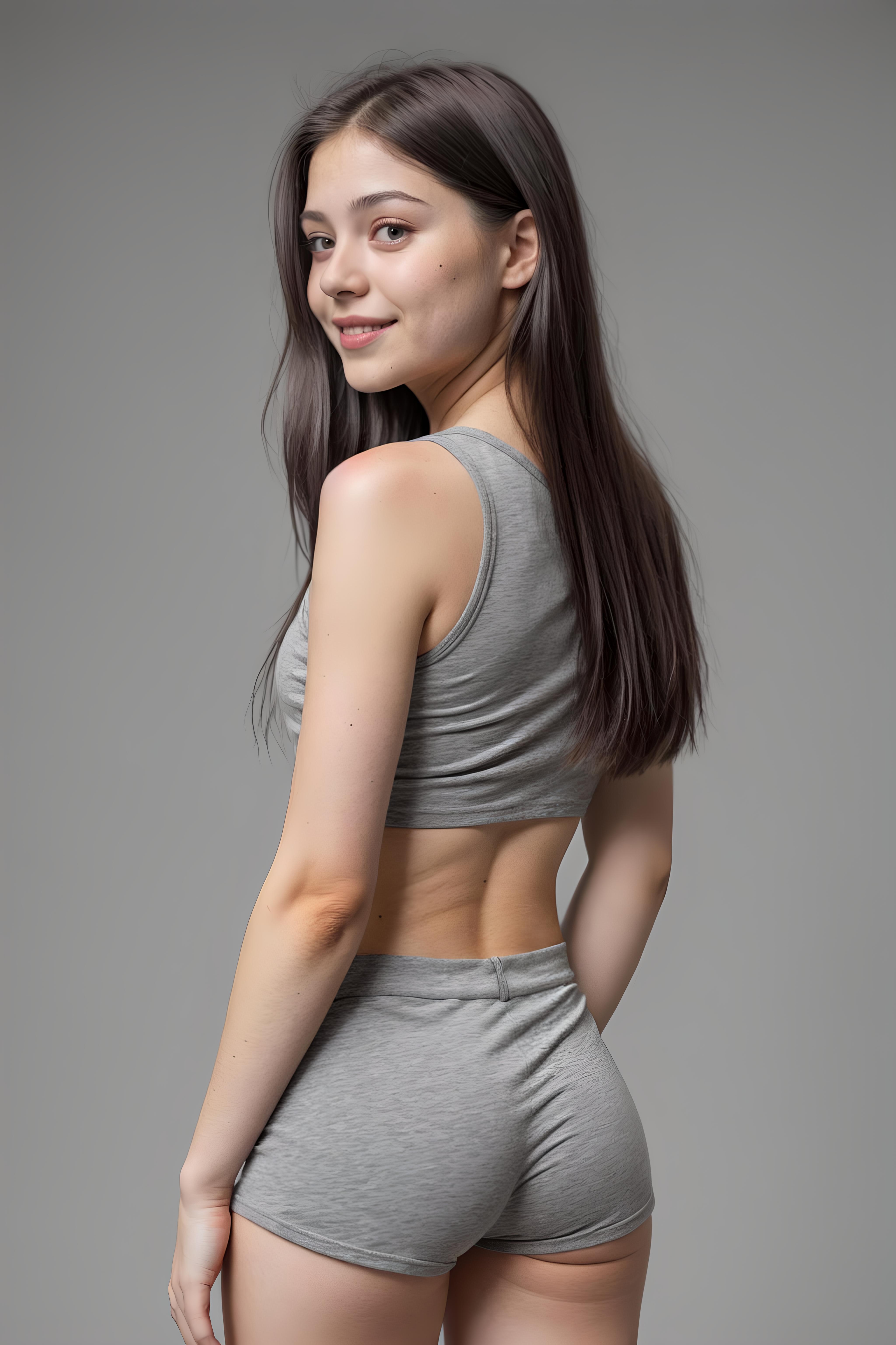 portrait of a cute young girl, wears a grey crop top, smile, long straight hair, perfect curved body, grey short shorts, back view