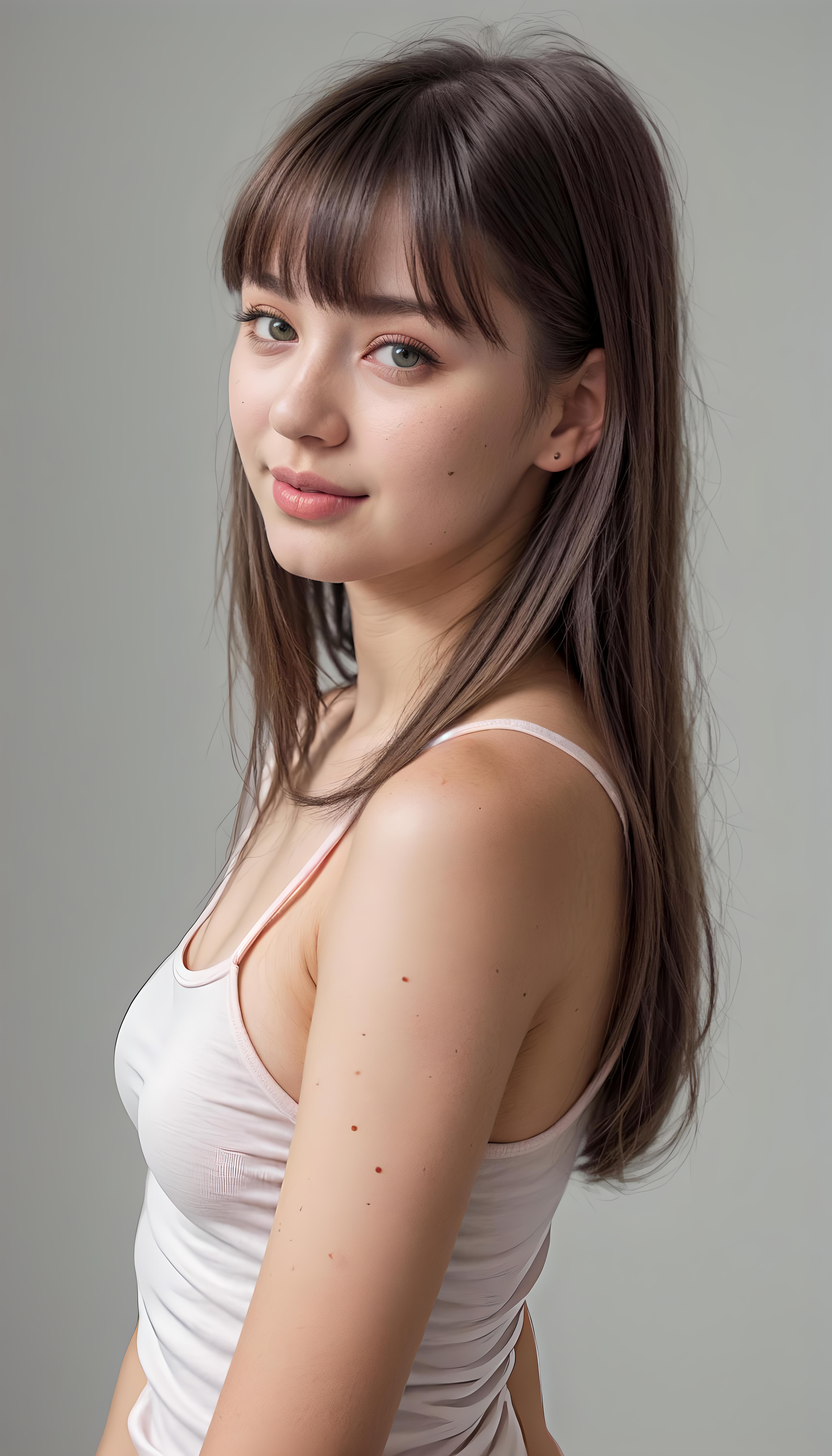 (((cute))) (((gorgeous))) ((stunning)) ((female model)) (upper body), (side view), (best quality, masterpiece), deep shadow, depth of field, photo with beautiful saturation, ultra high resolution, cute 18 years old teen girl, Korea styled bangs, detailed straight hair, white short tank top, perfect curved body, ultra realistic face, realistic amber eyes, looking at viewer, warm smile ((pink lips))