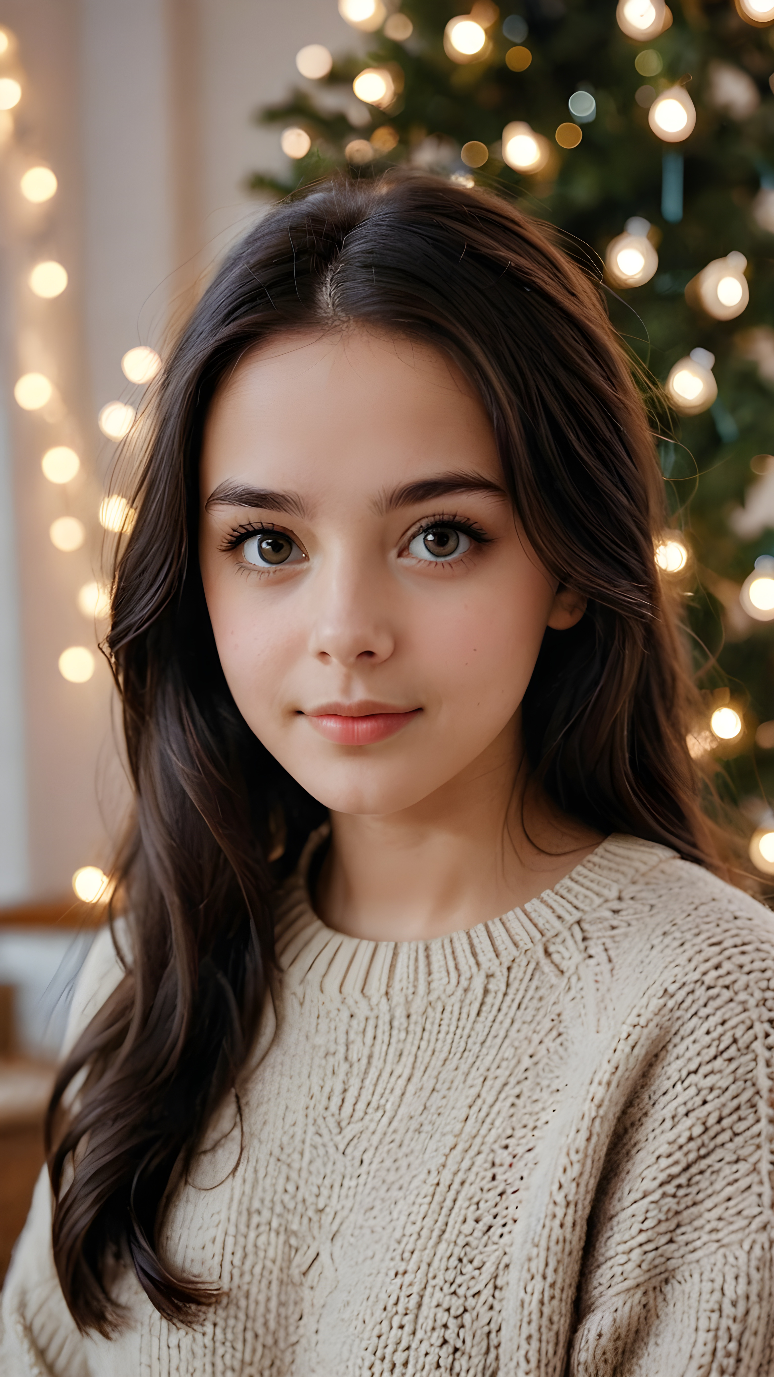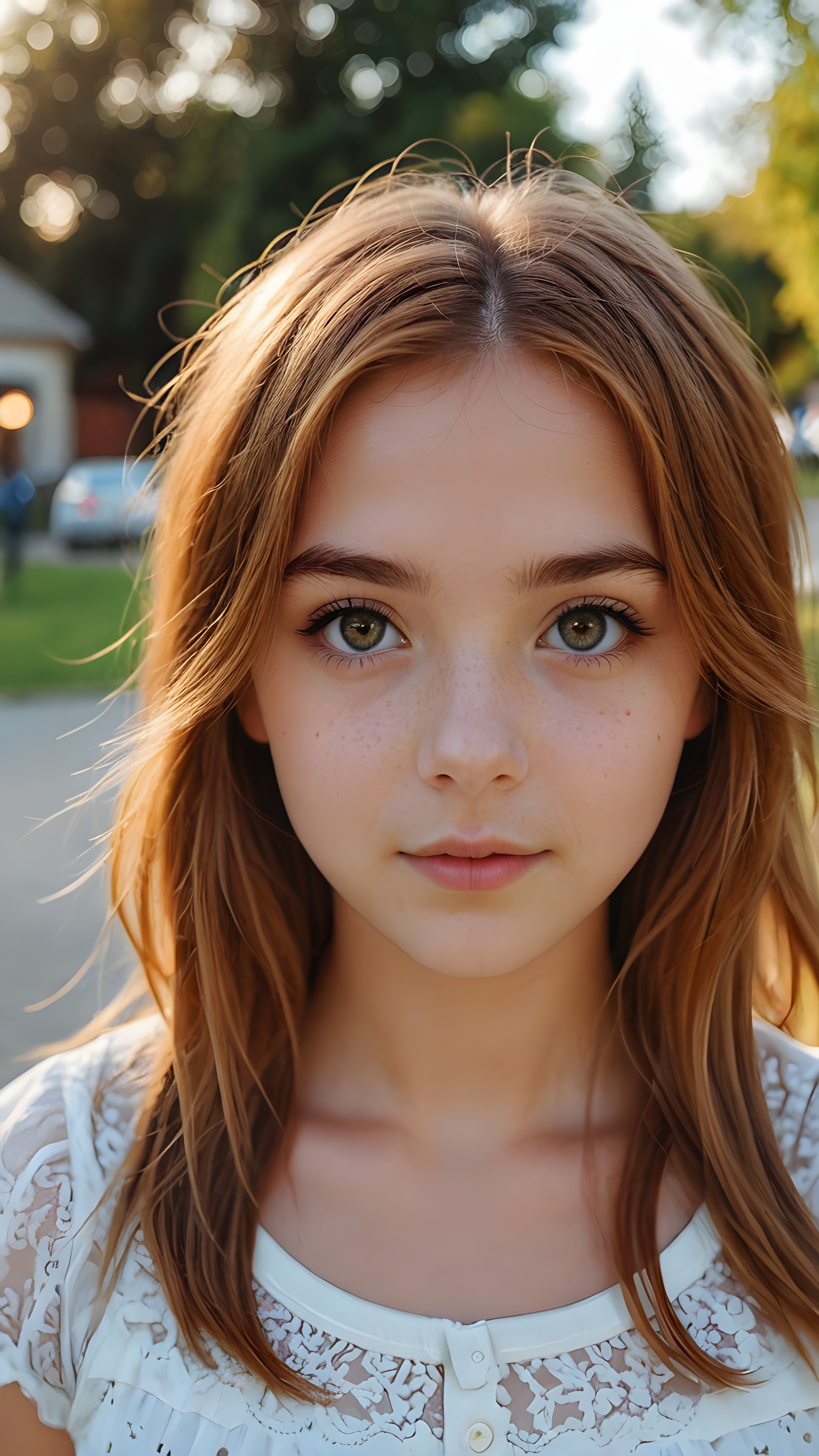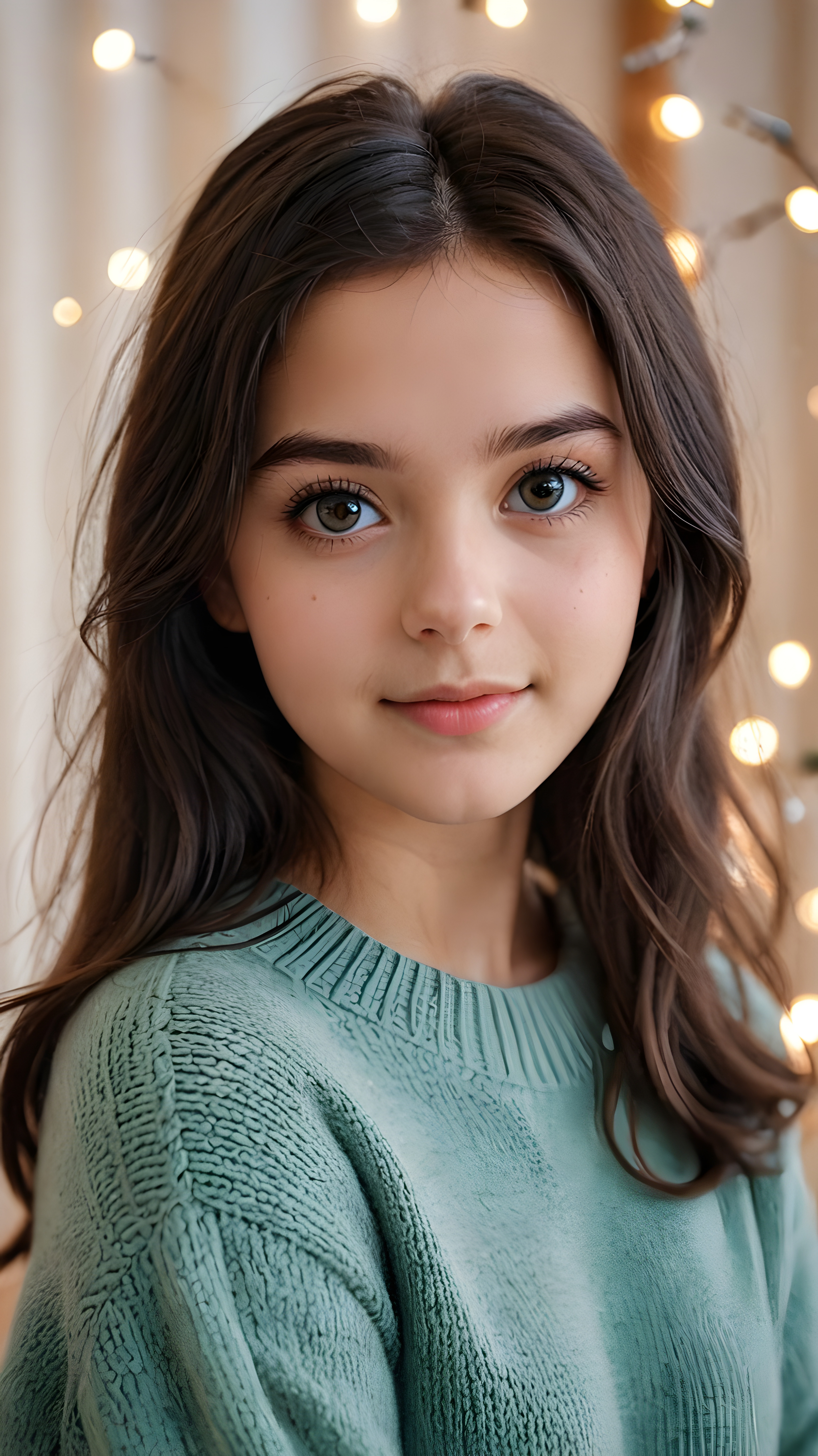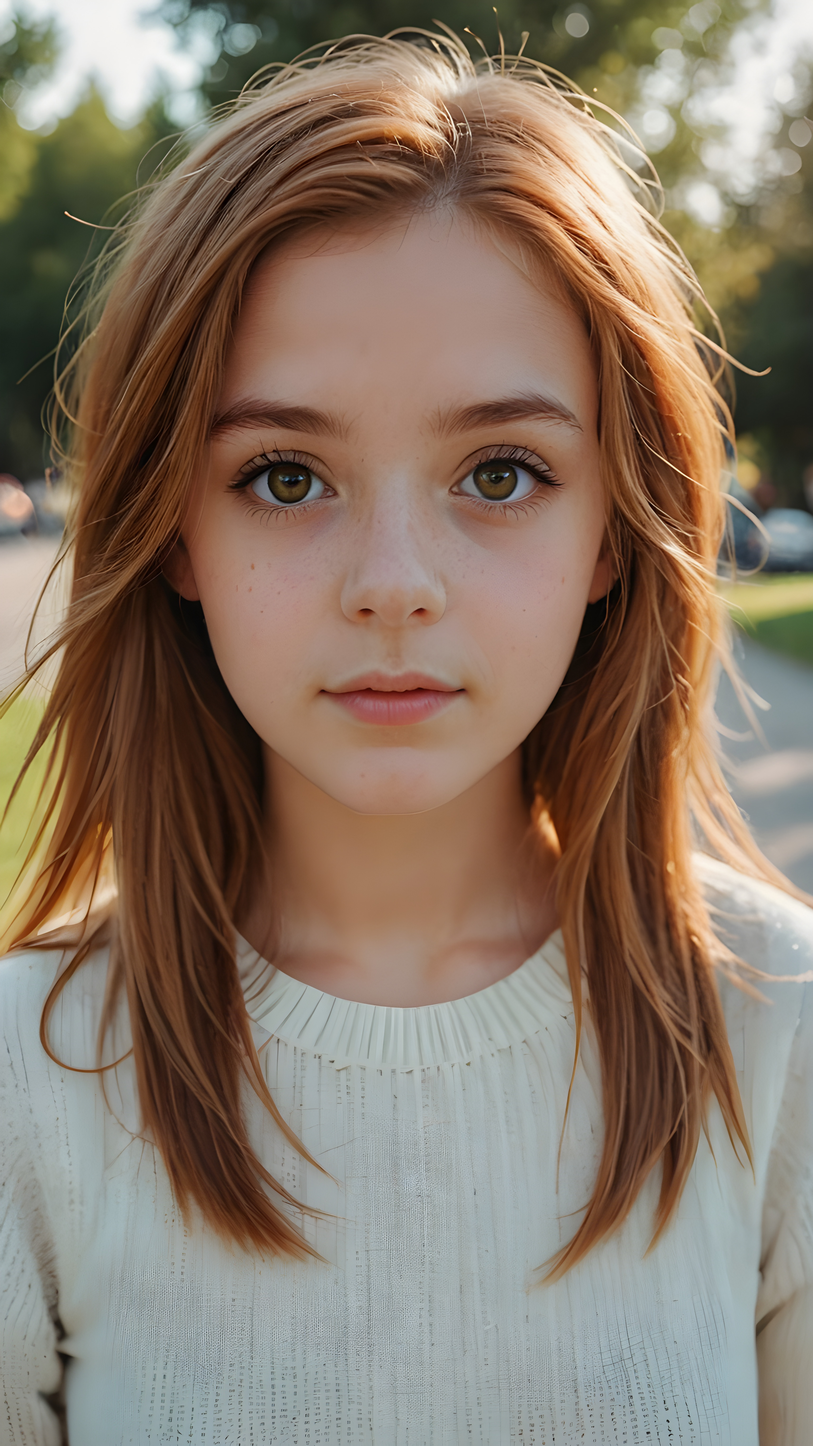 a beautiful young teen girl with amber hair and big saucer eyes looks sweetly into the camera