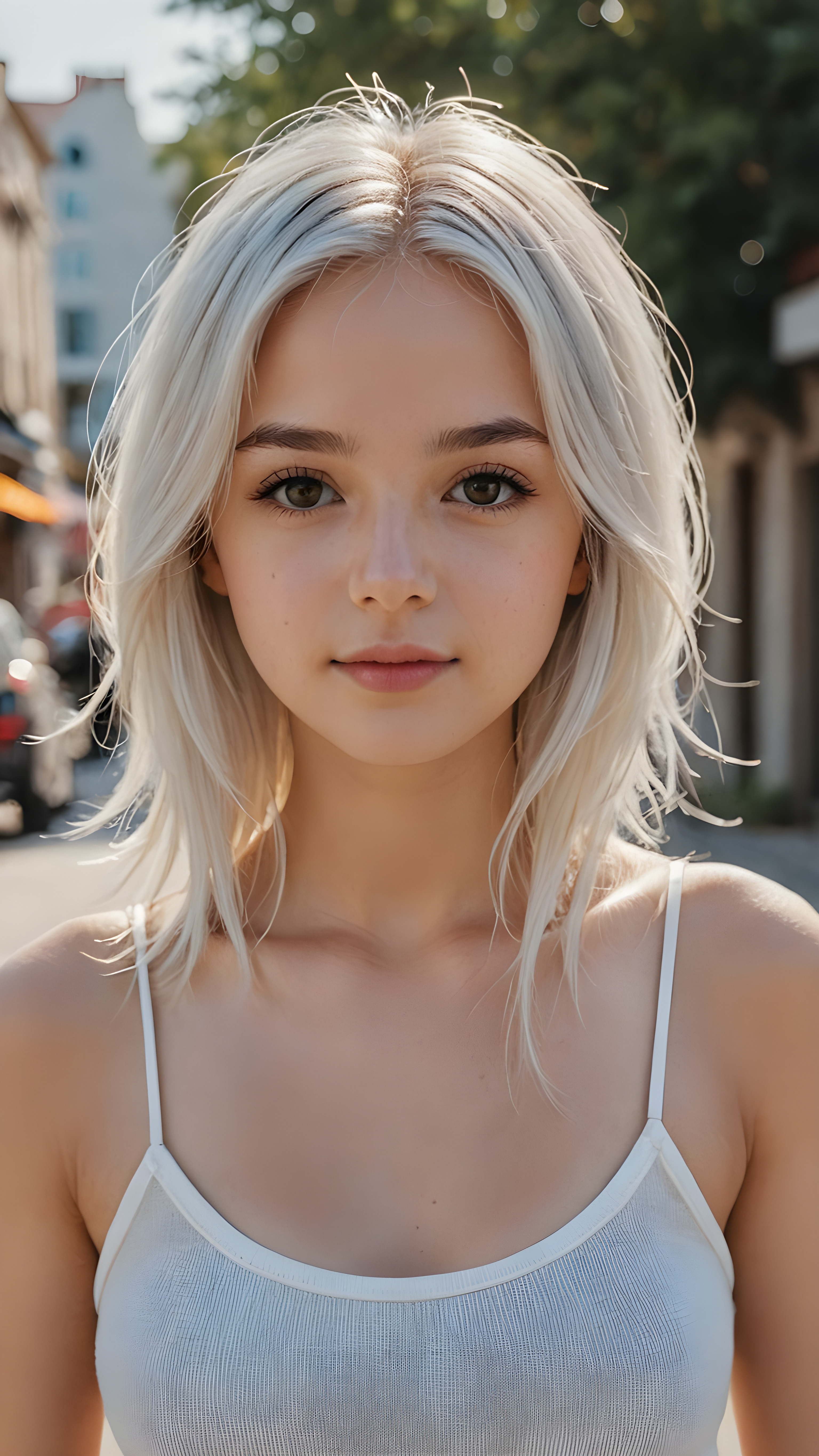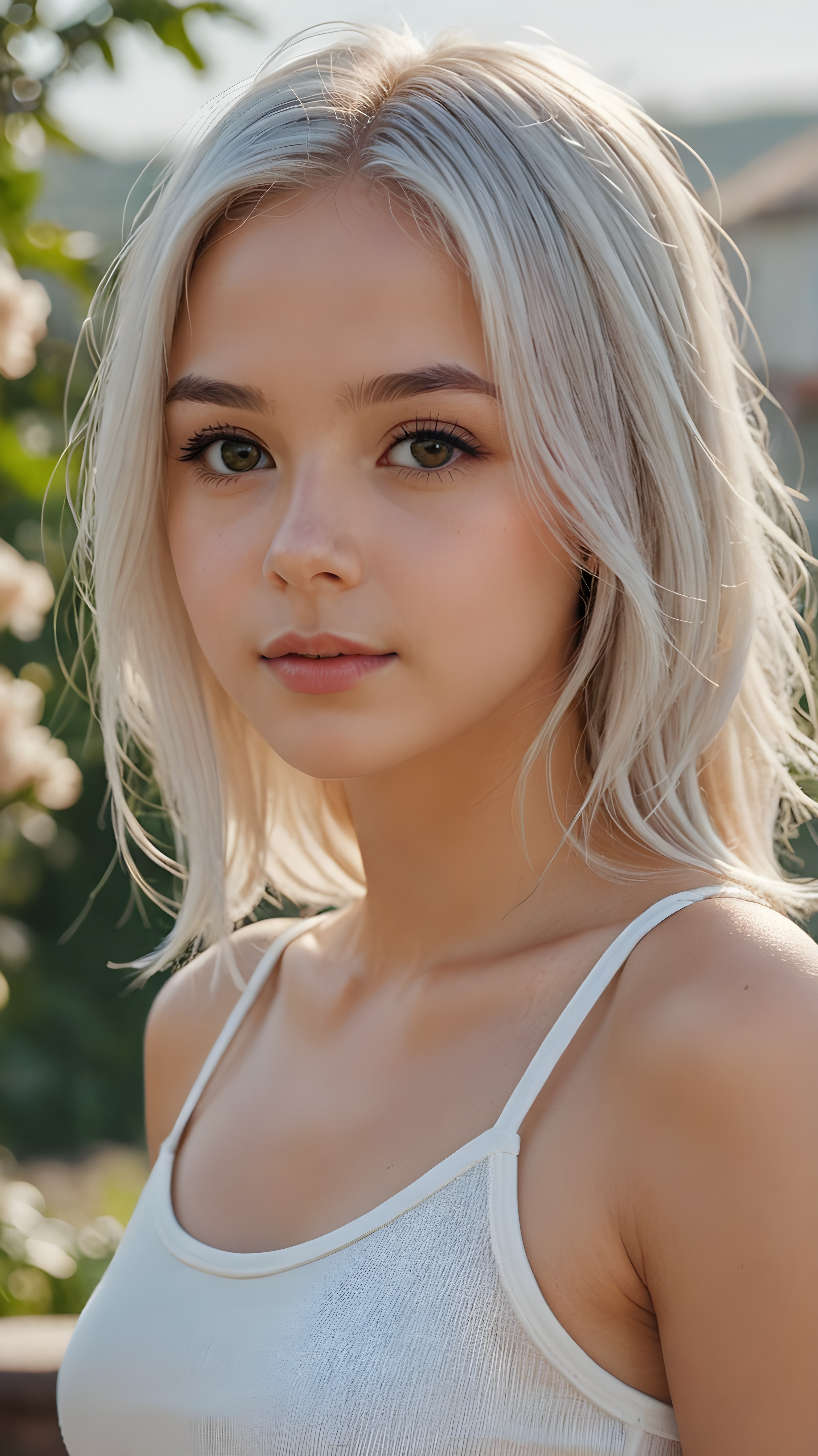 detailed and realistic photo from a very young girl, soft straight jet white hair, close up, thin dressed in a spaghetti tank top, perfect body