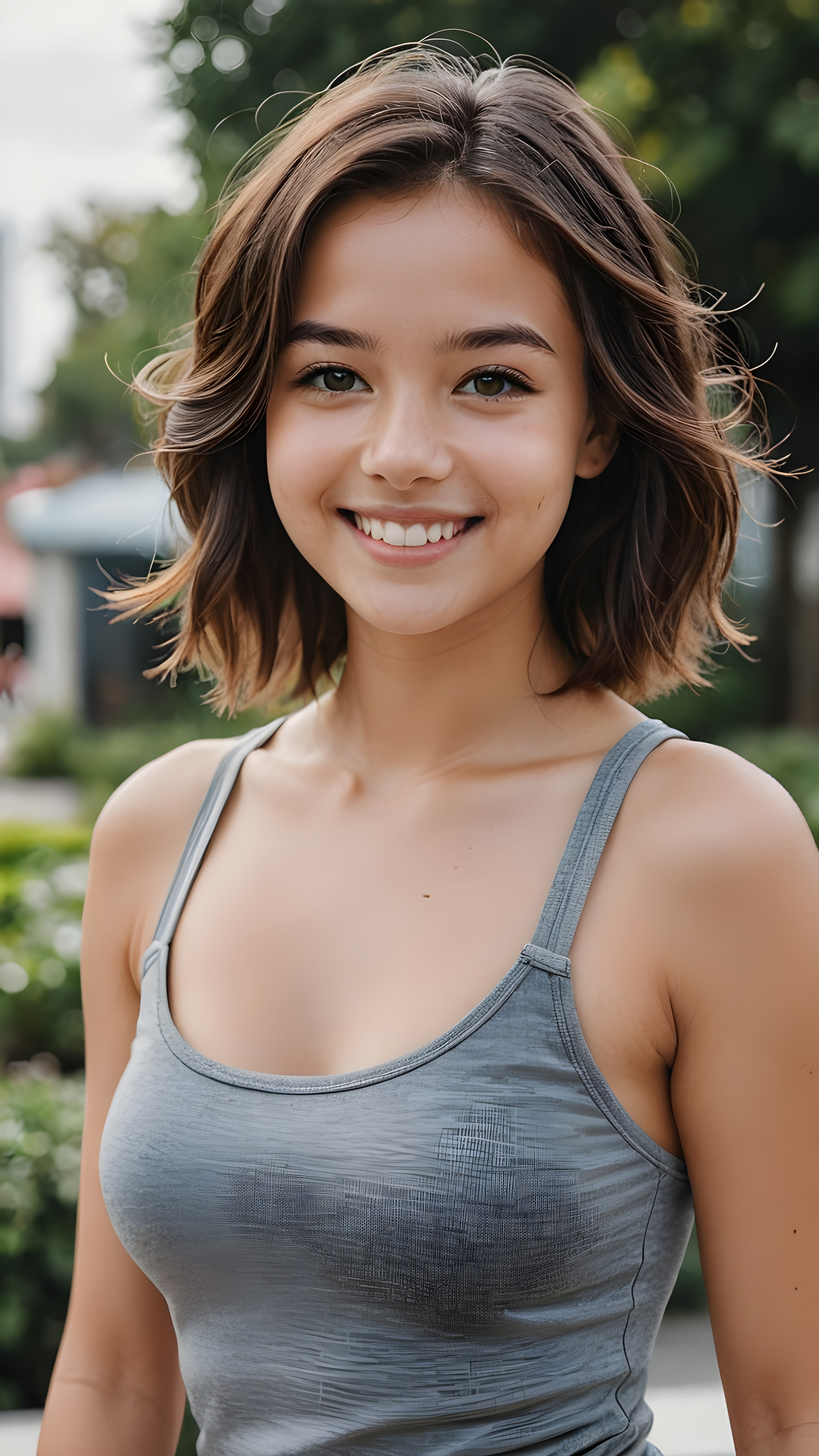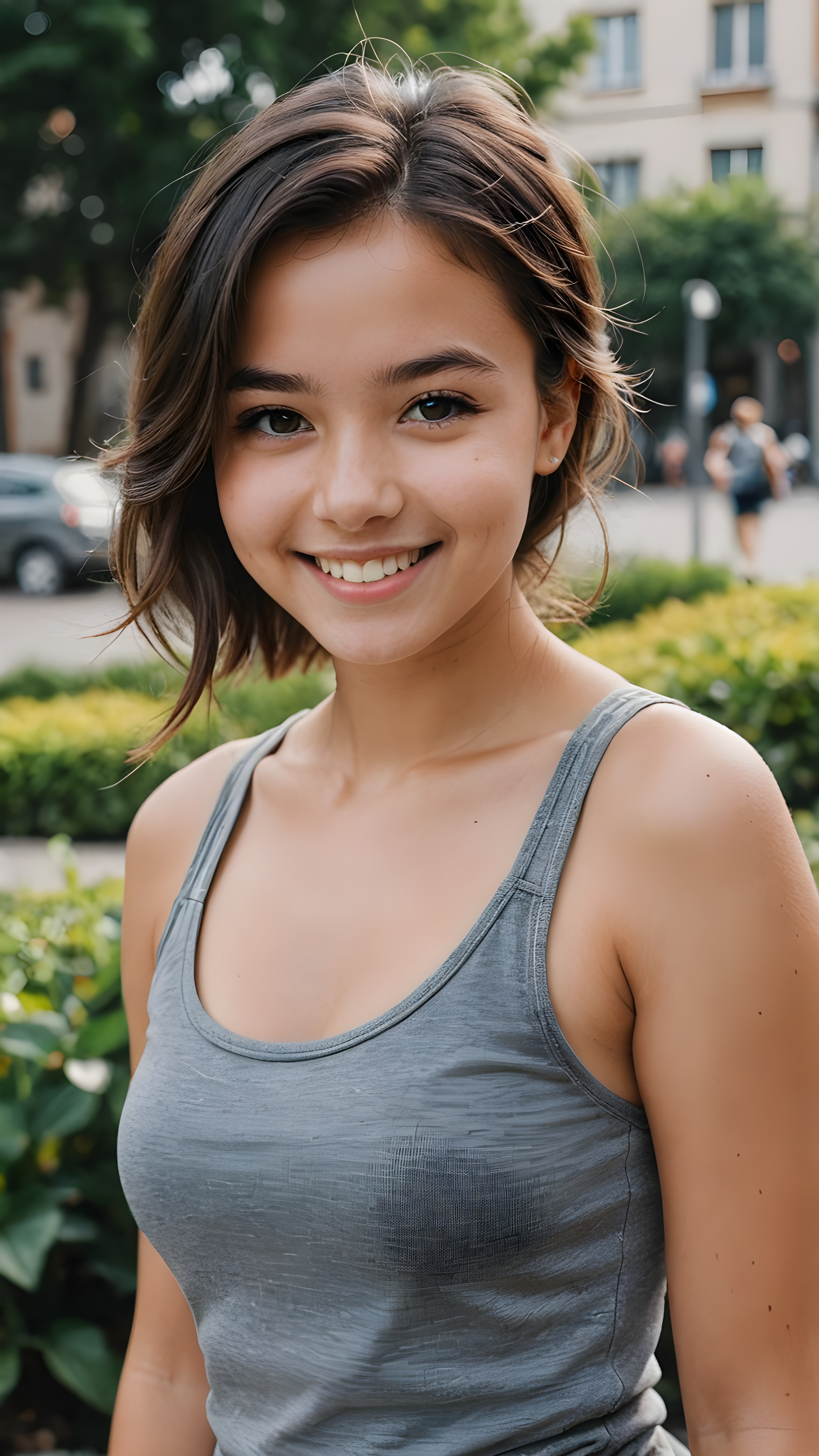 portrait, a young cute girl, perfect curved body, grey tank top, smile