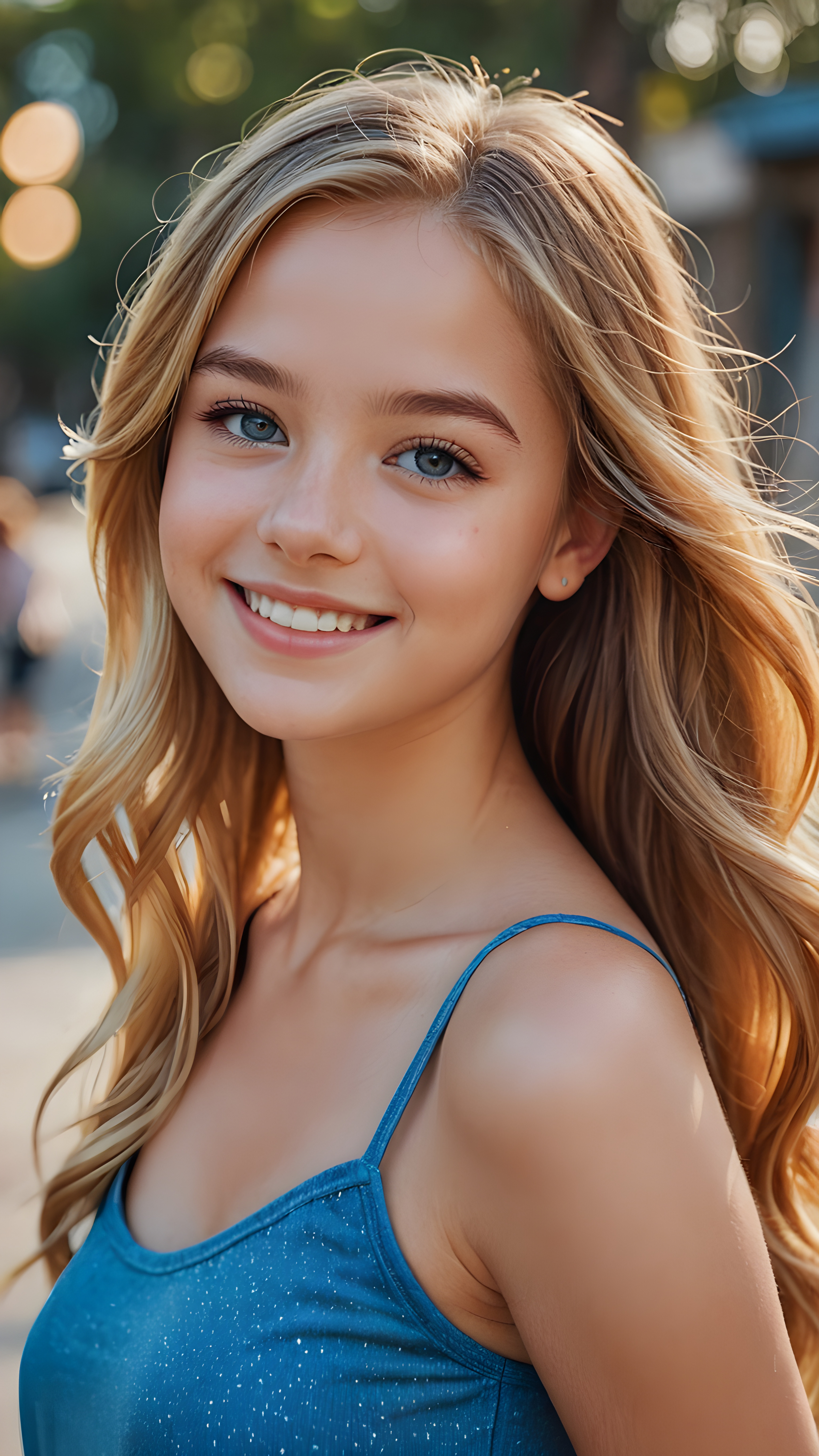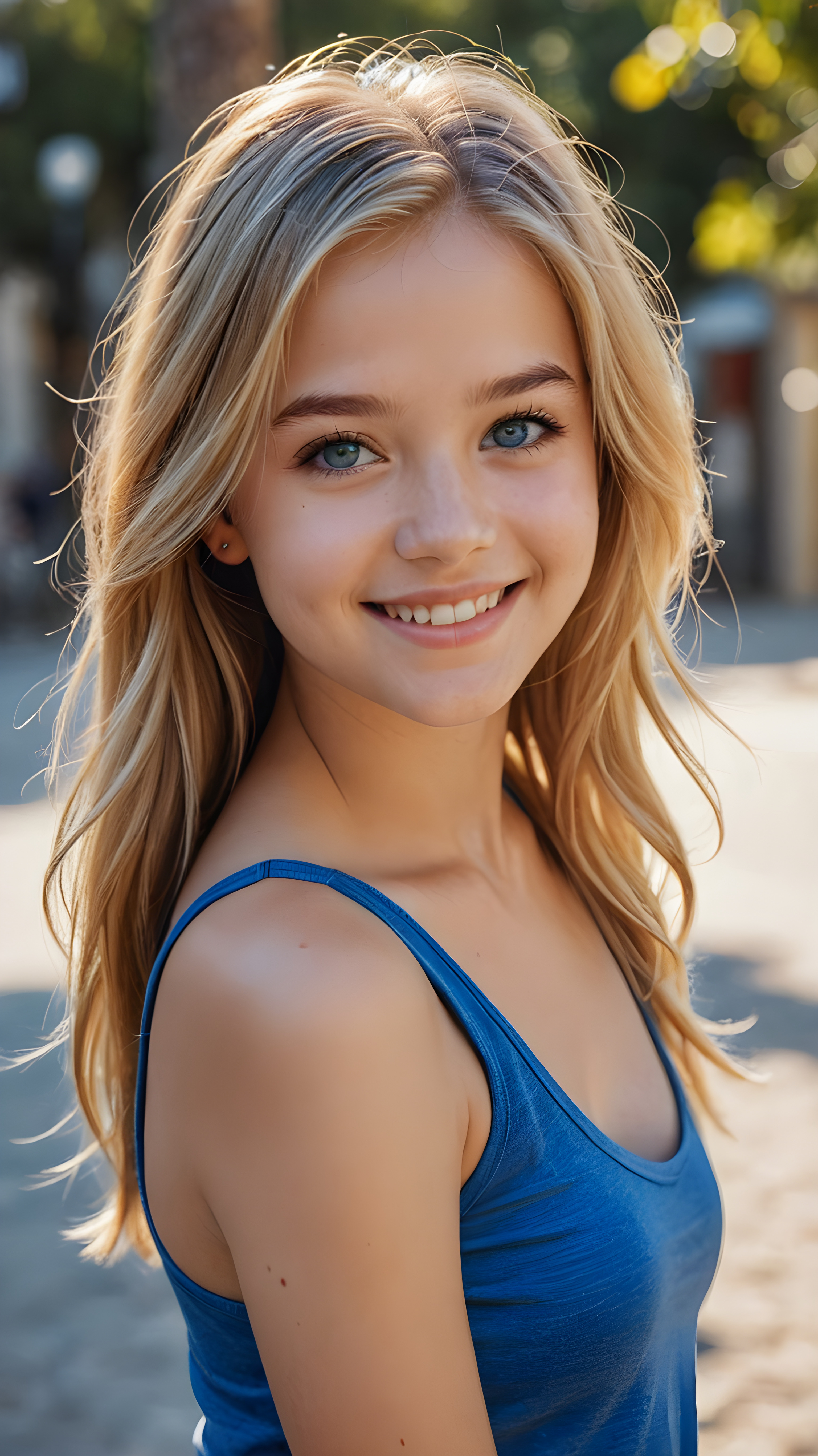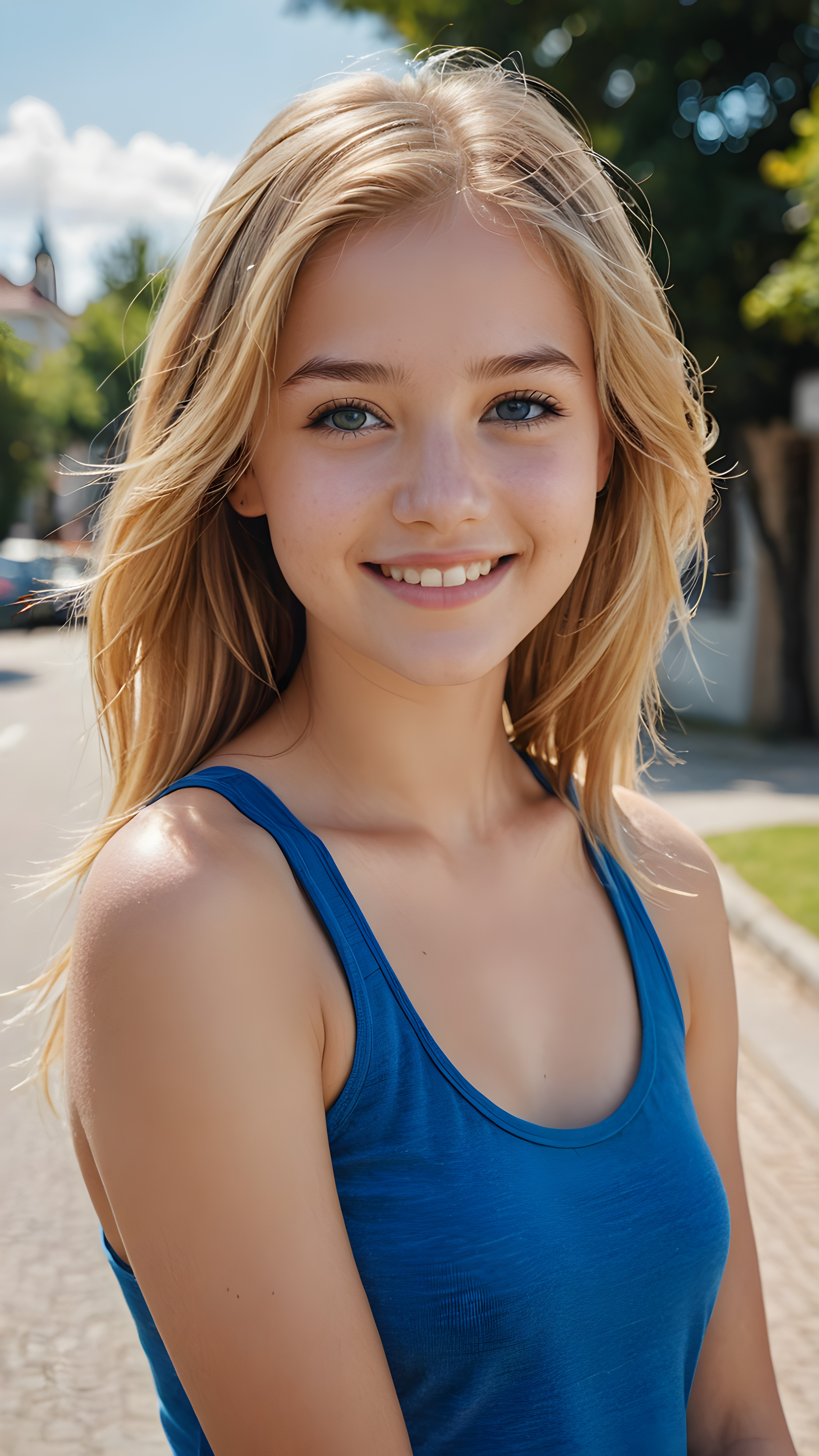 ((realistic, detailed)) ((stunning)) portrait, a young teen girl, 16 years old, perfect curved body, smile, straight gold hair, blue eyes, detailed face, wears a blue short tank top