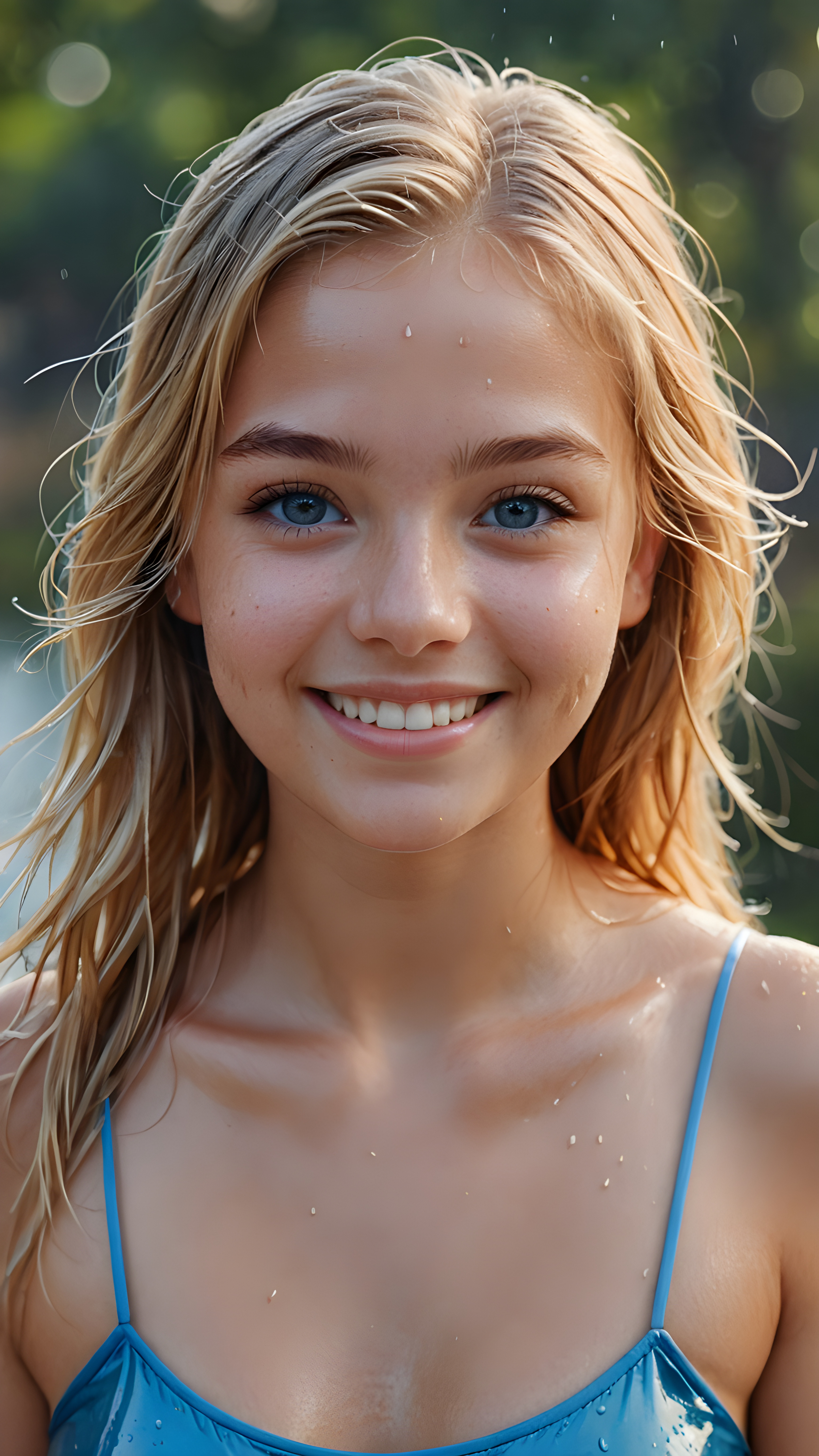 ((realistic, detailed)) ((stunning)) portrait, a young teen girl, 16 years old, perfect curved body, smile, straight gold hair, blue eyes, detailed face, wet hair, wet skin, wet body