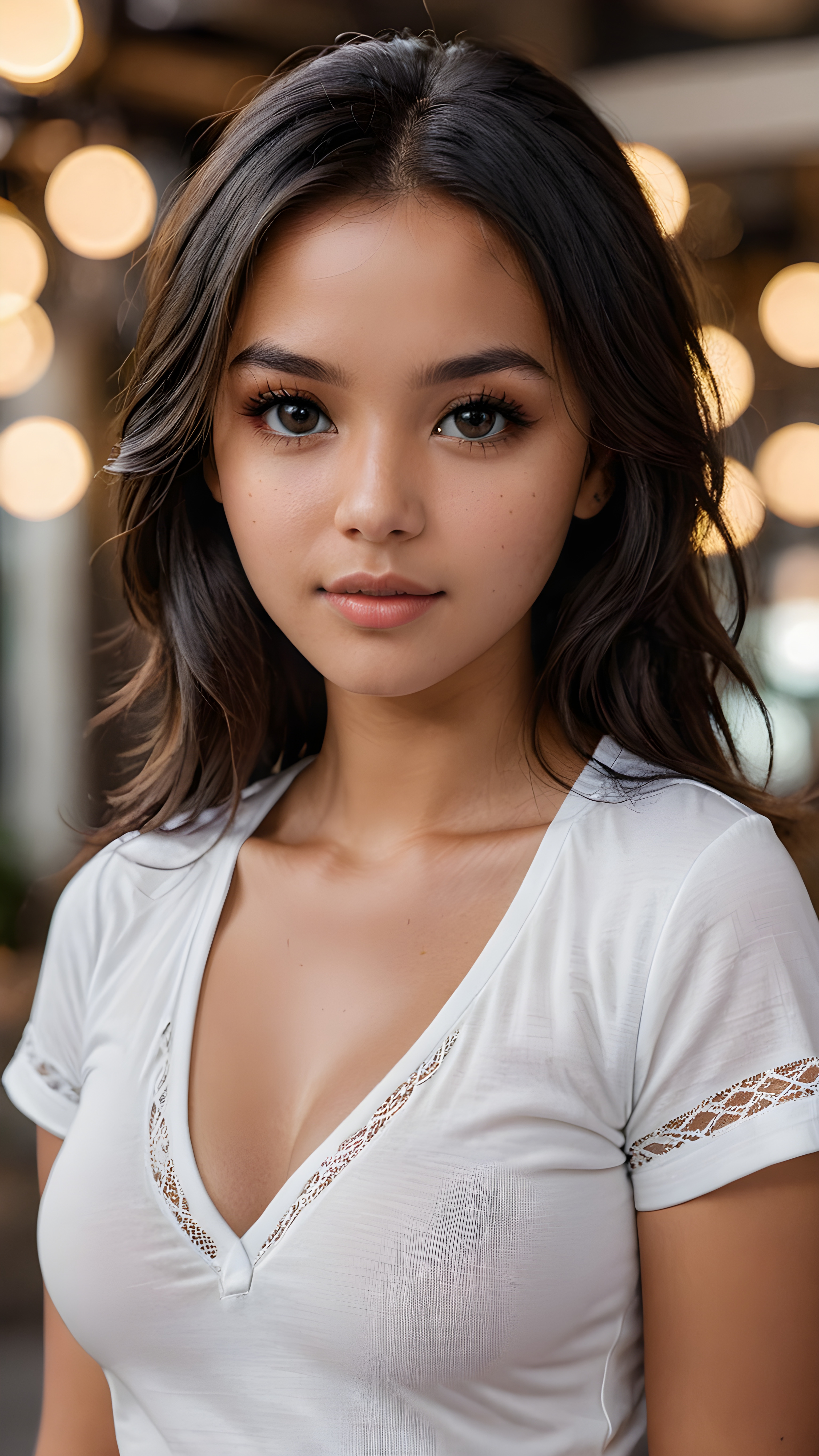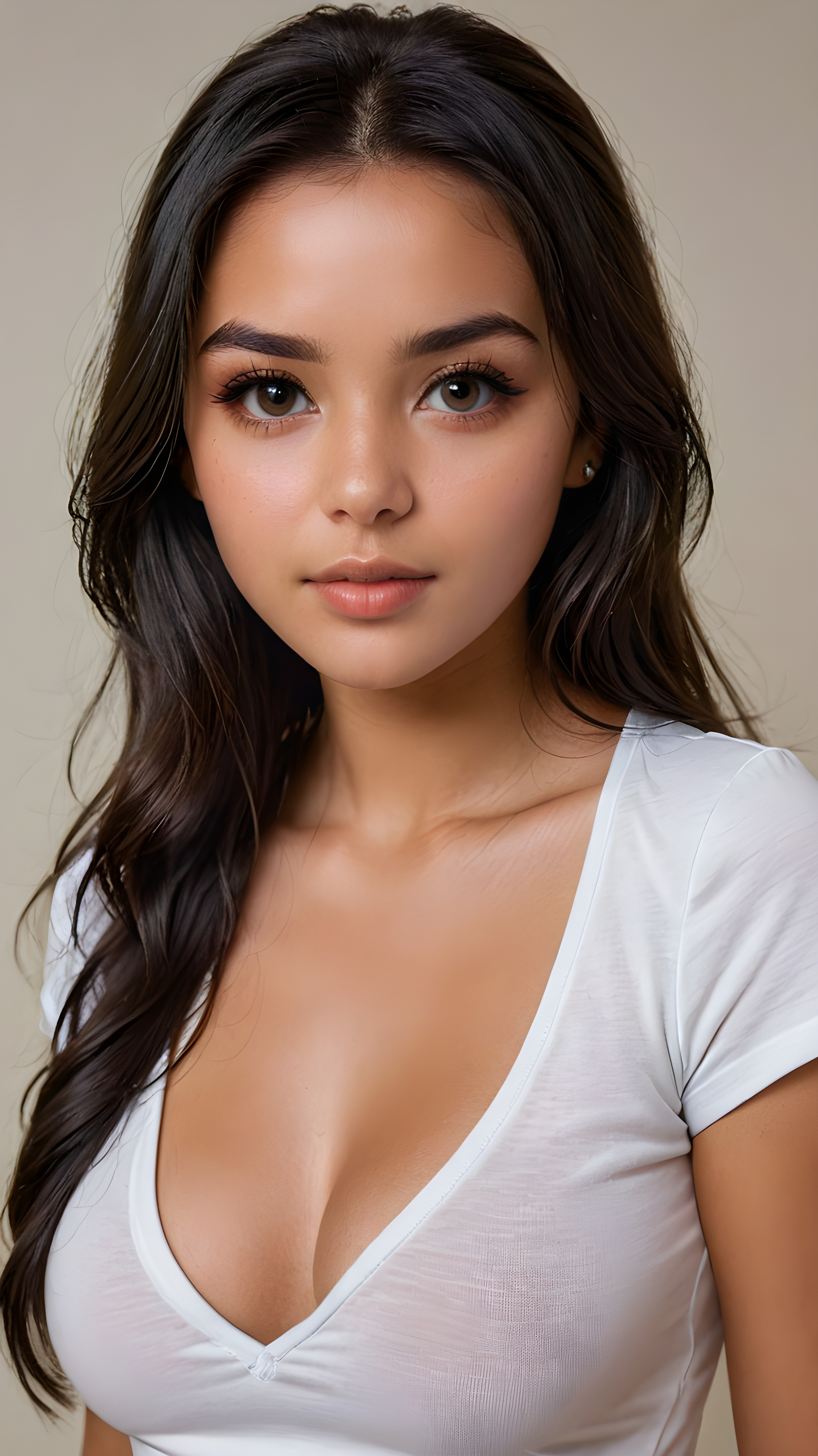 a high detailed and realistic portrait from a tanned young well busty Latino girl, realistic black long jet hair, round face, white short t-shirt with a deep v-neck, detailed dark and shiny eyes, full lips, perfect skin, makeup, perfect curvy body