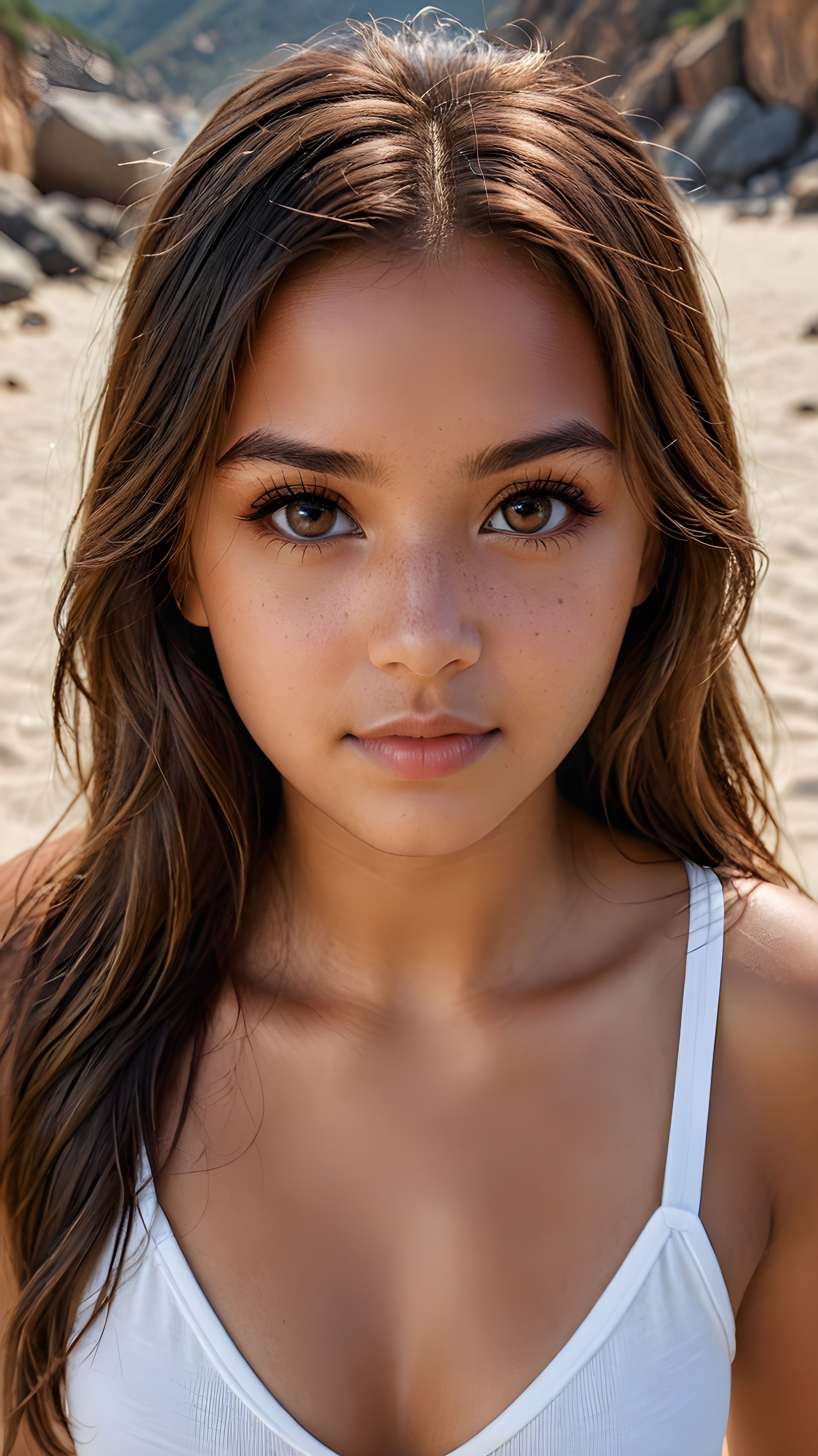 a high detailed and realistic portrait from a tanned young cute Indigenous girl, realistic gold-brown long jet hair, round face, ((white short cropped tank top with a deep v-neck)), detailed dark and shiny eyes, full lips, perfect skin, makeup, perfect curvy body, (((looking up at the camera, beach backdrop)))