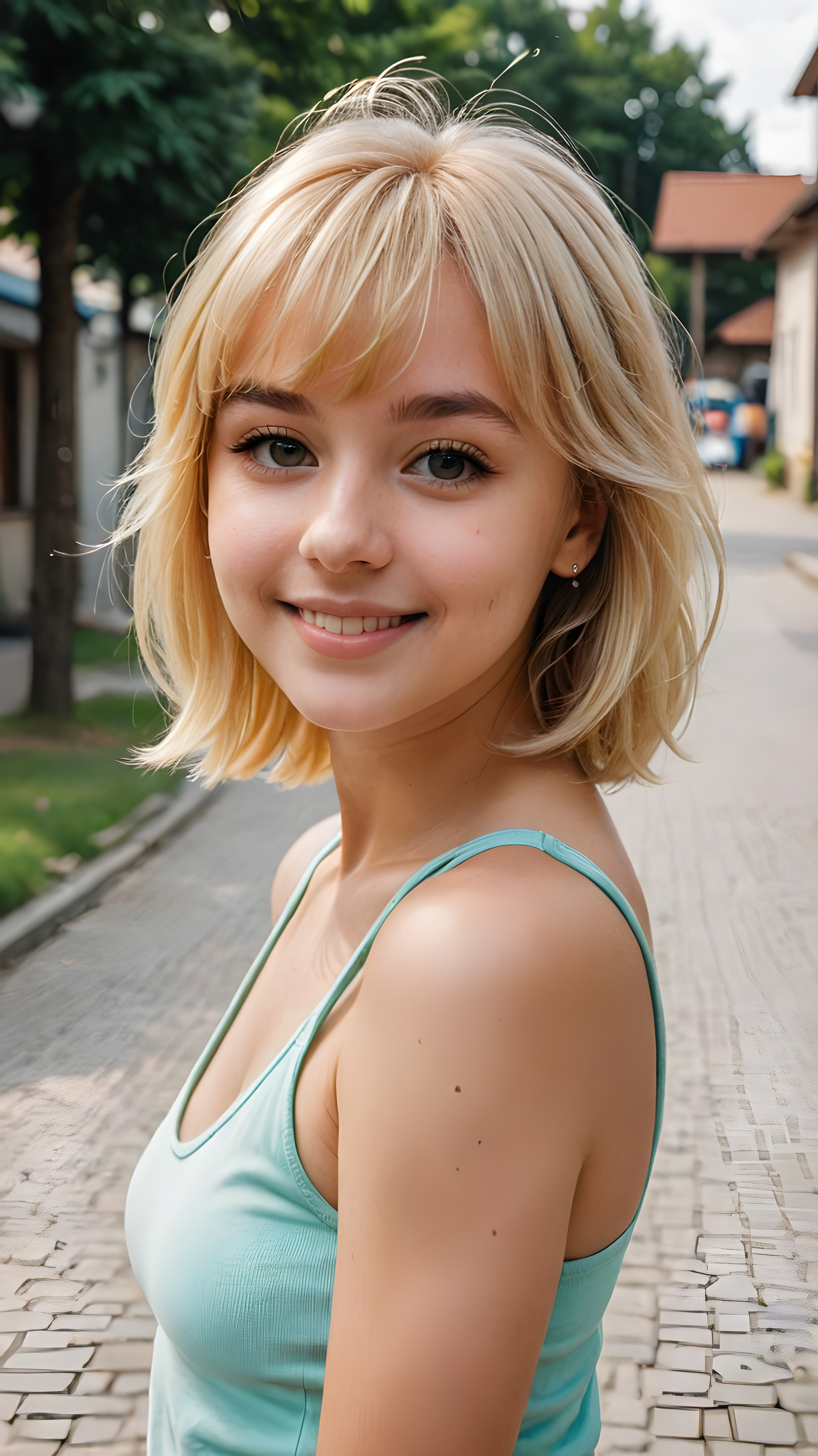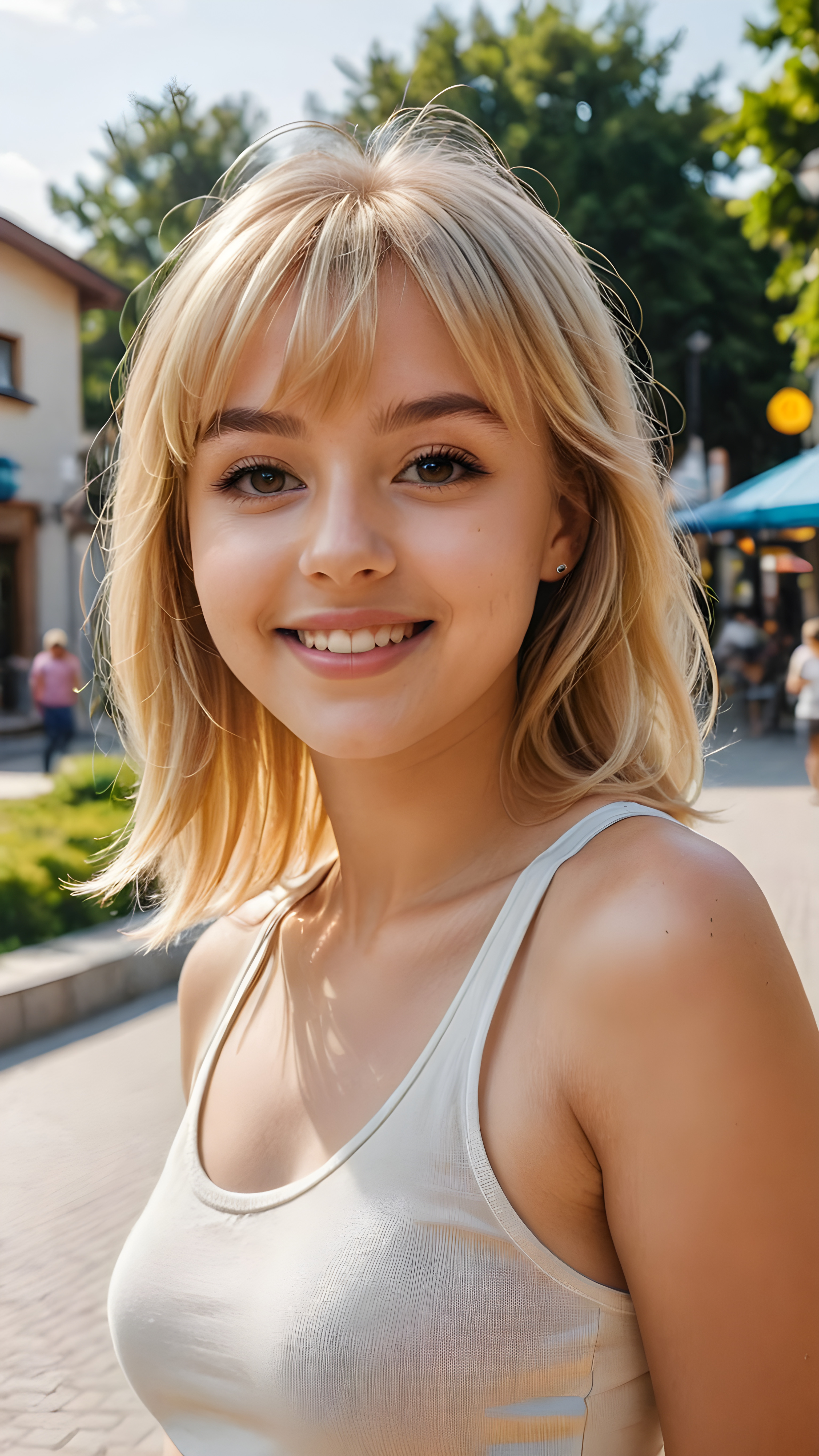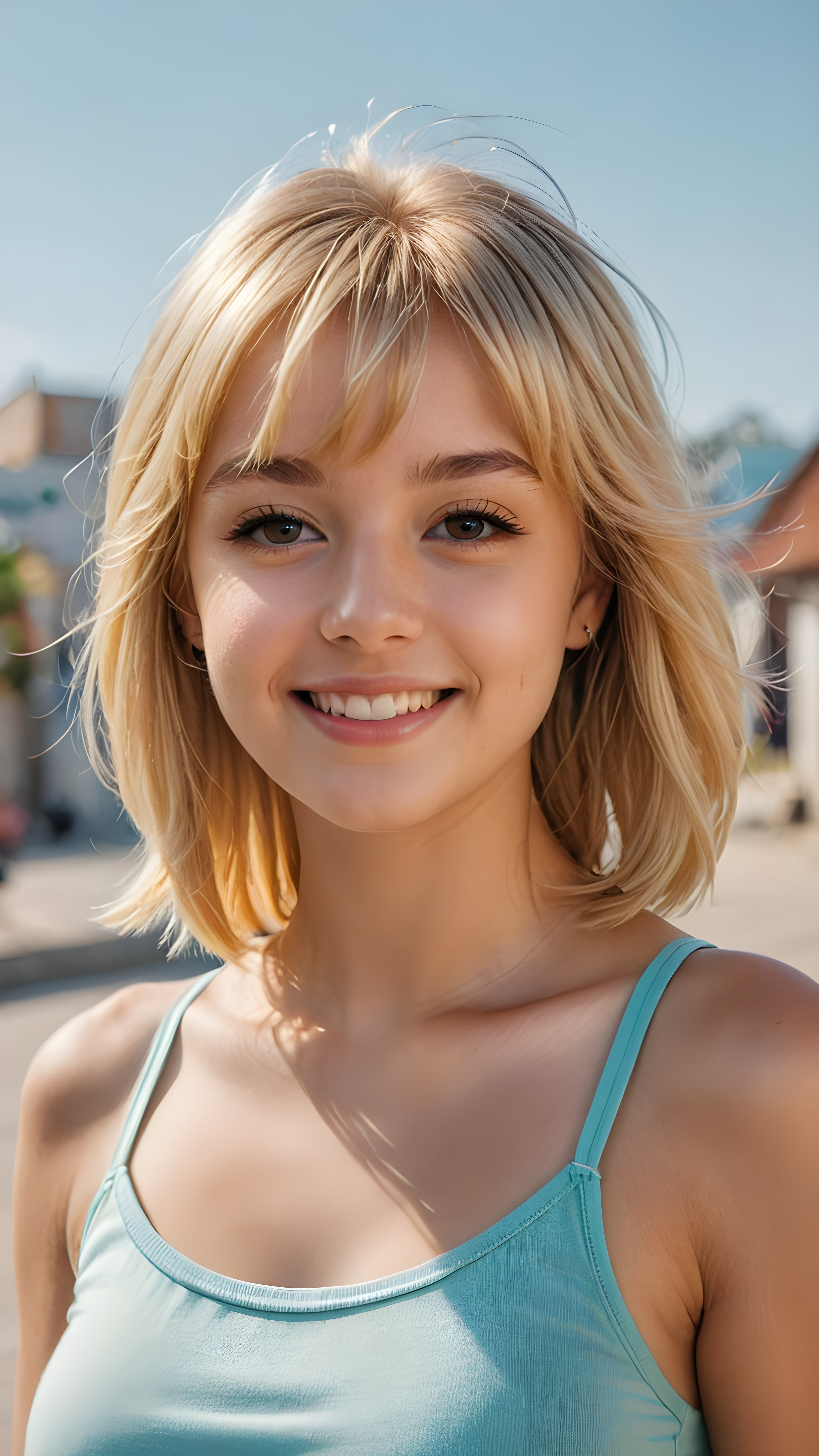 a (((young cute blond happy girl))), smile very happy, (wears a tank top), perfect curved body ((perfect portrait)), ((bangs cut, bob)) ((long straight smooth hair)) ((sunny backdrop))