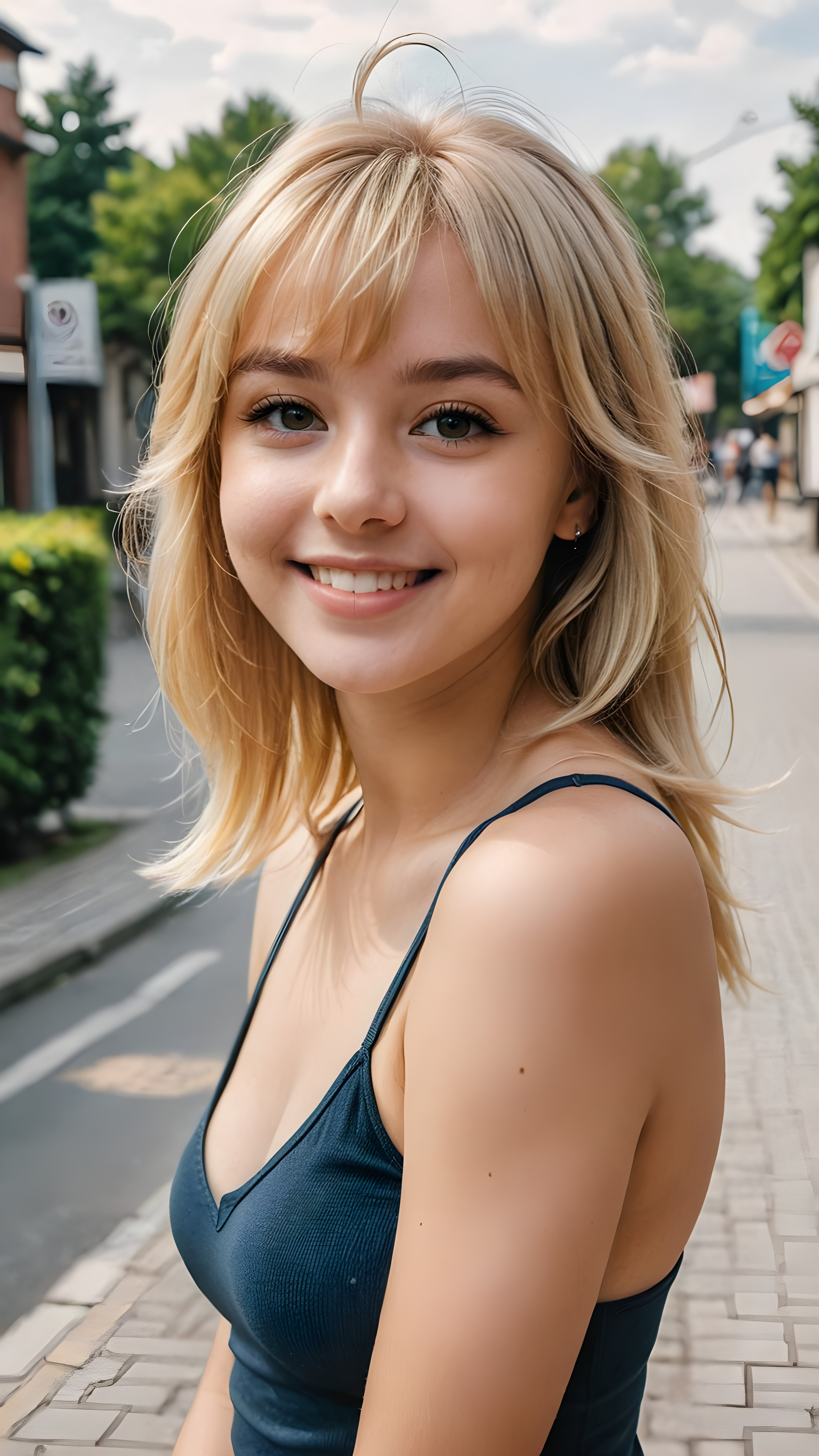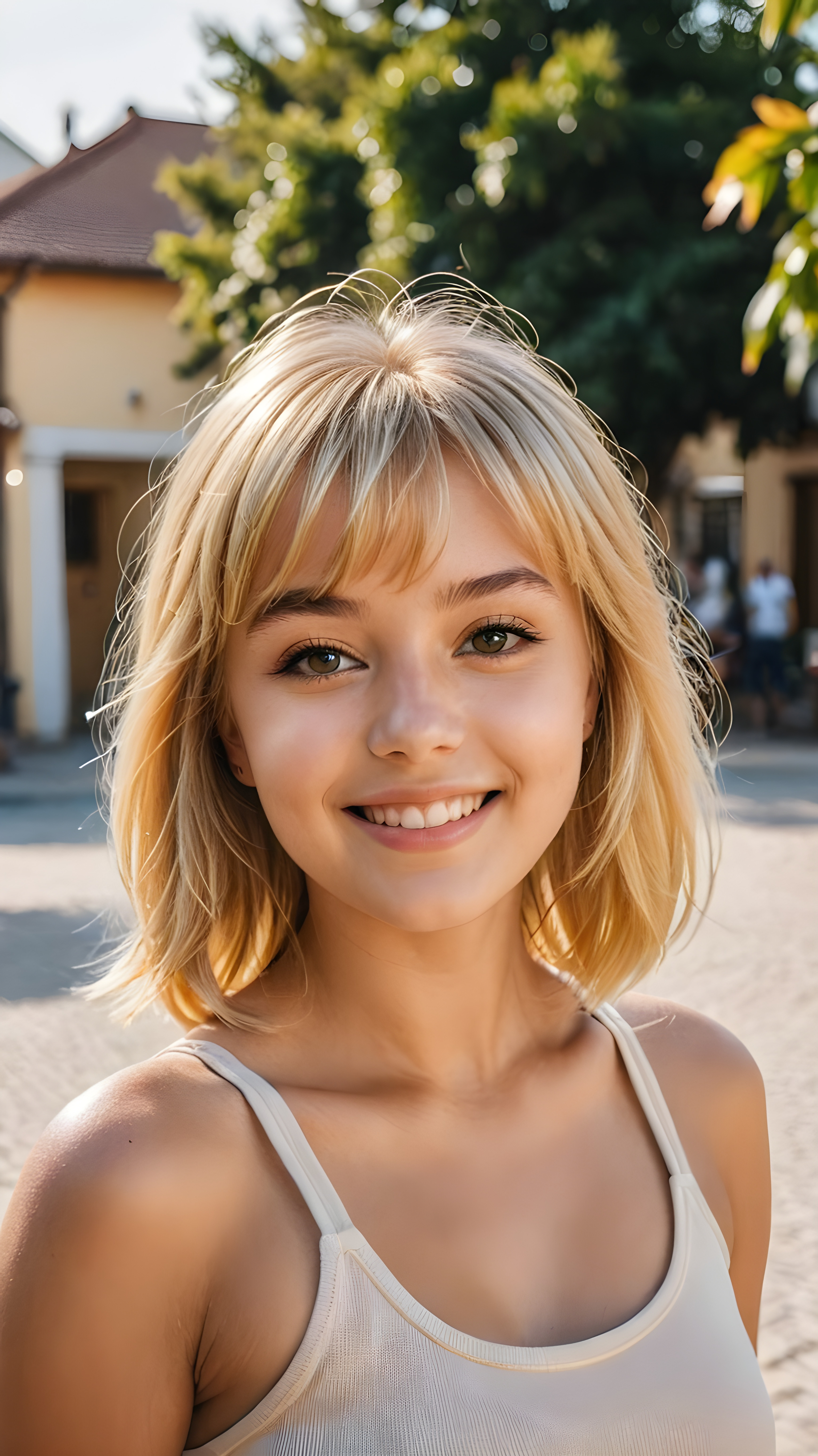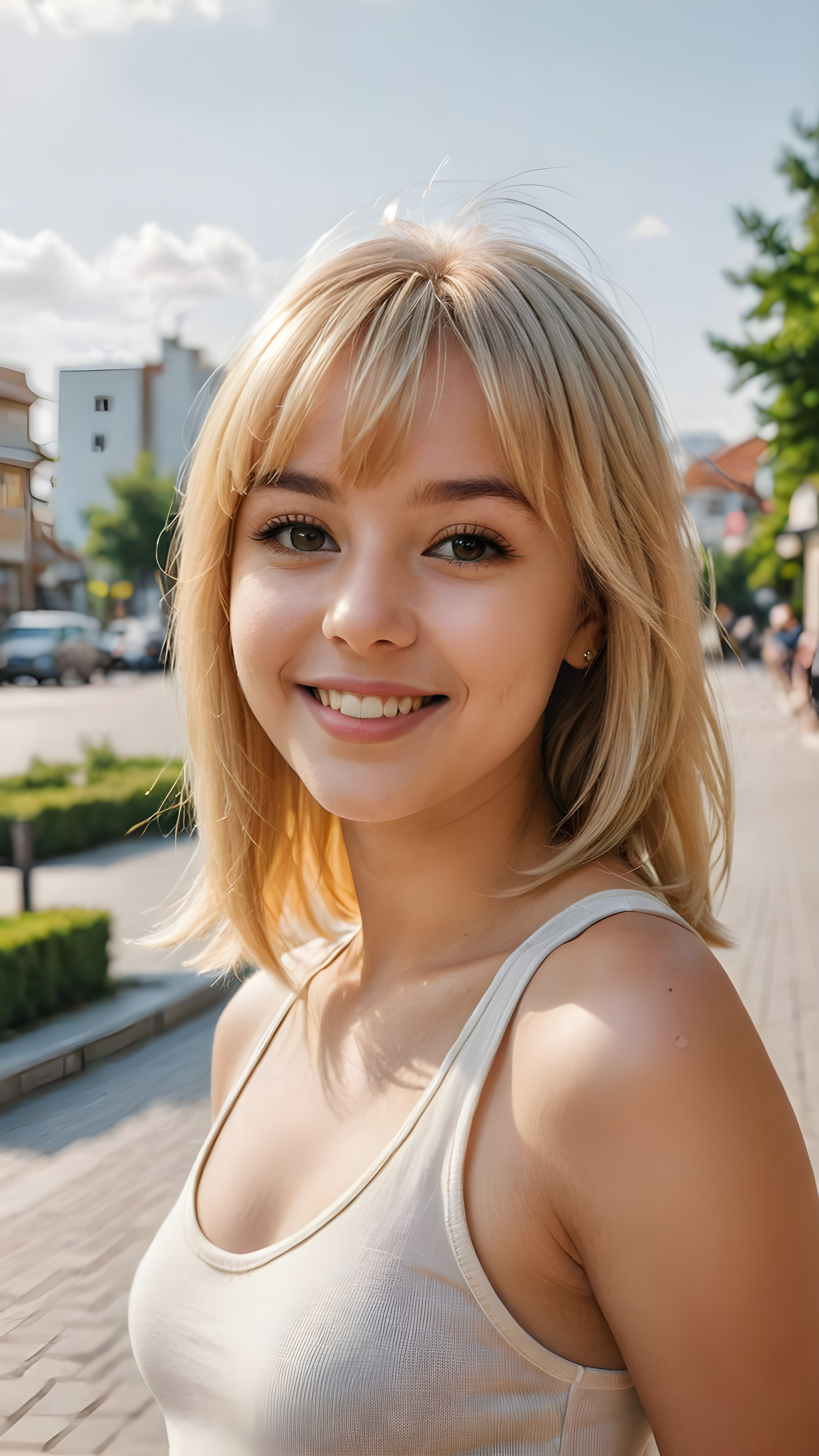 a (((young cute blond happy girl))), smile very happy, (wears a tank top), perfect curved body ((perfect portrait)), ((bangs cut, bob)) ((long straight smooth hair)) ((sunny backdrop))